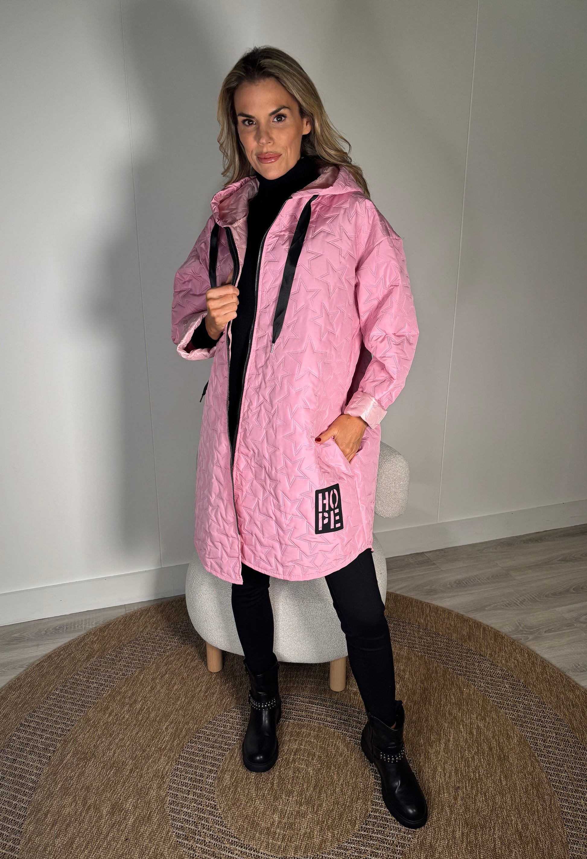 This longline quilted coat features a hood and zip-up front, finished with a star design quilting. Perfect for layering up this season!