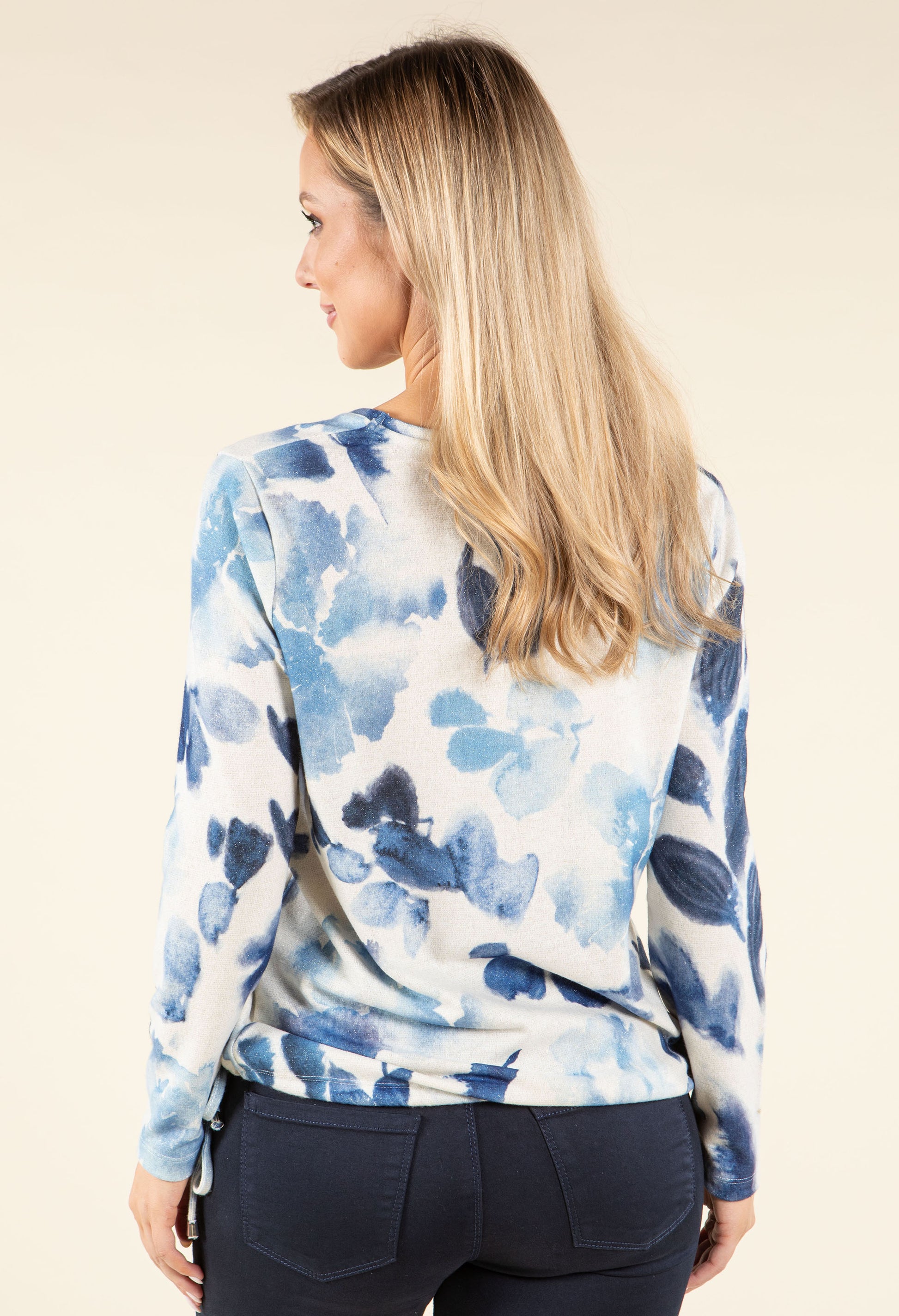 This refined knit top features long sleeves and a V-neckline with subtle sparkle detailing. The drawstring hemline enhances its silhouette, while the soft-touch fabric ensures exceptional comfort.