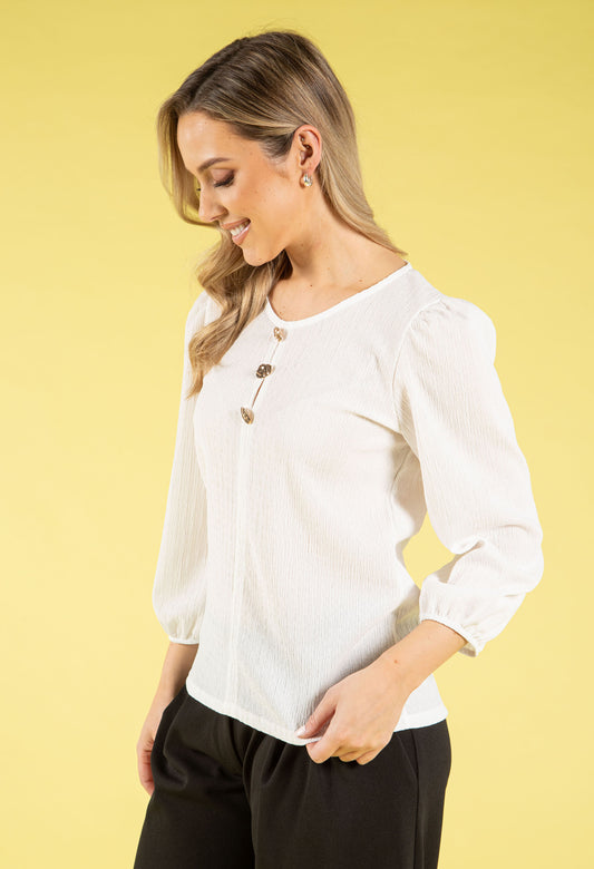 Gold Button Textured Touch Top in White