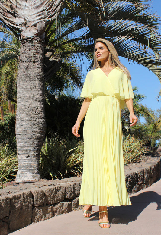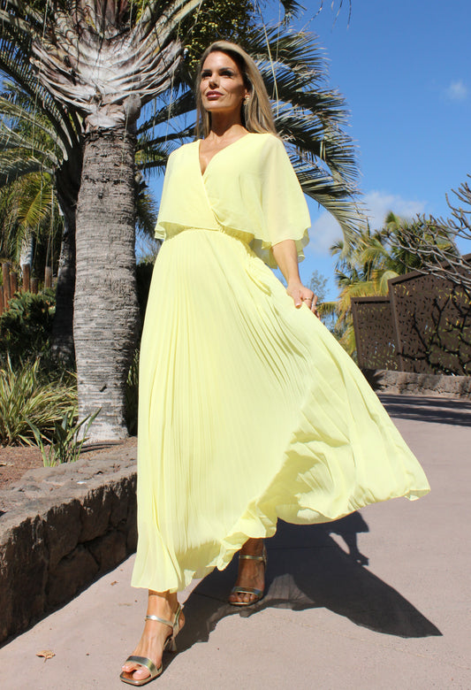 Plisse Pleated Wrap Midi Dress in Lemon