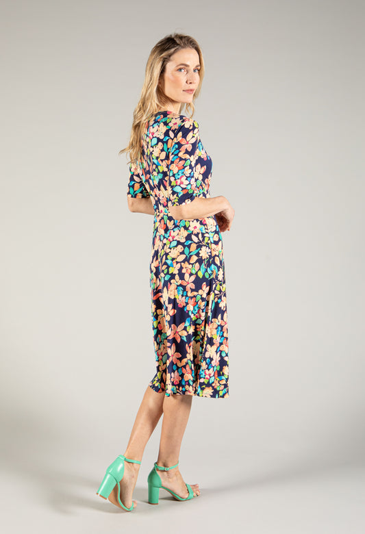 V-Neck Faux-Wrap Midi Dress in Pink Mix