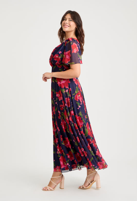 Isabelle Curve+ Angel Sleeve Maxi Dress in navy red pink