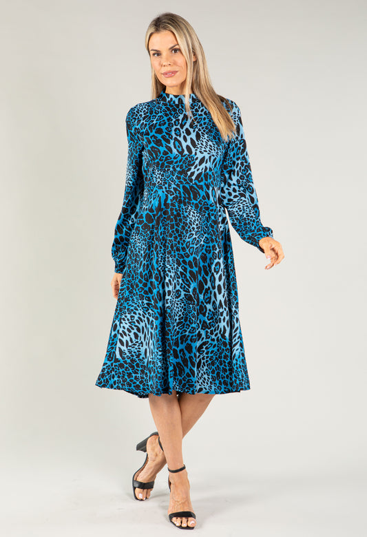 Blue Mix Leaf Print Dress in Blue