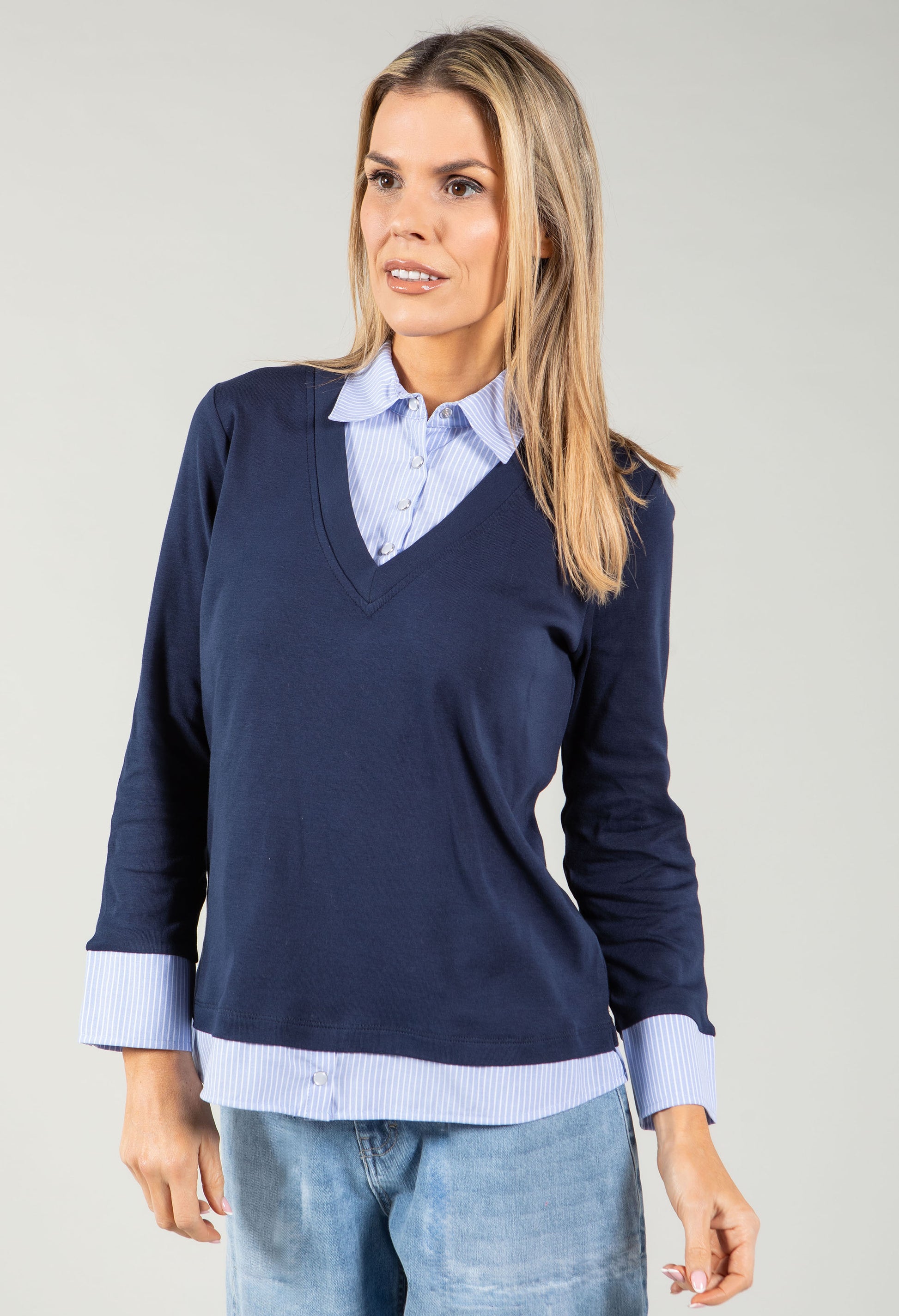 The 2 in 1 Shirt Top combines the elegance of a shirt and the comfort of a top, featuring mother of pearl buttons, a classic collar, and a flattering V-neckline. Made from ribbed cotton, it offers long sleeves and a versatile, stylish look.