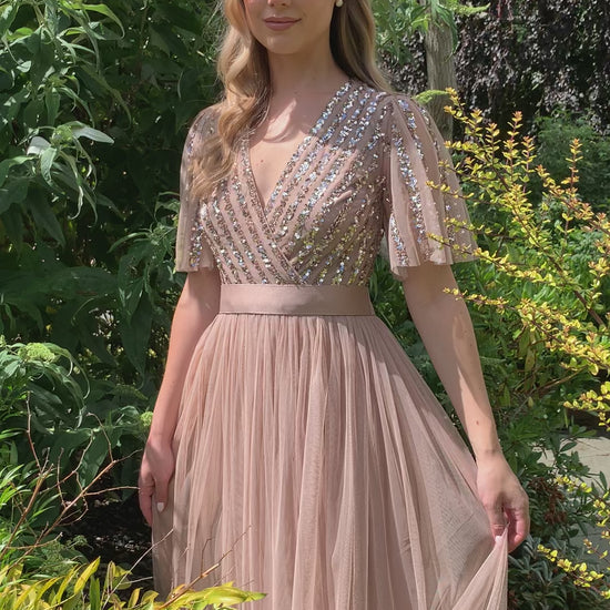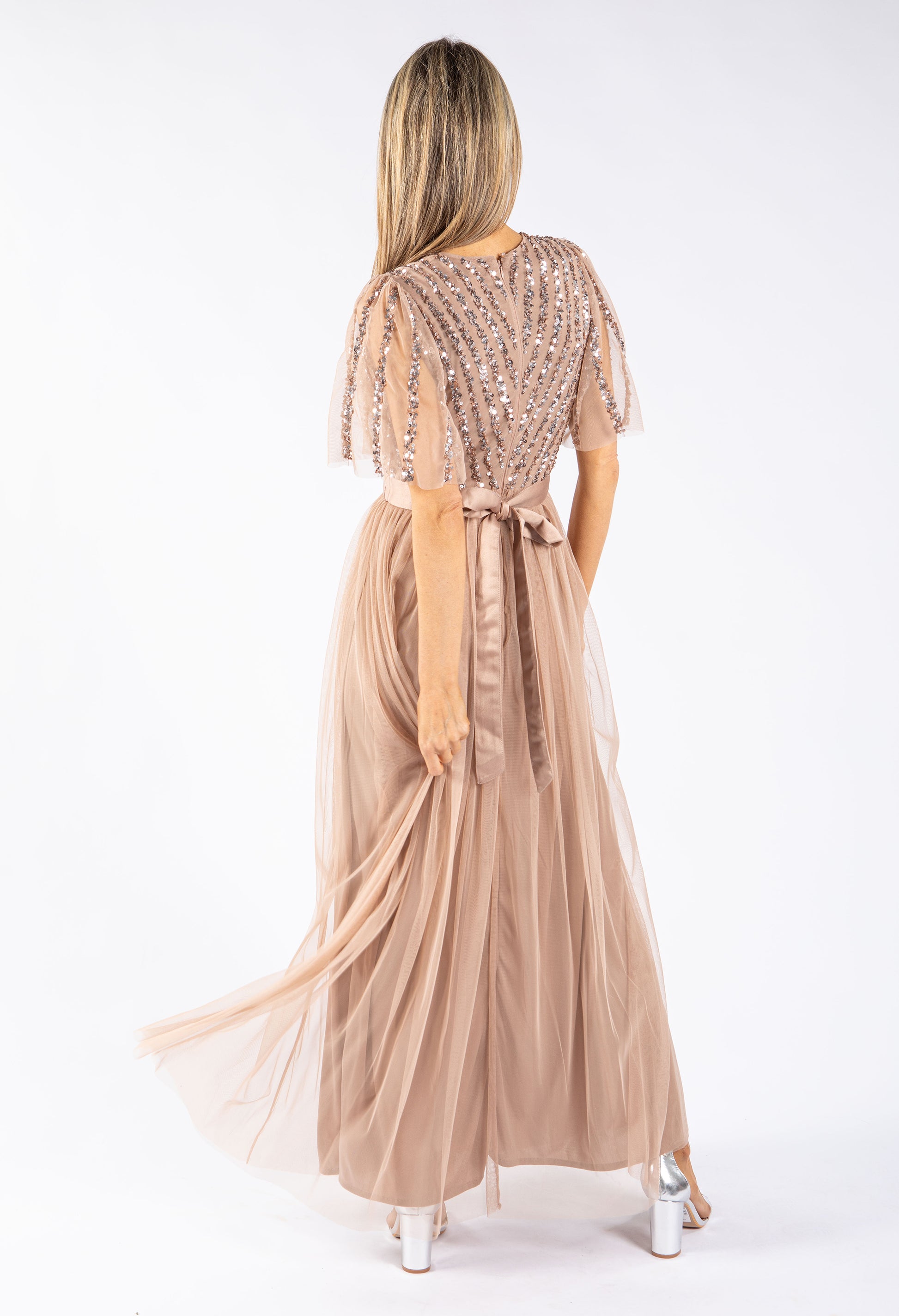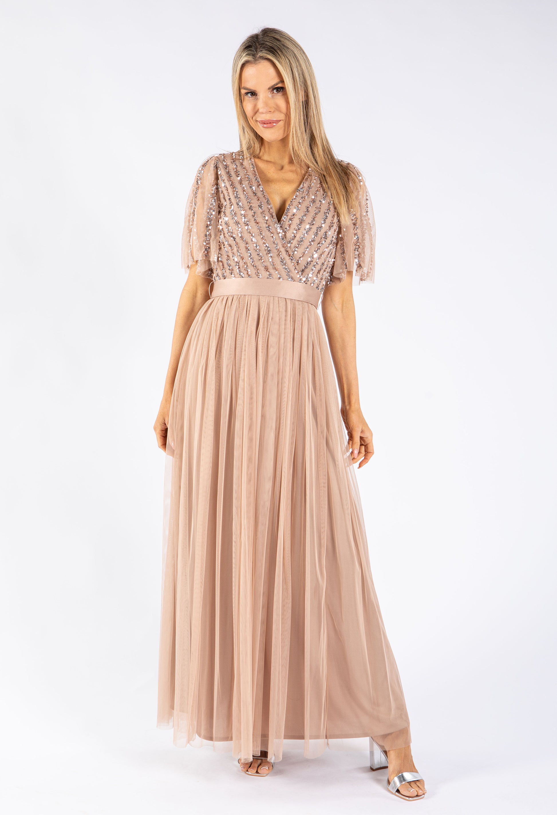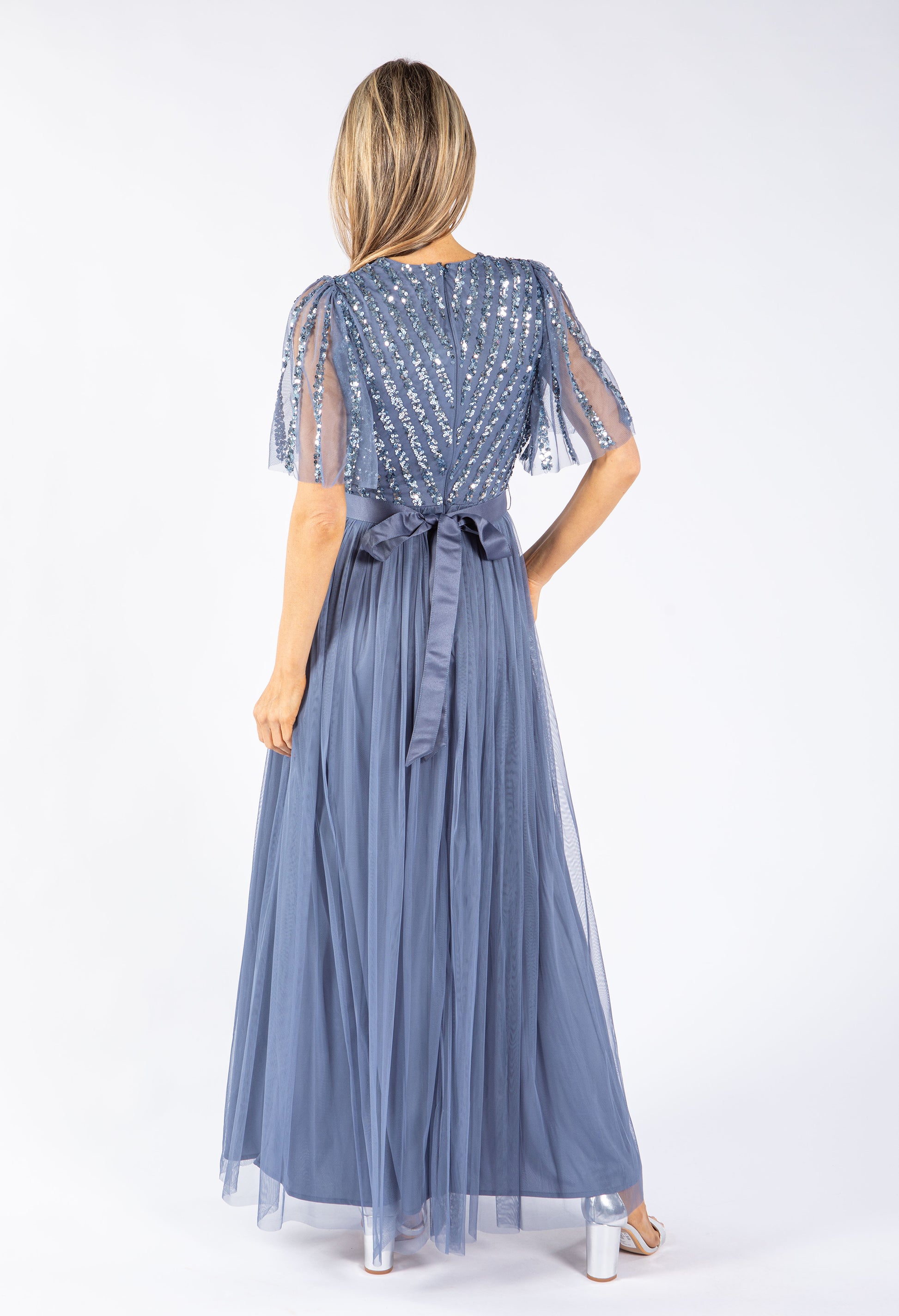With an elegant twist on the most popular style of our Maxi dresses this shade works perfectly with the stripy sequin embellishment that follows the V neckline and delicate sheer angel sleeves. Delicate tulle overlay gathered at the waist creates a free-flowing shape perfect for a dancing queen. To make the look complete a removable satin waist band can be tied in a lovely bow at the front or back for that little extra detail.