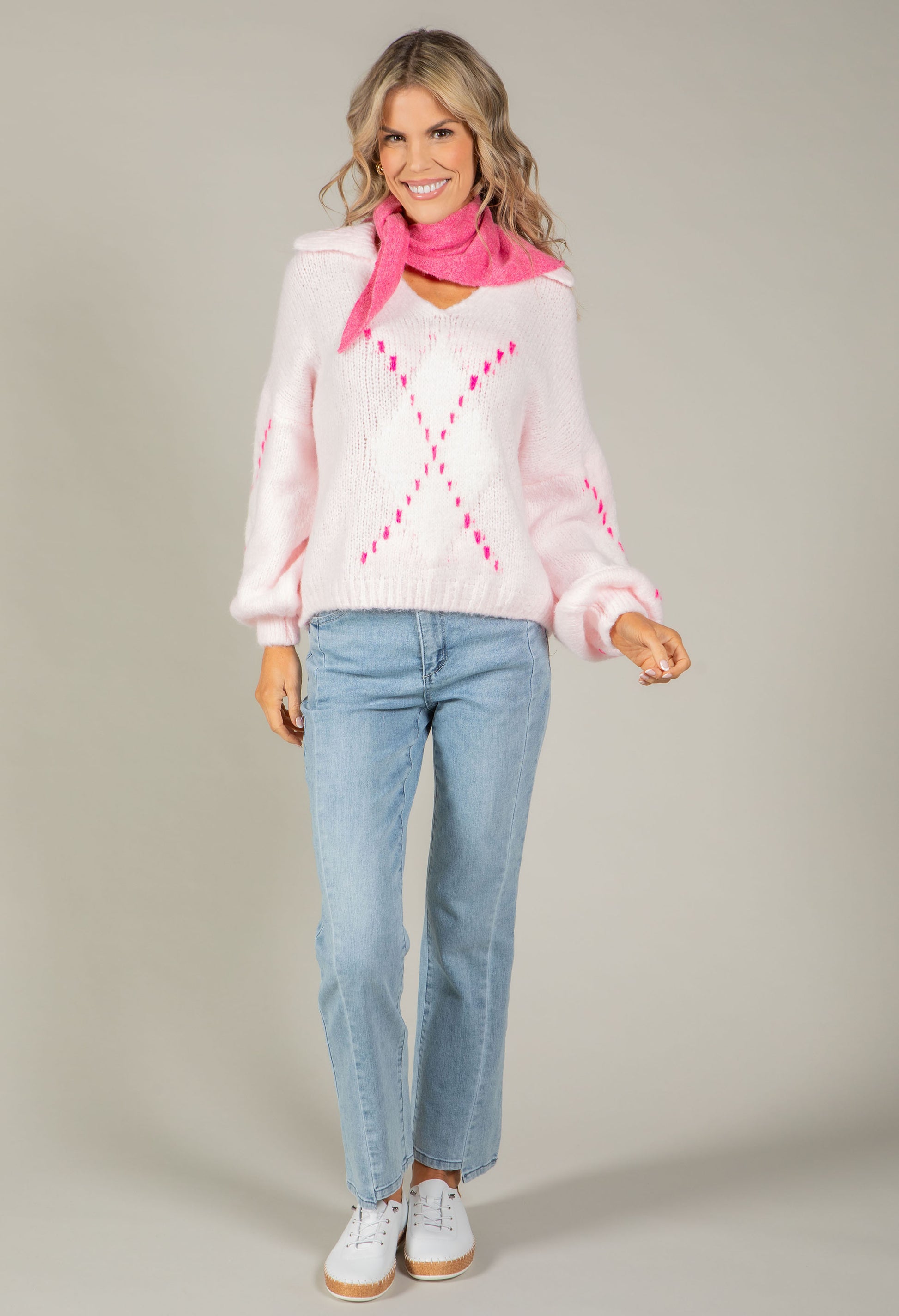 Elevate your everyday wardrobe with this charming argyle knit jumper. The classic V-neckline and collar create a refined look, while long sleeves with ribbed cuffs offer practical warmth. Finished with ribbed detailing at the hem for a polished appearance, this piece features a soft, touchable knit in a relaxed fit that's perfect for layering or wearing solo. Timeless style that never goes out of fashion.