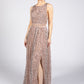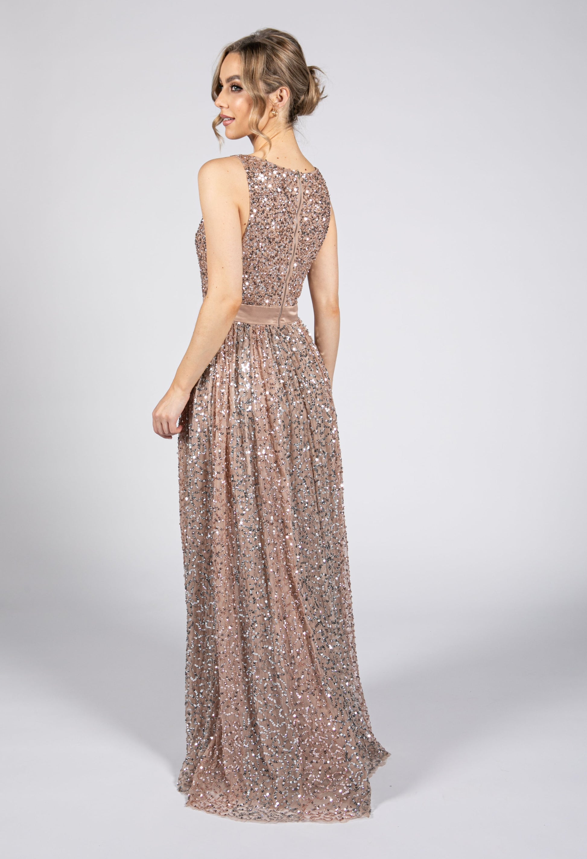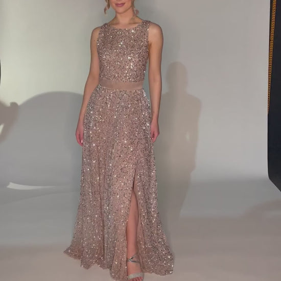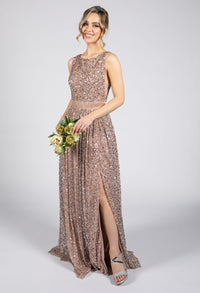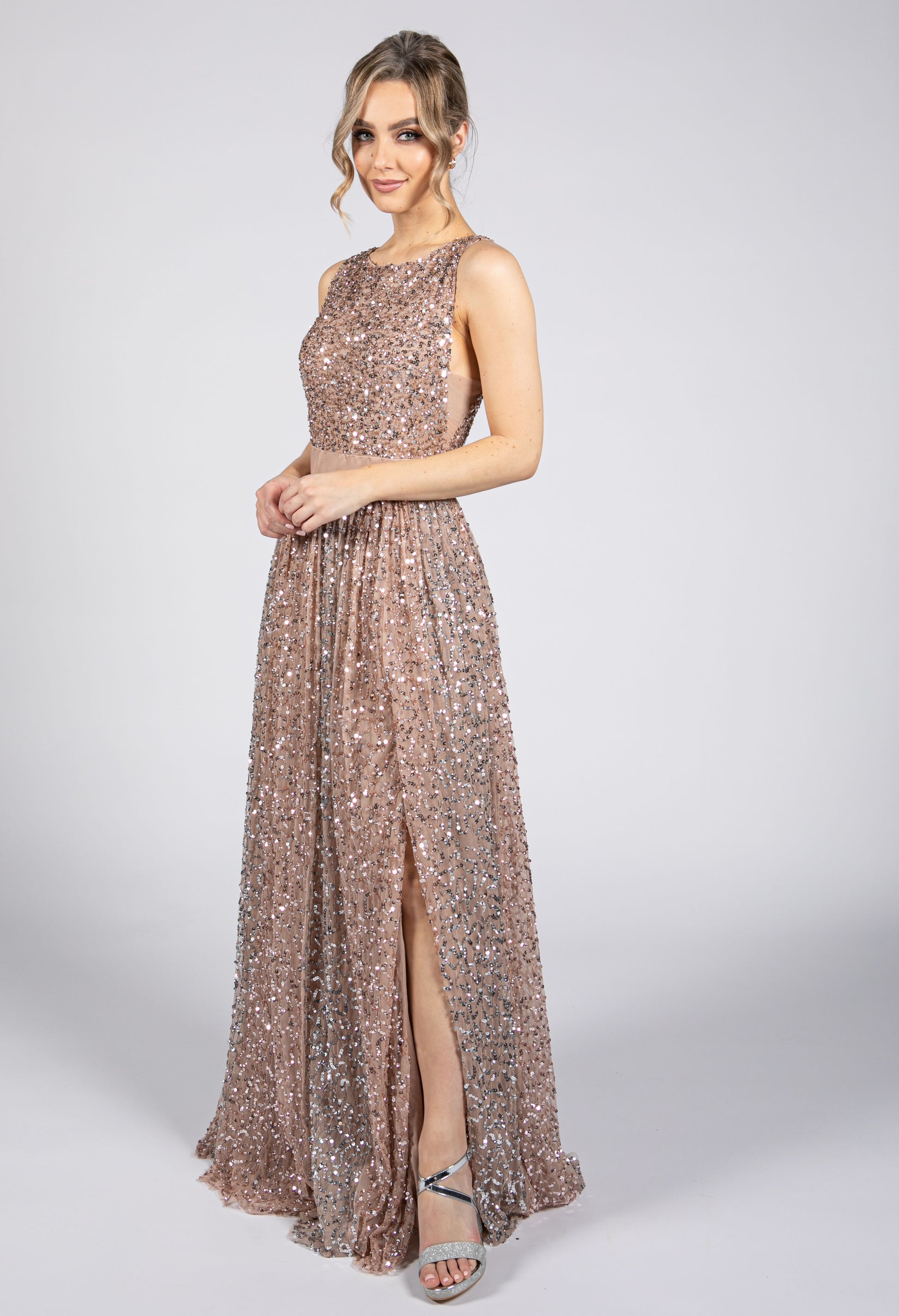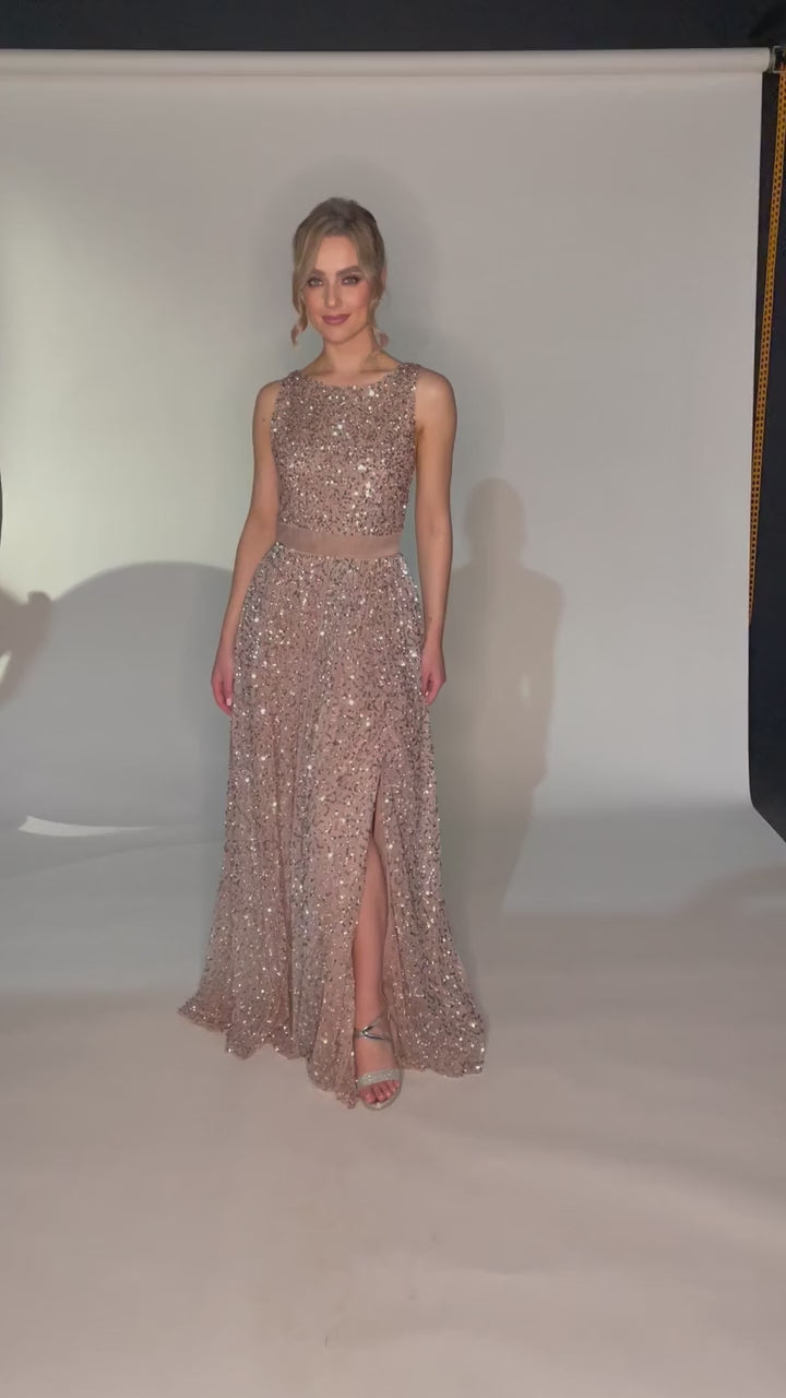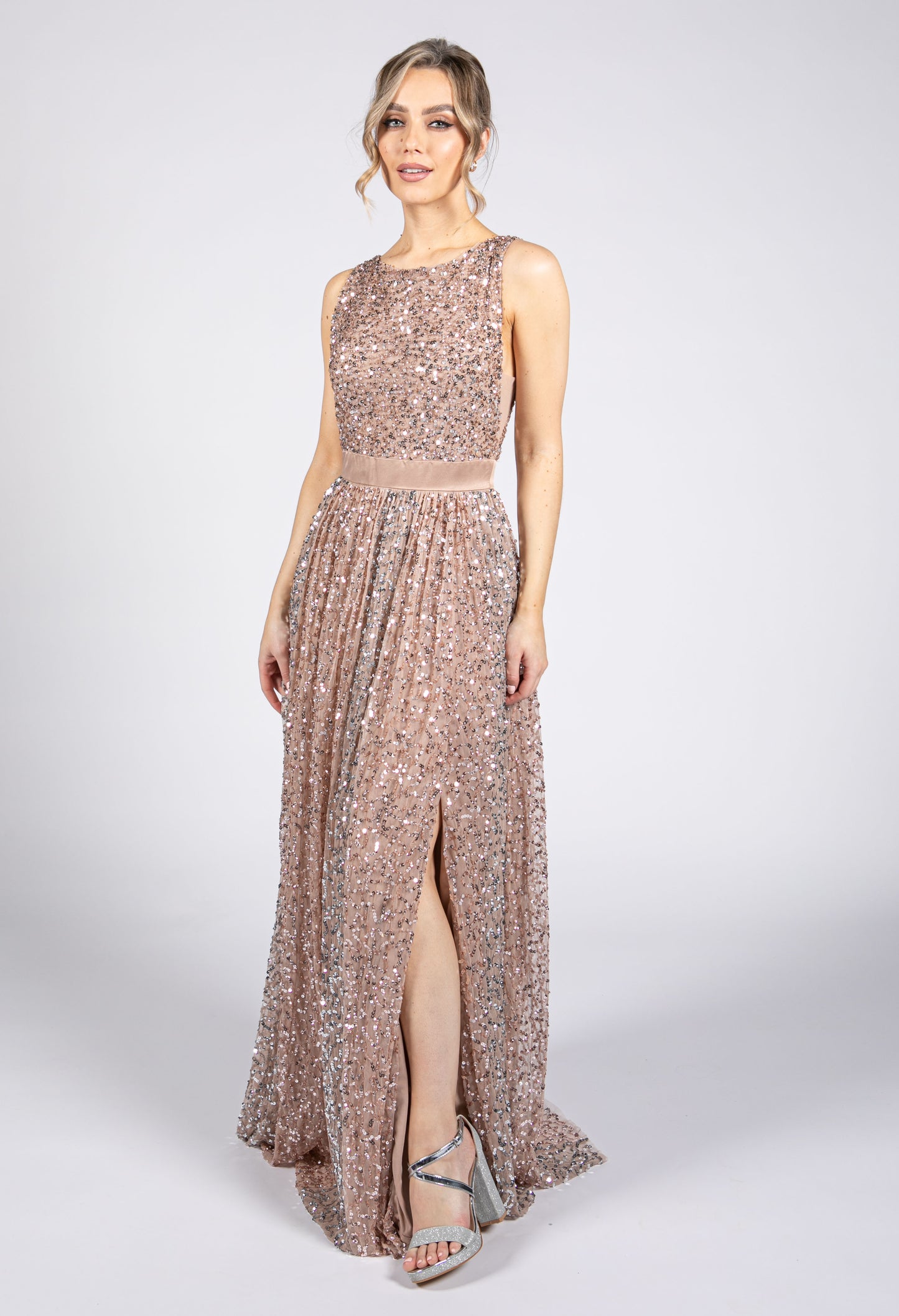 Maya Full Length Blush All Over Sequin Dress with Waistband and Leg Slit
