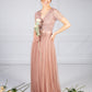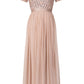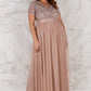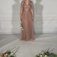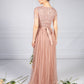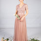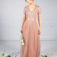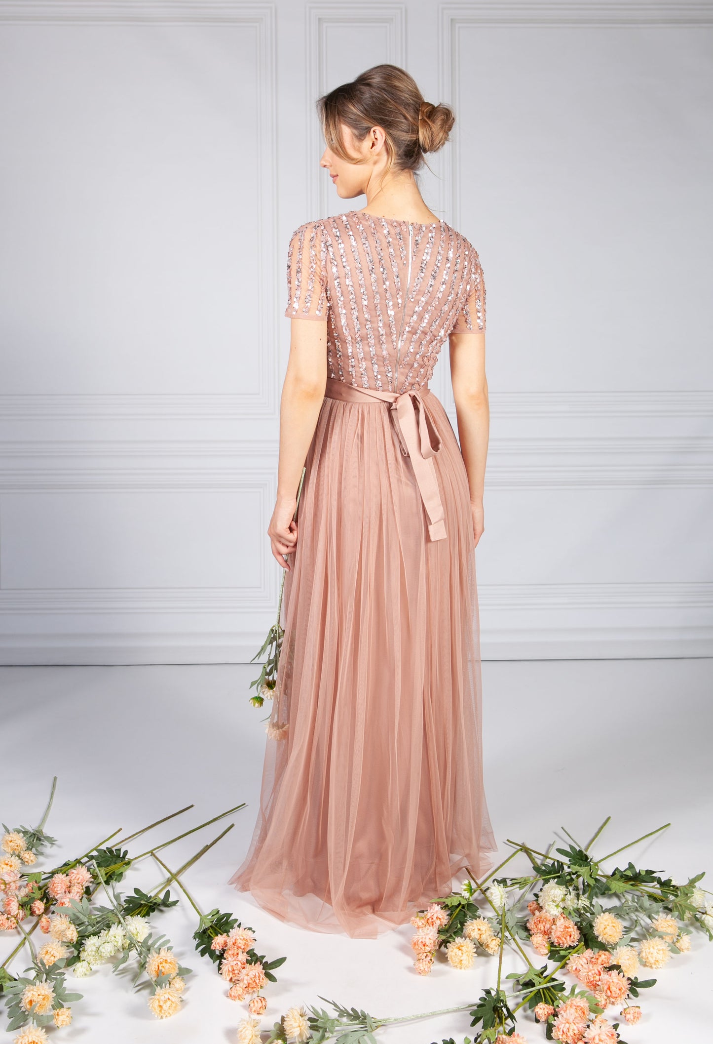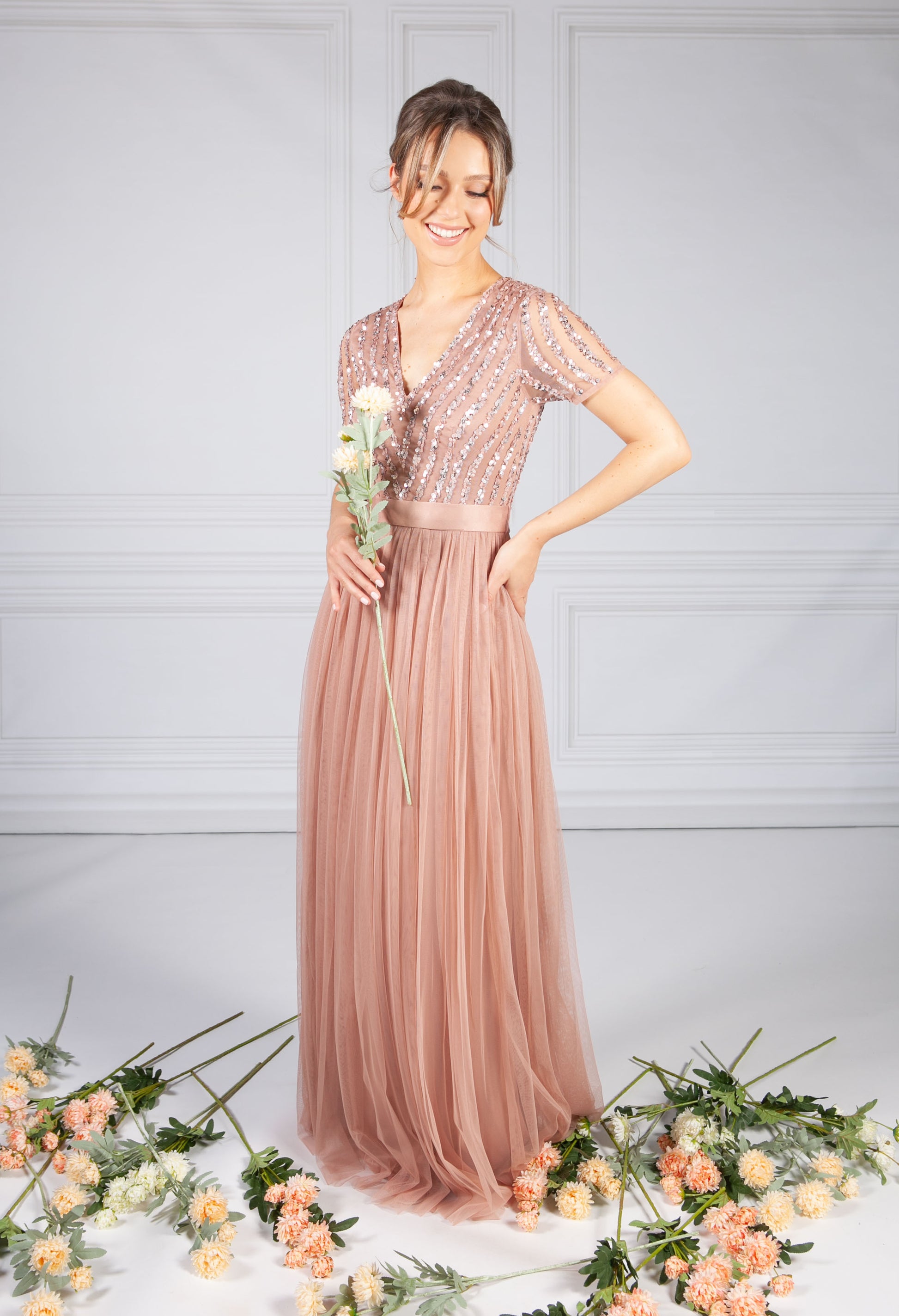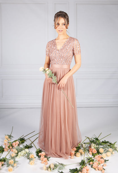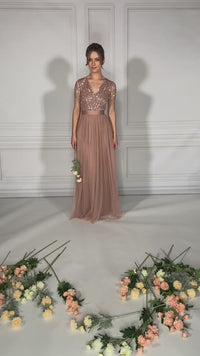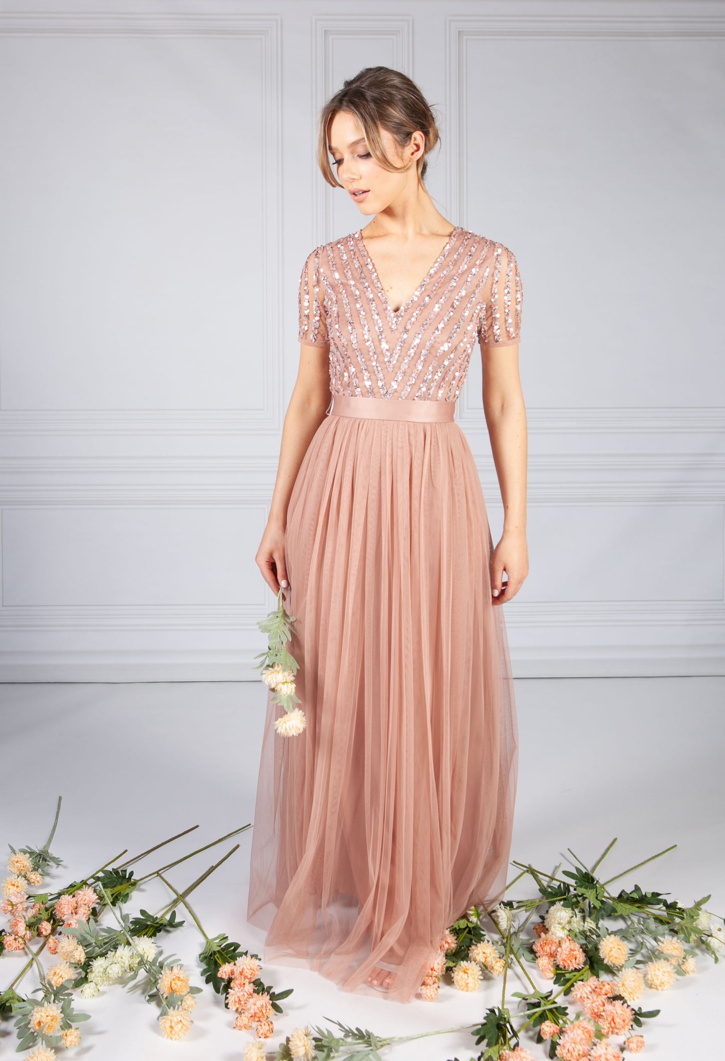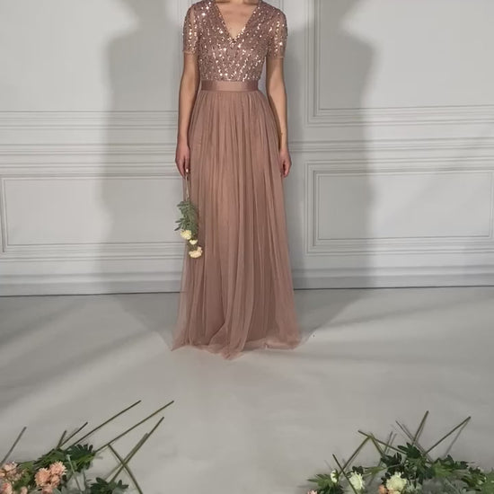 Maya Blush v-neck full length tulle skirt dress with delicate sequins top and satin belt.