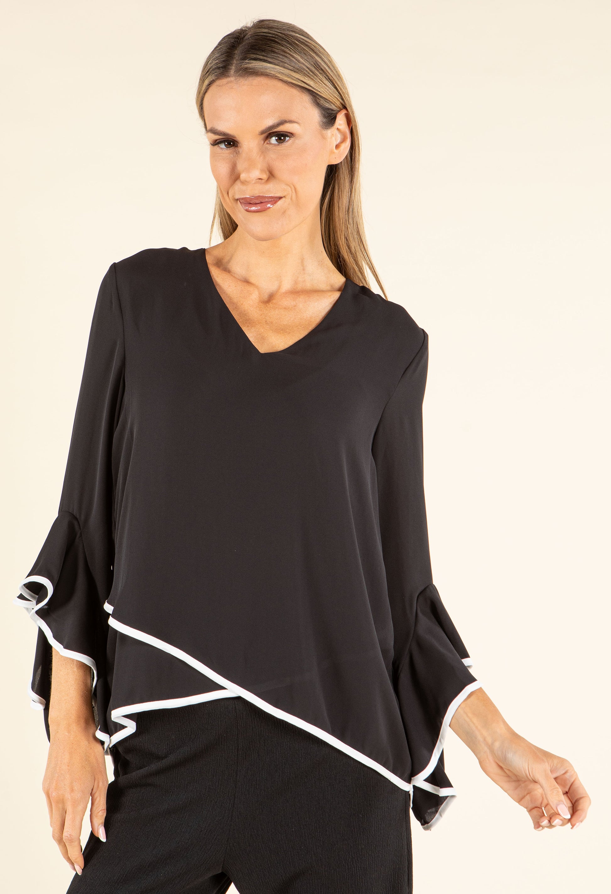 This blouse combines a flattering V-neckline with 3/4 length flared sleeves, a rounded hemline, and a flowy silhouette, all highlighted by striking contrast trim accents for added style.