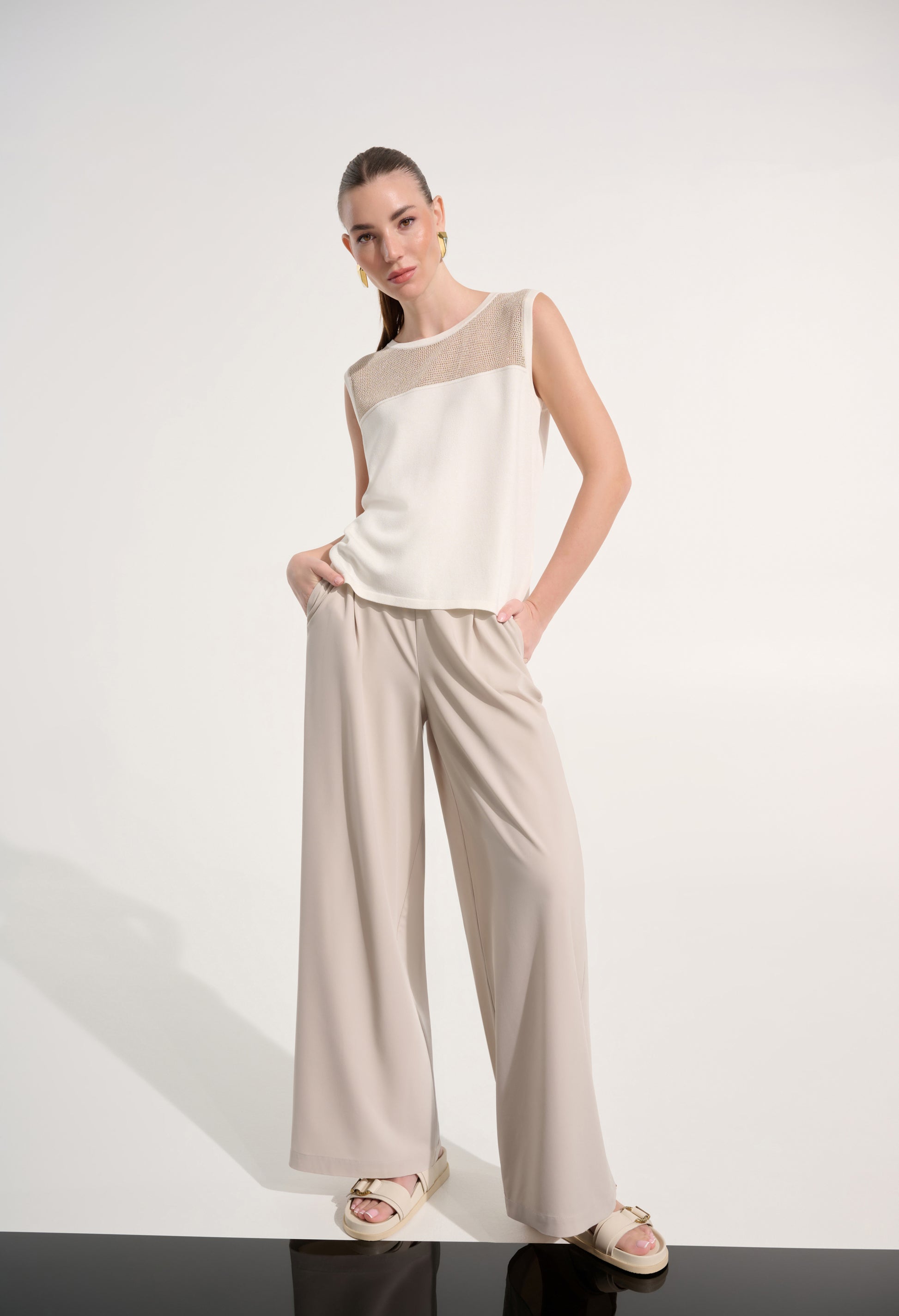 Experience effortless style with Joseph Ribkoff's pullover. This chic, sleeveless top features a crew neck and hip-length design, perfect for casual, summer, and office settings. The minimalistic yet embellished mesh fabric offers a regular fit, ensuring comfort without compromising on elegance. Ideal for those who appreciate a plain pattern with a touch of sophistication.