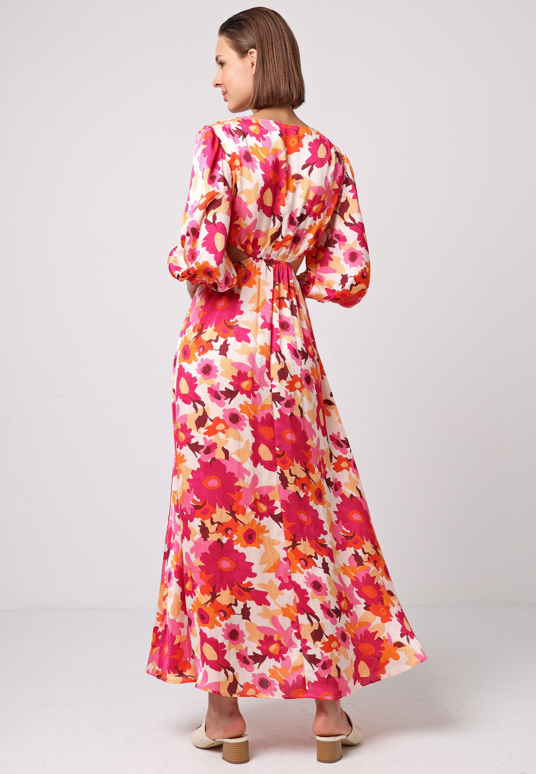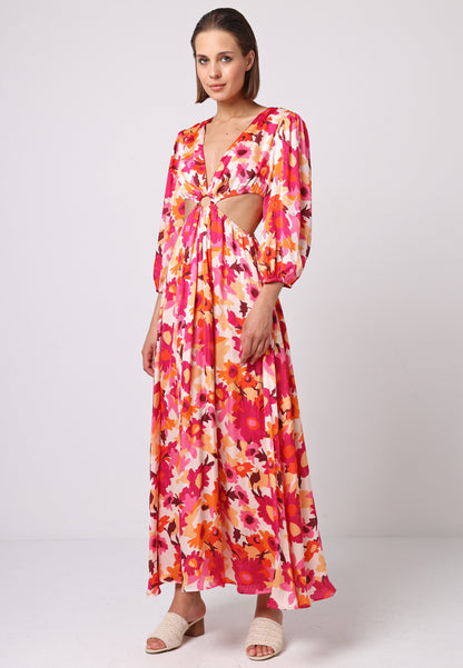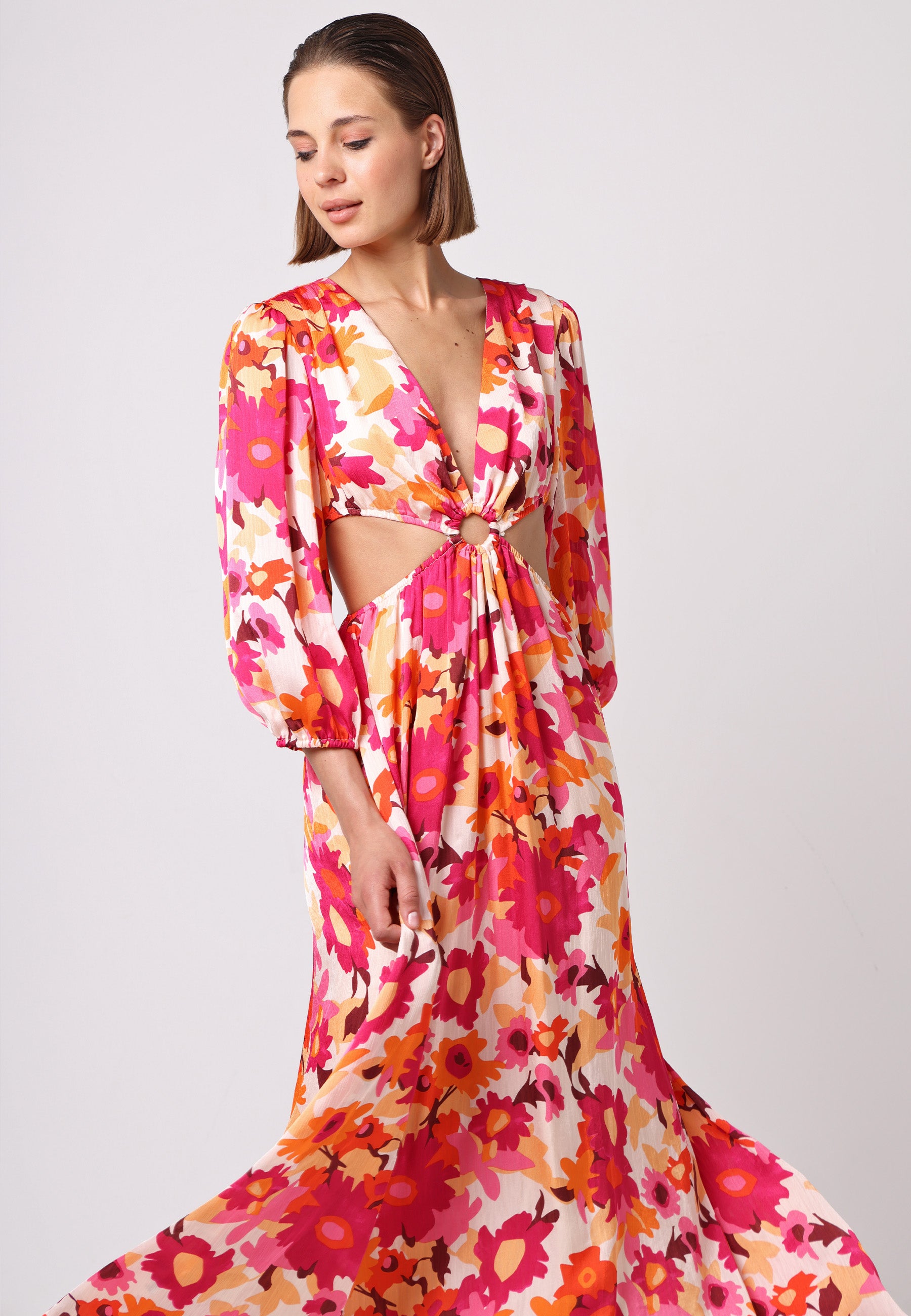 This romantic style is perfect for cocktail parties, sunny getaways and even weddings. The skin-baring side cut-out detailed is a flirty touch. Long sleeves and maxi, a-line skirt for comfort. A pink orange hybrid floral print is sweet for summer. Style yours with strappy heels and clutch for formal occasions and sandals for holidays.