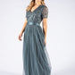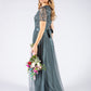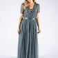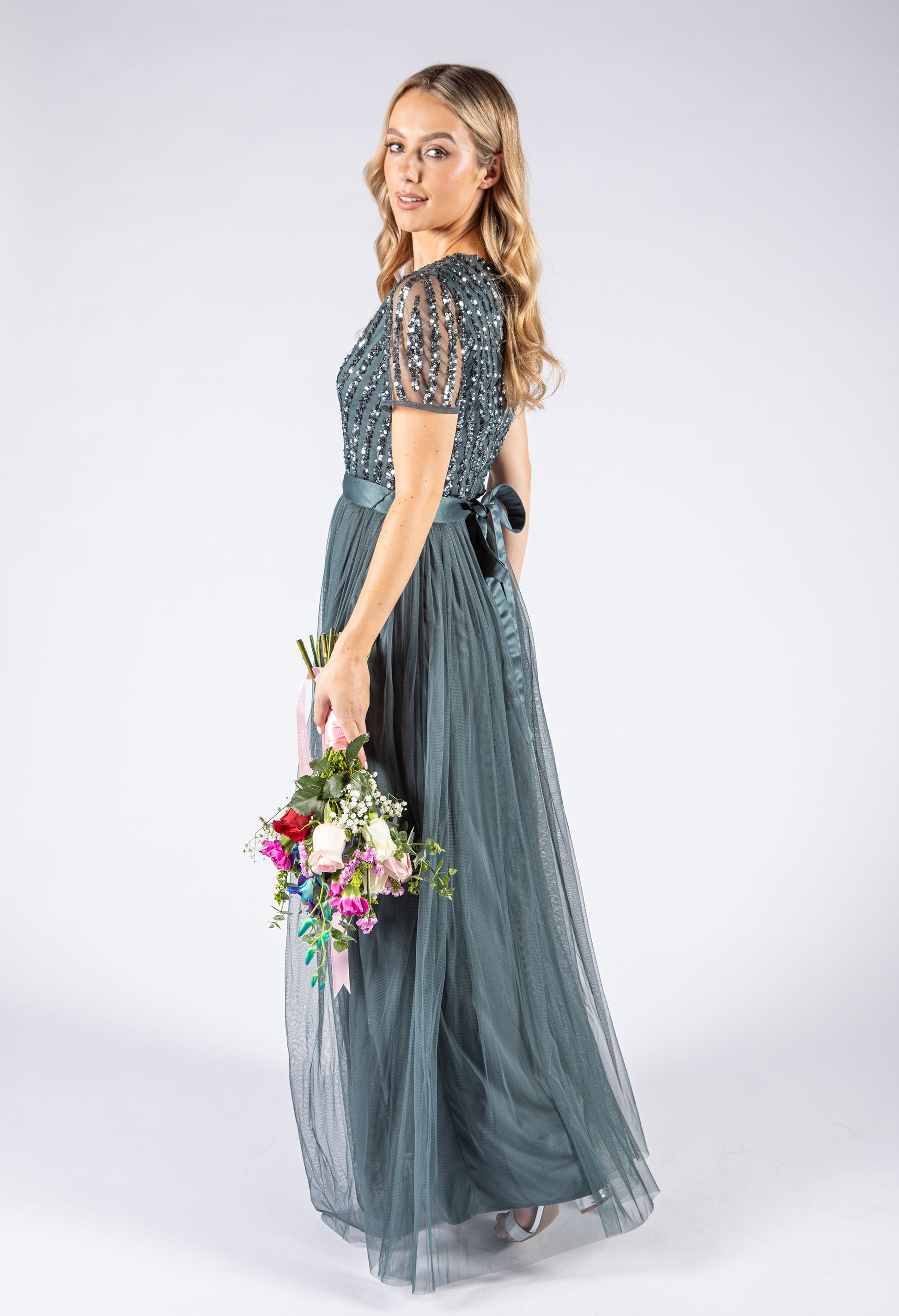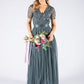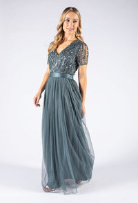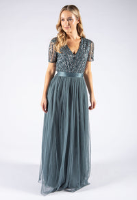 Maya  v-neck full length tulle skirt dress with delicate sequins top and satin belt.