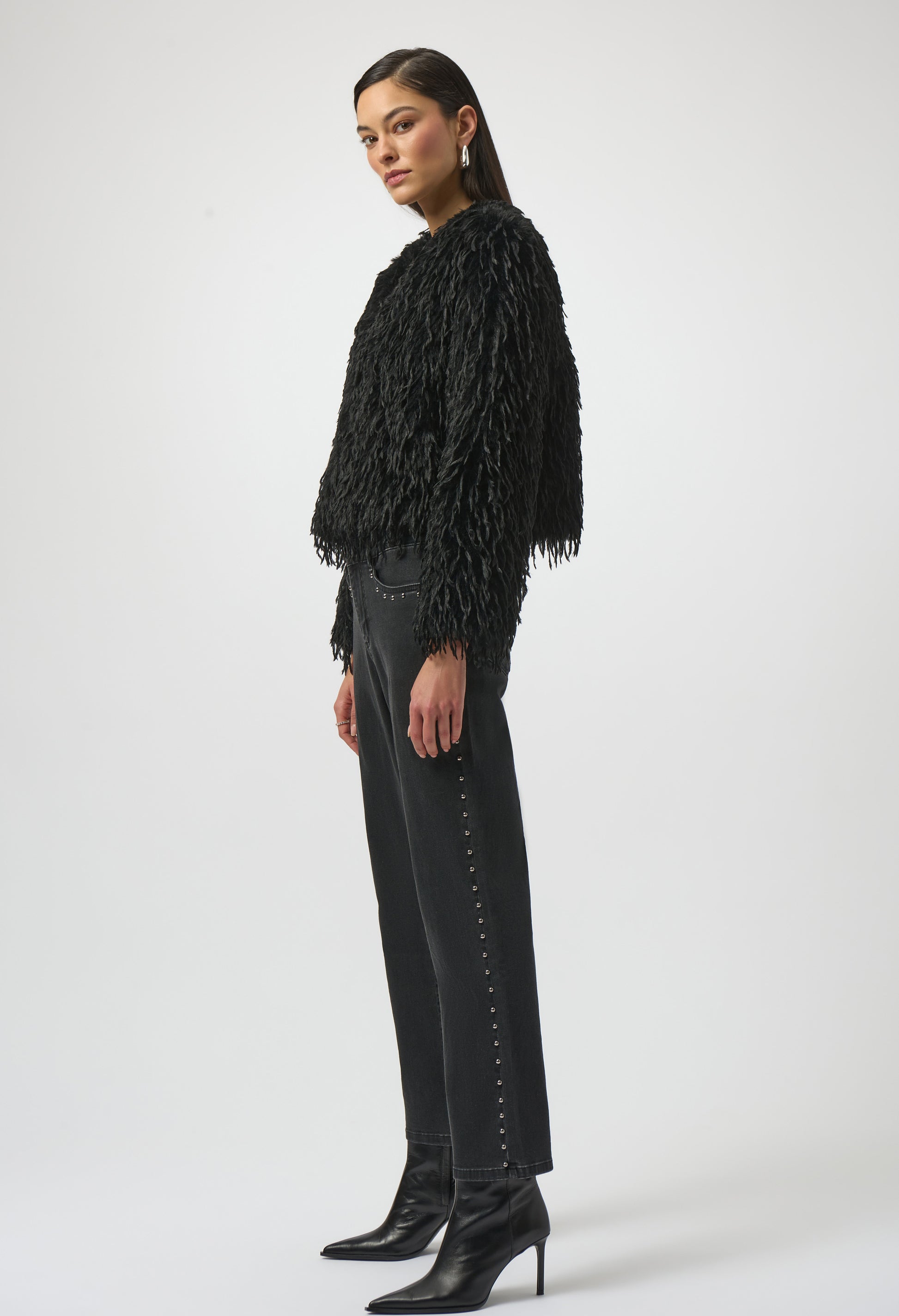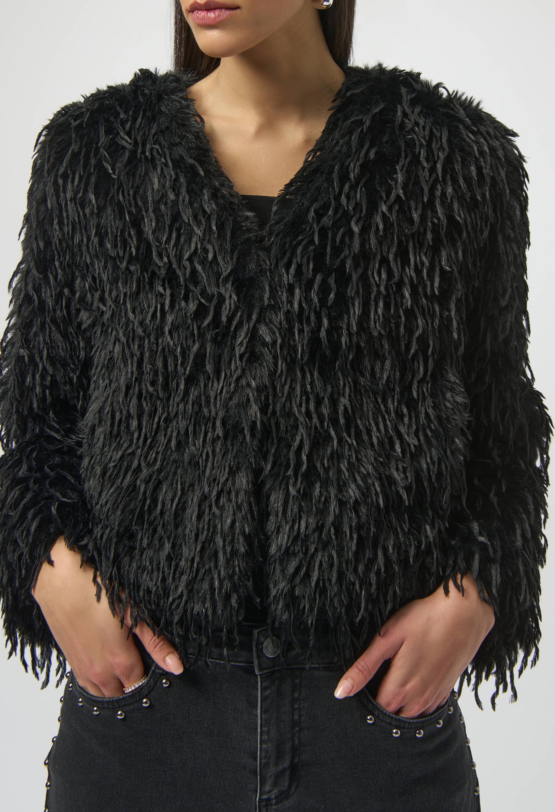 Step into sophistication with the Joseph Ribkoff faux fur jacket. This regular fit, short-length jacket features an open front and a chic shawl collar, perfect for both casual outings and night events. With its long, straight sleeves and edgy, feminine style, this versatile piece adds a touch of elegance and flair to any ensemble.