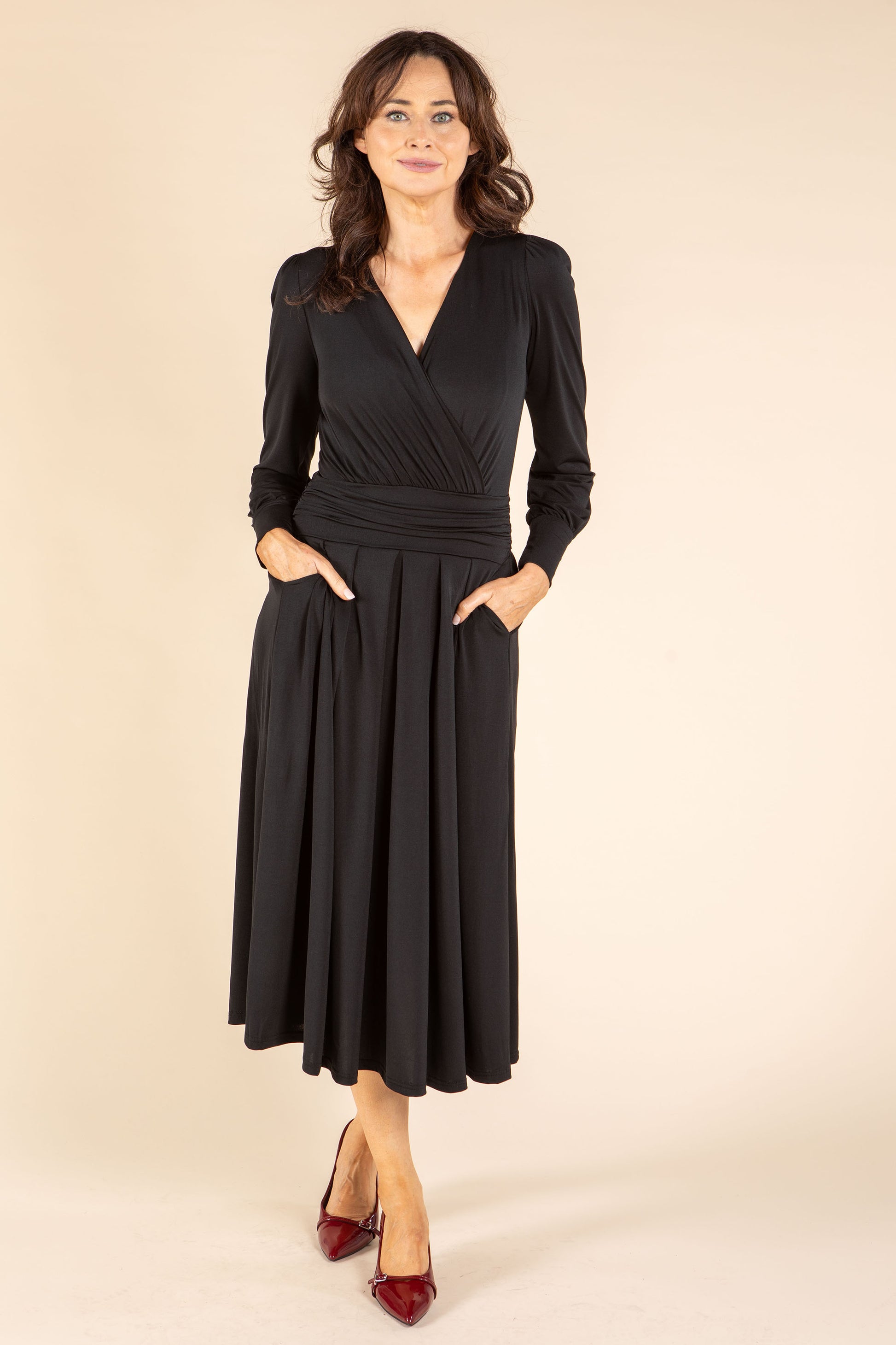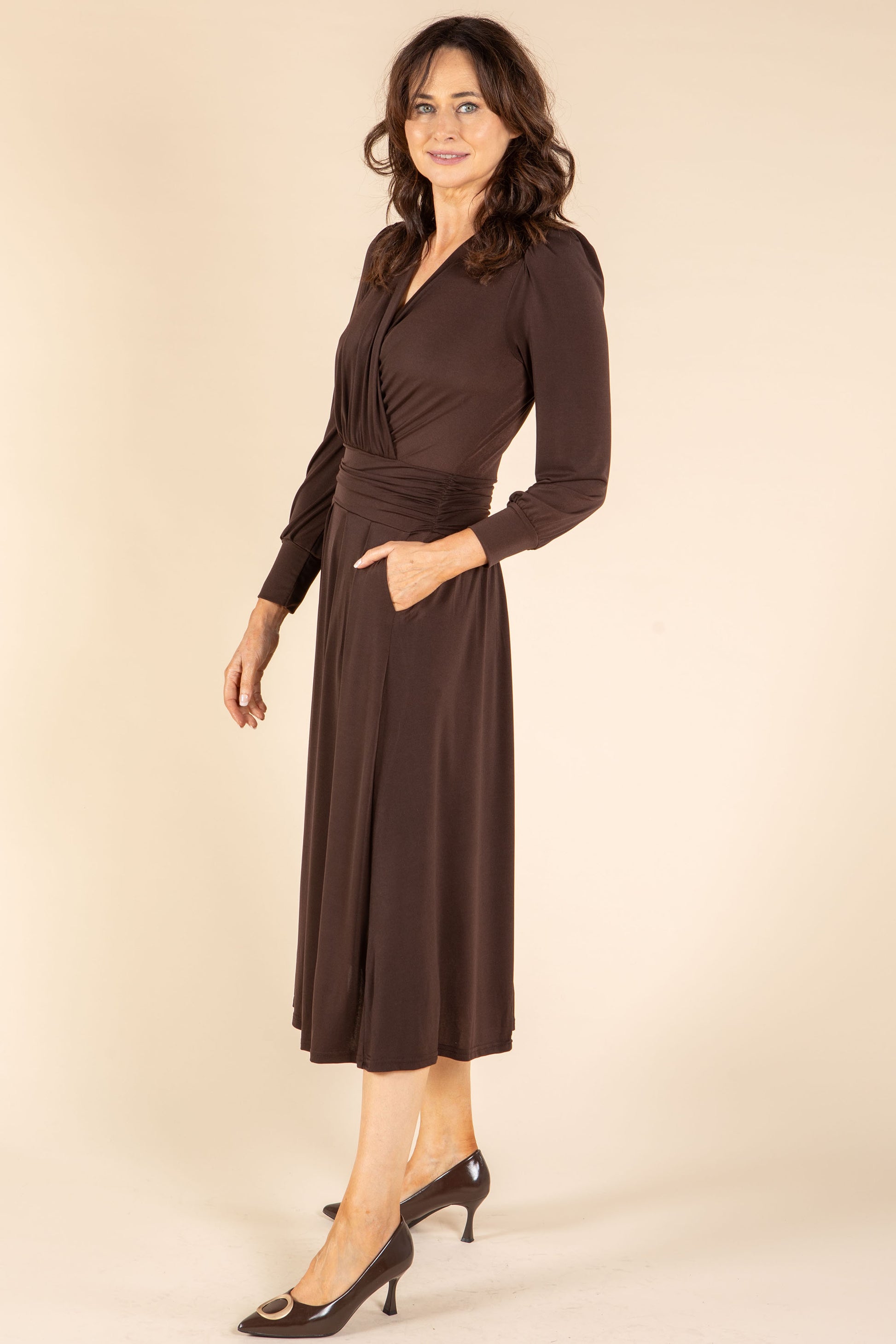 Elegant and timeless, this Midi Dress features a faux wrap design with a flattering V-neckline and subtle ruching on the shoulders for a feminine touch. Finished with long sleeves and fitted cuffs, it’s perfect for evening sophistication.