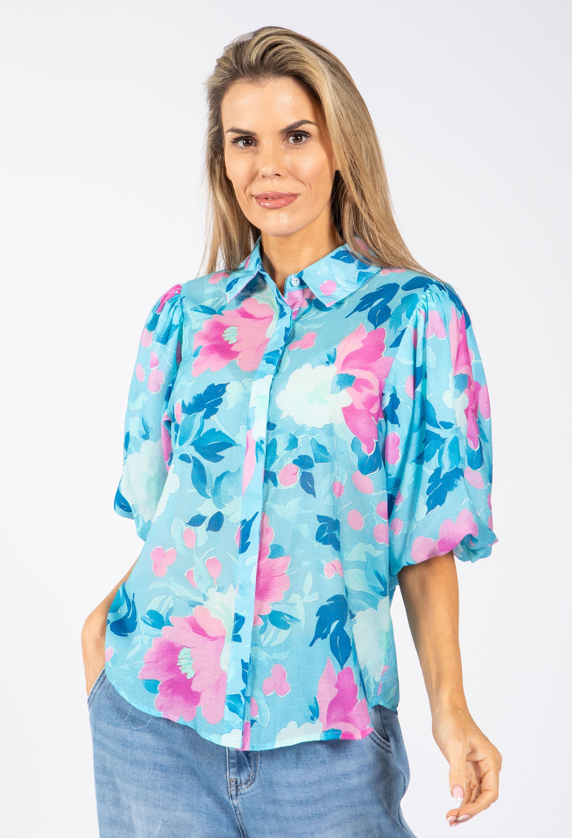 Bring feminine flair to your wardrobe with this floral balloon sleeve blouse. The voluminous 3/4 sleeves feature elasticated cuffs and lined construction for comfort and style. A collared neckline and concealed button closure complete the polished look, making it perfect for any occasion.