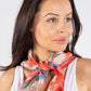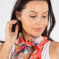 This lovely floral print scarf features a solid colour border and is made with sheer material, measuring approximately 67cm x 69cm. It is designed in a square shape.