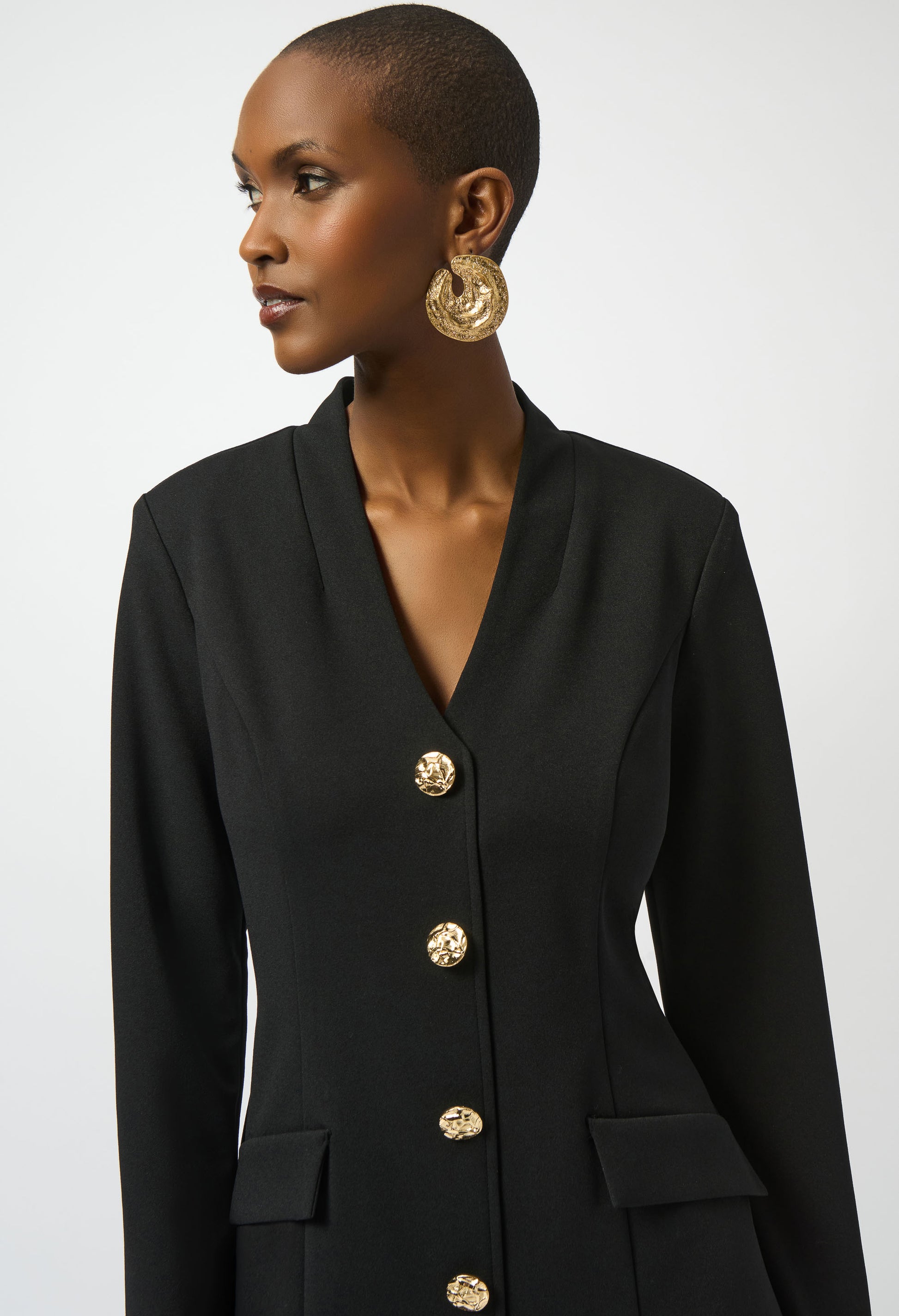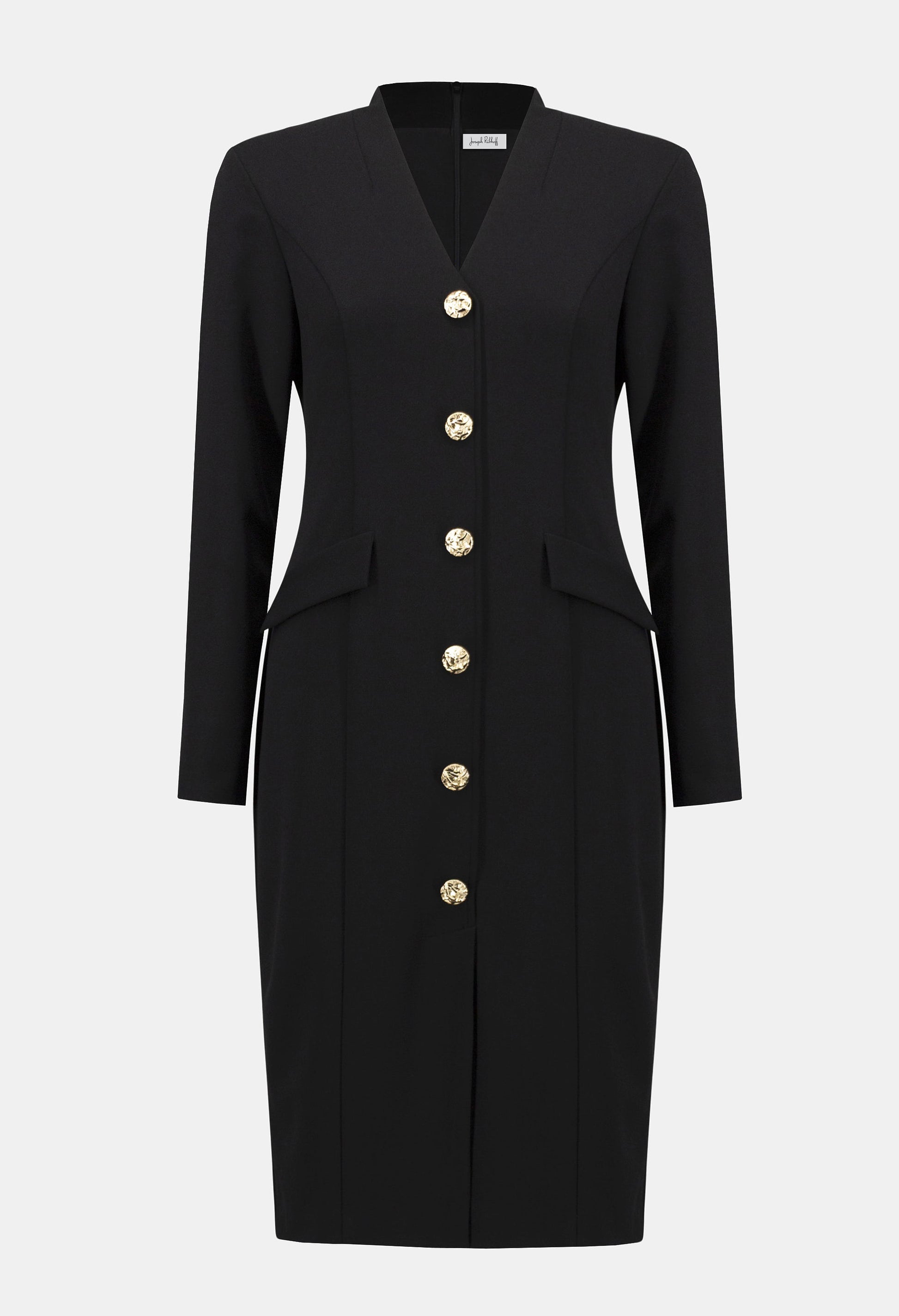 Introducing the Joseph Ribkoff knee-length sheath dress, a perfect blend of elegance and functionality. Designed with a flattering v-neck and long, straight sleeves, this dress features stylish buttons, pockets, and jewels that add a touch of sophistication. Ideal for formal office settings, its plain pattern and feminine style ensure a polished look for any professional occasion.