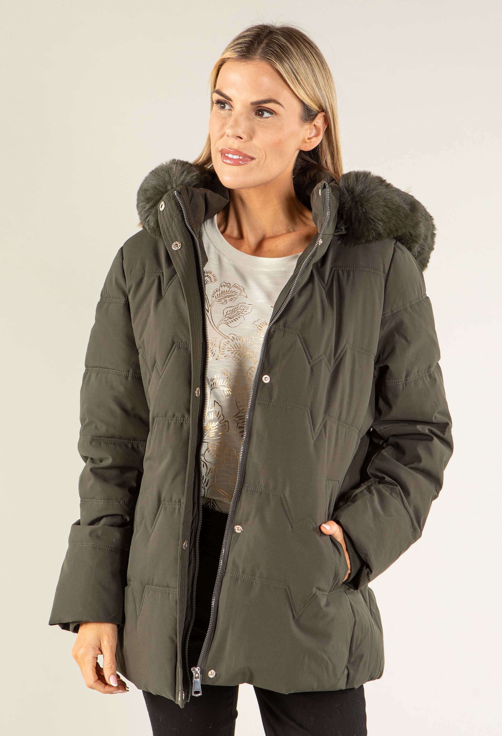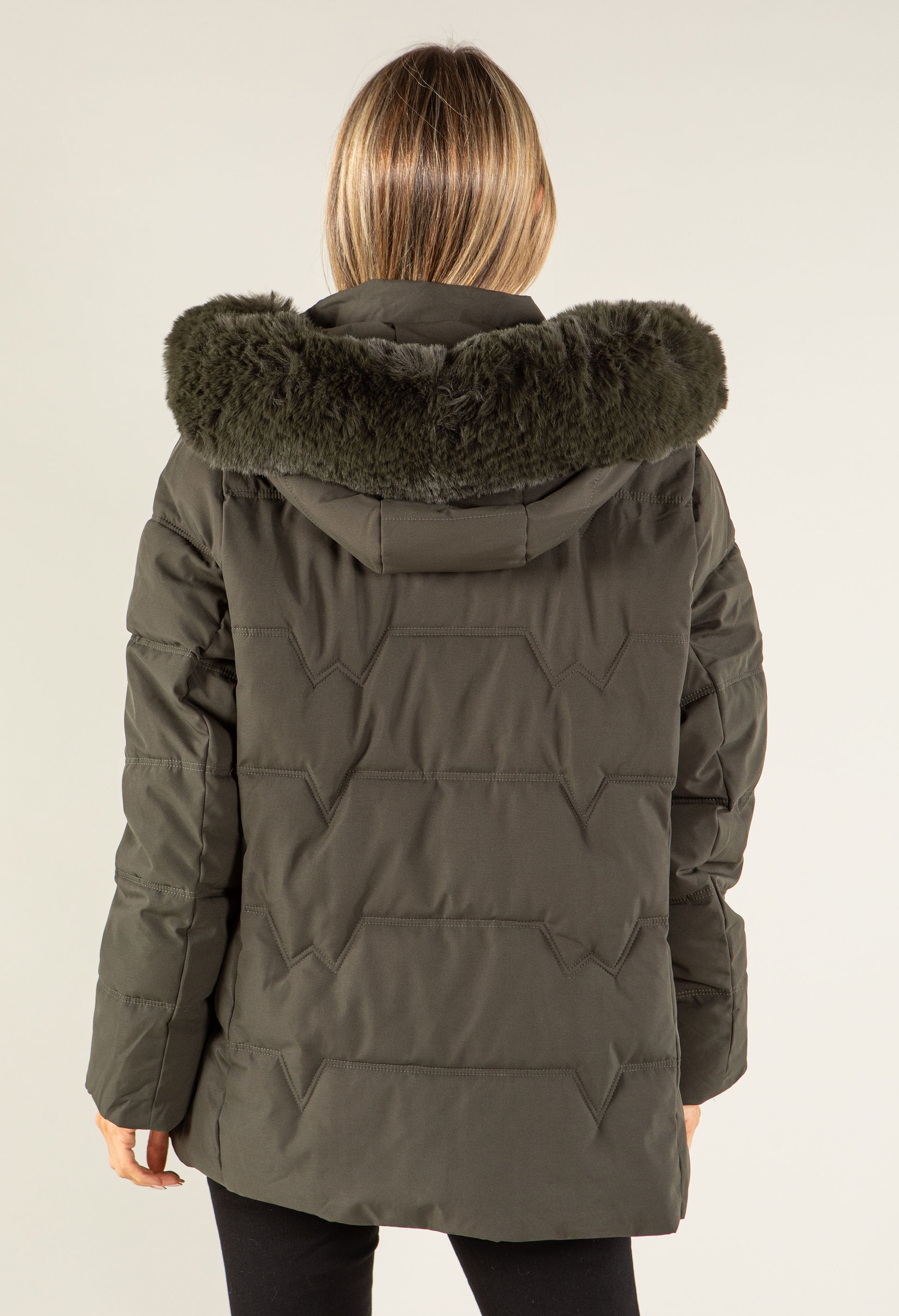 This hooded coat features a detachable hood and is lined with faux fur for added warmth. It offers both button and zip closures, convenient side pockets, and an interior pocket. Designed to be thermal and waterproof, it combines elegance with practical protection against the elements.