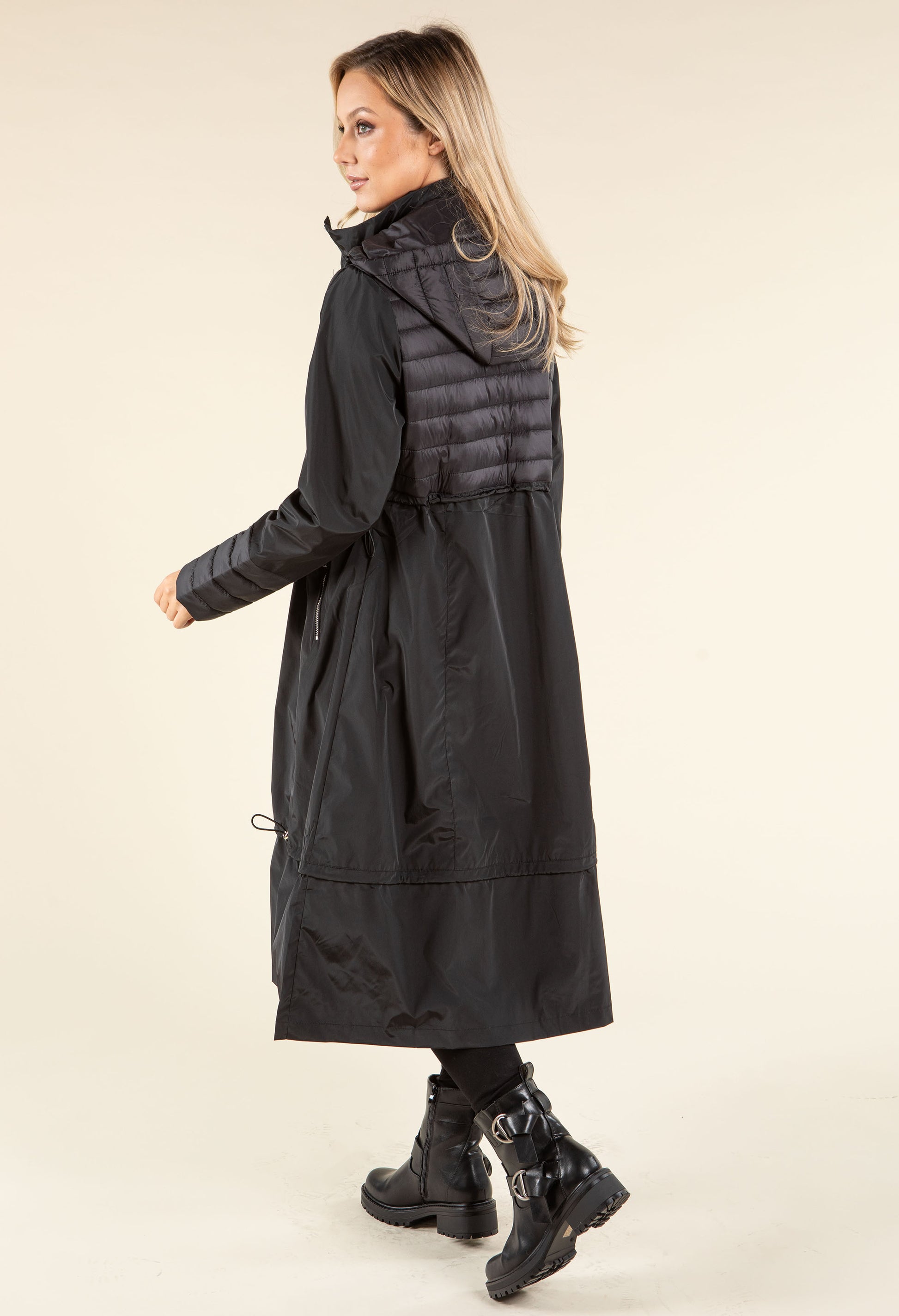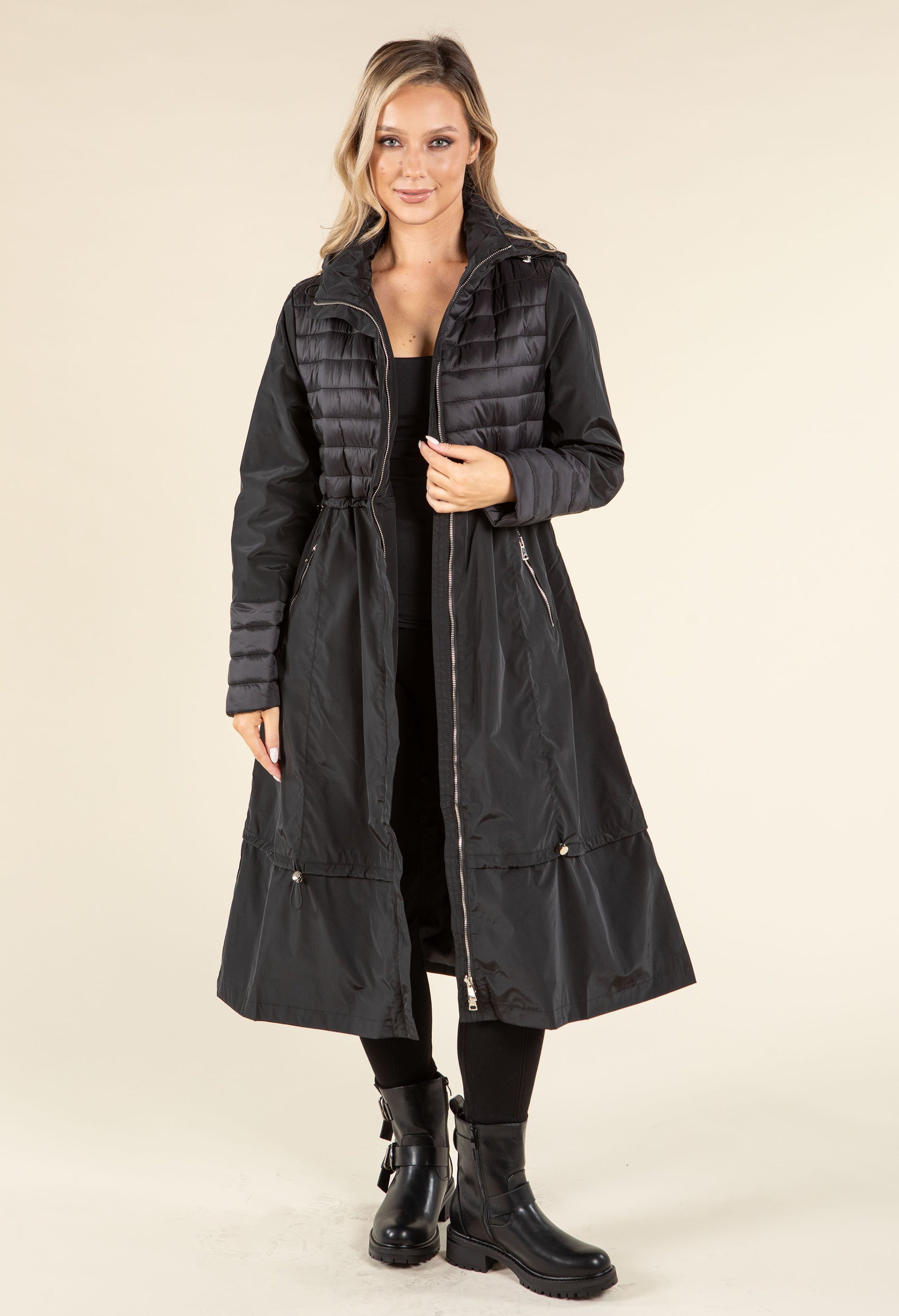 This hooded raincoat features an adjustable hood, zip-up closure, and zip-secured pockets. Designed with long sleeves and a quilted top, it offers an adjustable fit for tailored comfort.