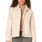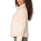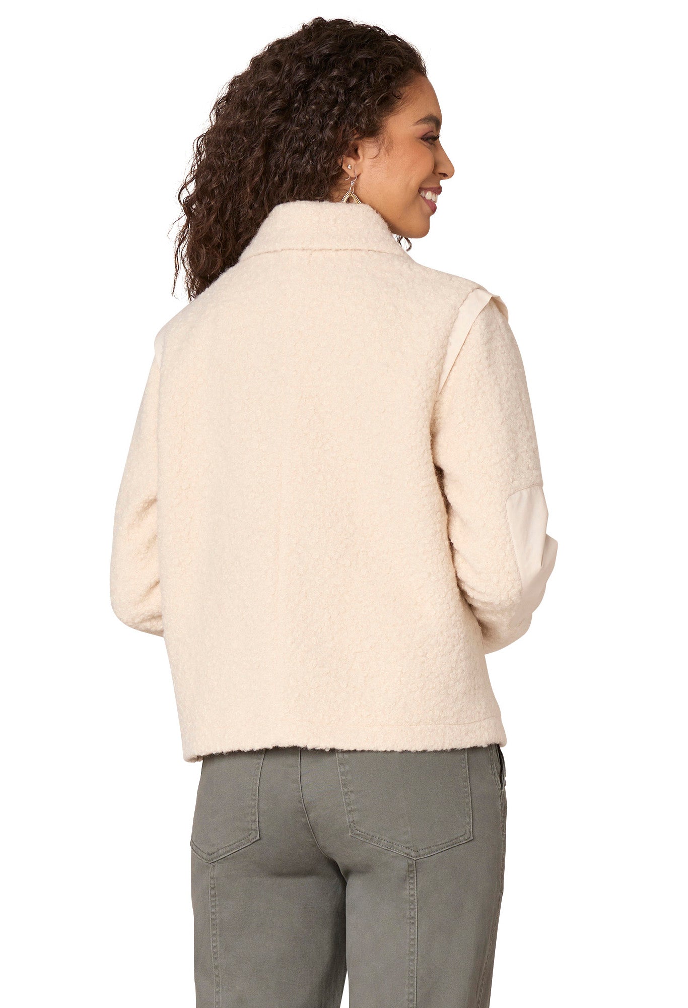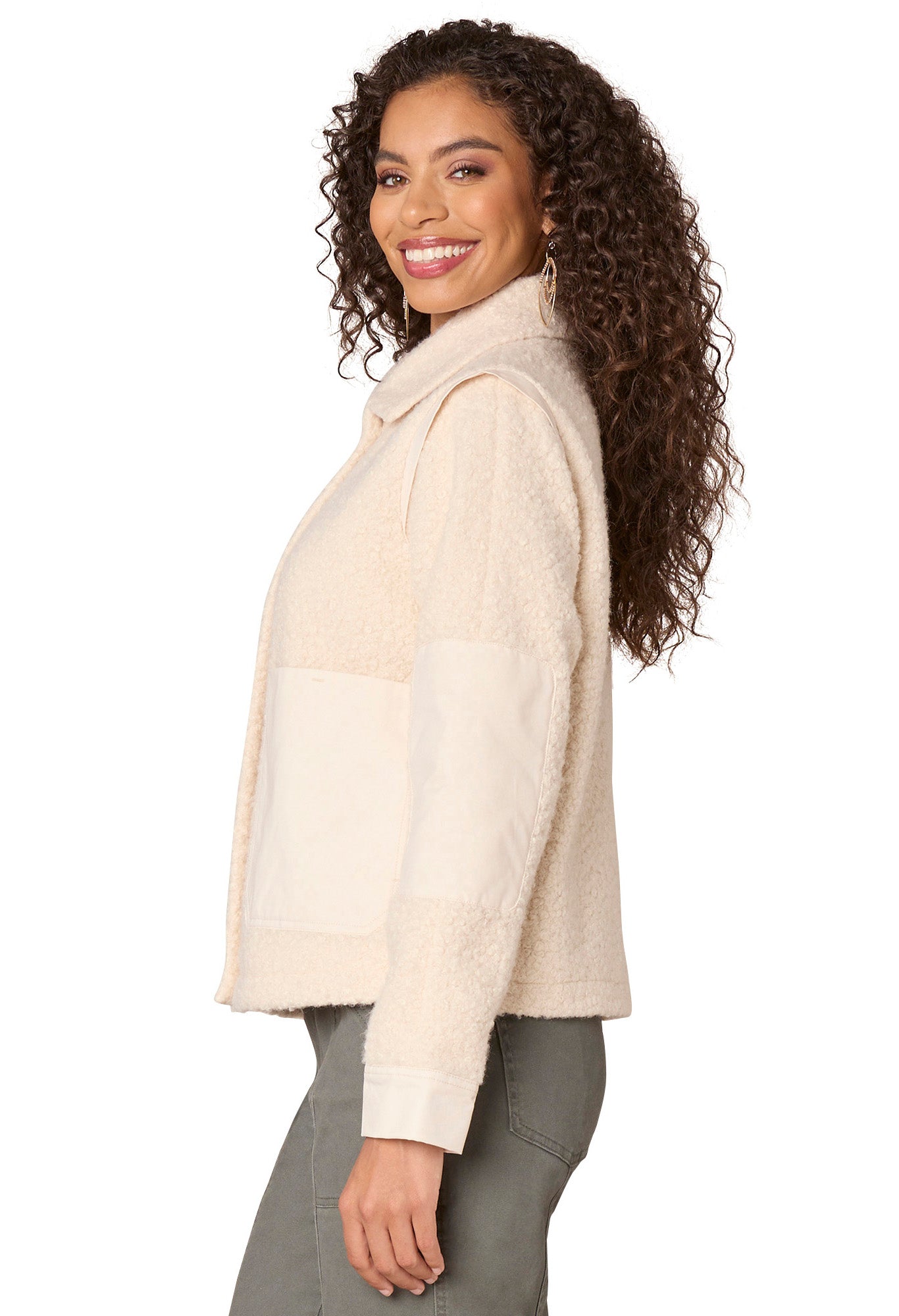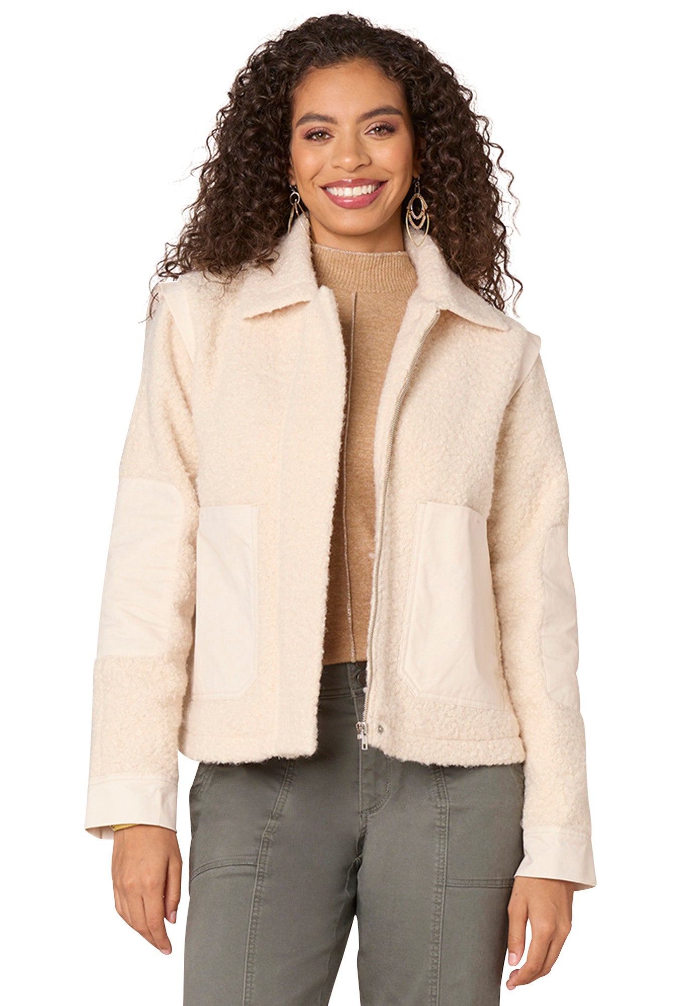• Women’s fashion jacket • Woven sherpa • Blanched almond • Wide collar neck • Hidden zip front with snaps • Back center seam • Oversized drop in pockets • Contrast mixed media design • Long flange shoulder sleeve • Straight hem