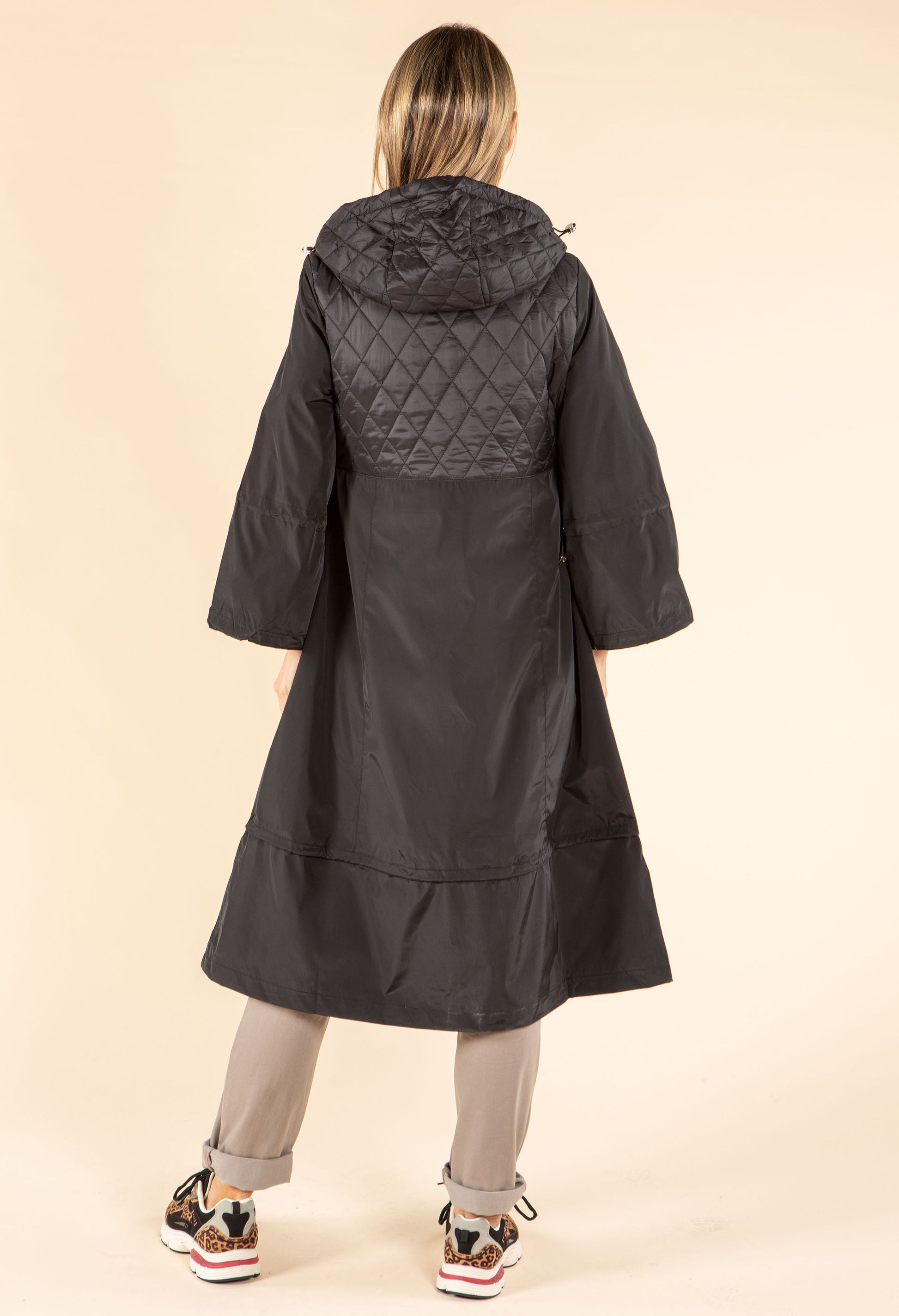 Stay stylish whatever the weather in this longline rain jacket, featuring a drawstring hood and zip closure for a practical yet chic look. Finished with quilted detailing, silver zip front pockets, and adjustable drawstrings on the arms and hem, it’s the perfect blend of function and fashion.
