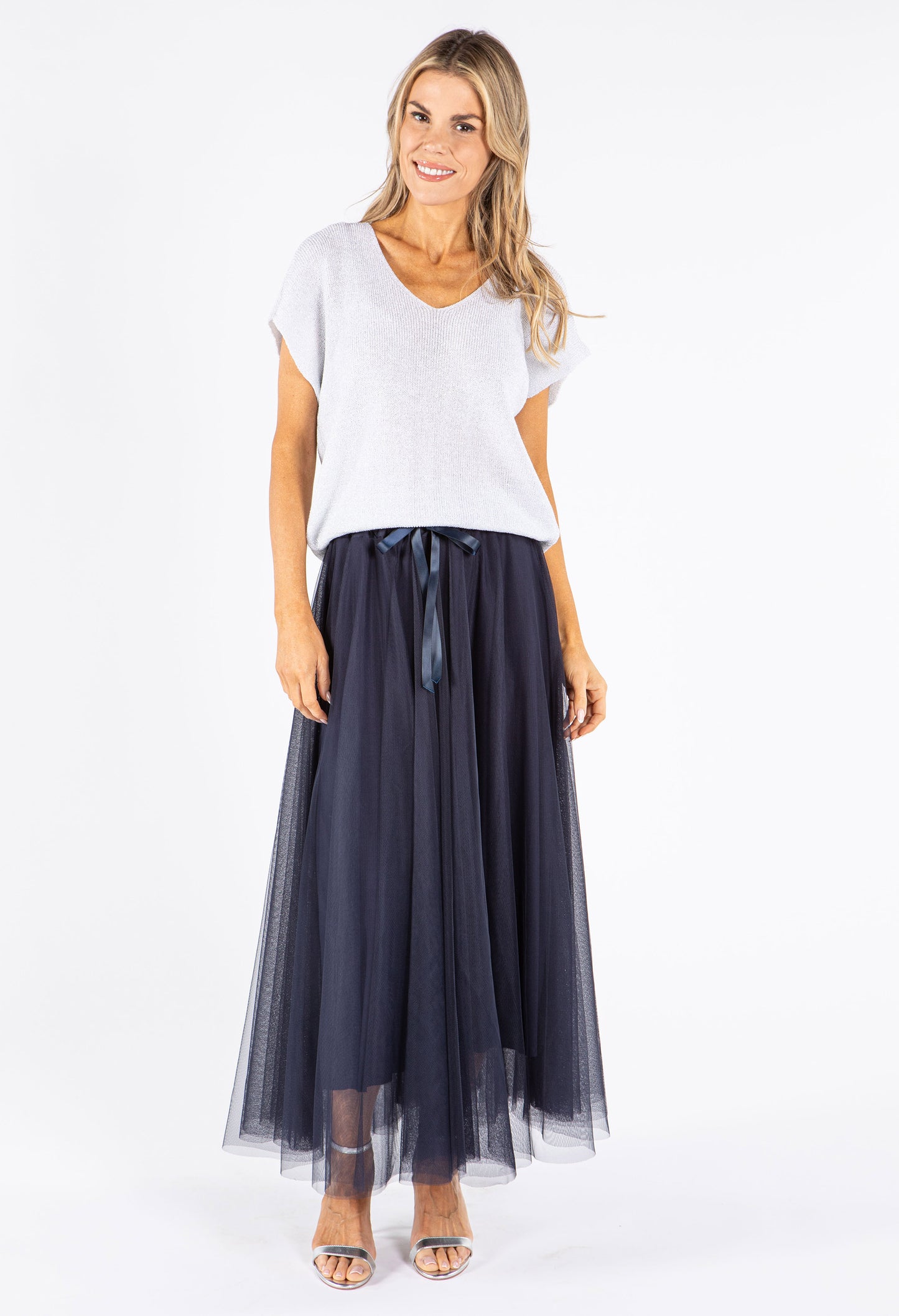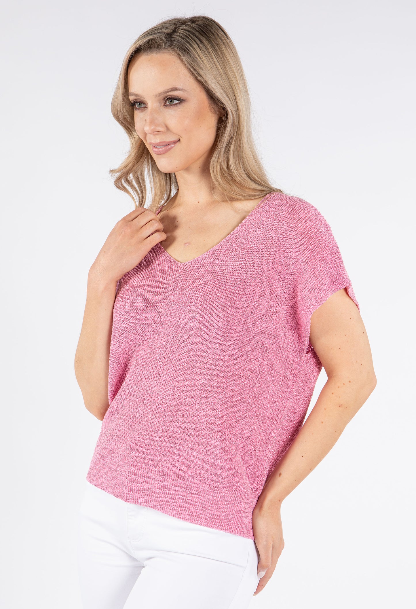 This elegant top features a subtle V-neckline and fashionable drop shoulders for a relaxed, flattering silhouette. The beautiful lurex knit adds a touch of shimmer to elevate your everyday style. Designed in a versatile free size that comfortably fits UK sizes 10-14, this adaptable piece works for various body types.
