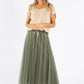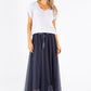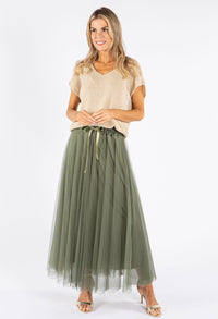Lifestyle Image- Gold: Skirt, Wedges.