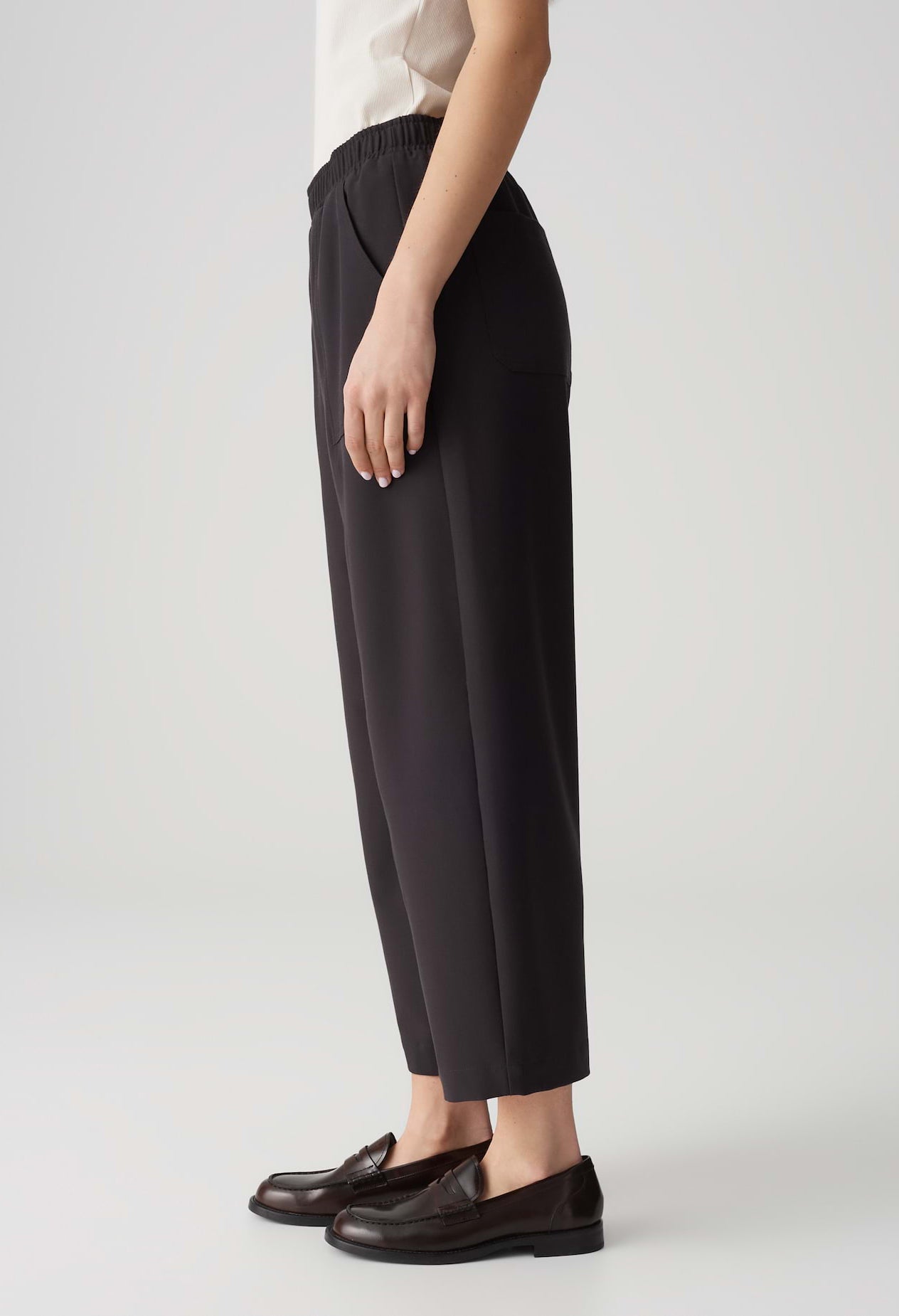 A relaxed barrel fit made from comfortable fabric with a wool content ensures a cosy feel and is a casual fashion highlight. Attached cargo pockets and an elasticated comfort waistband round off the urban look.