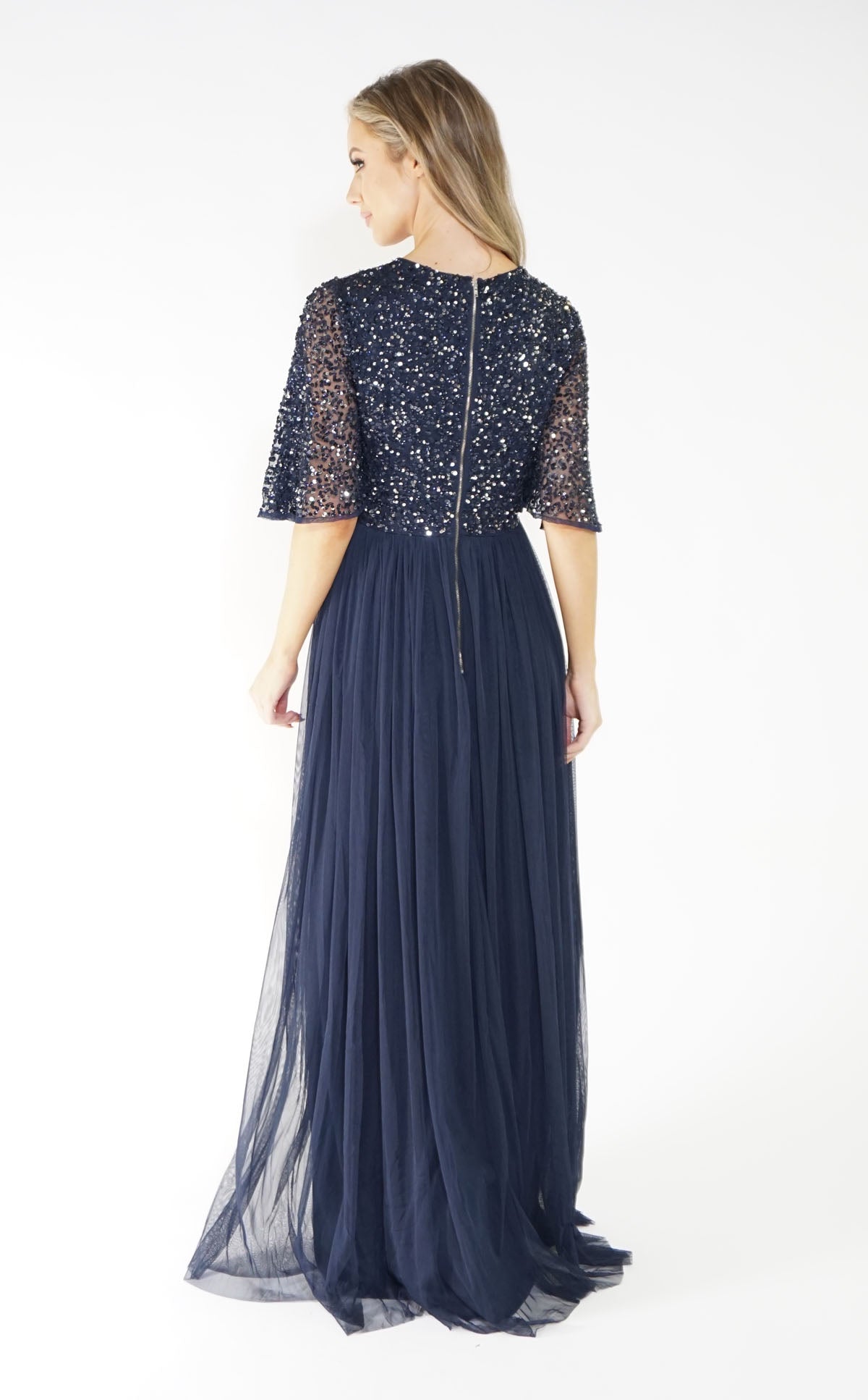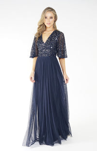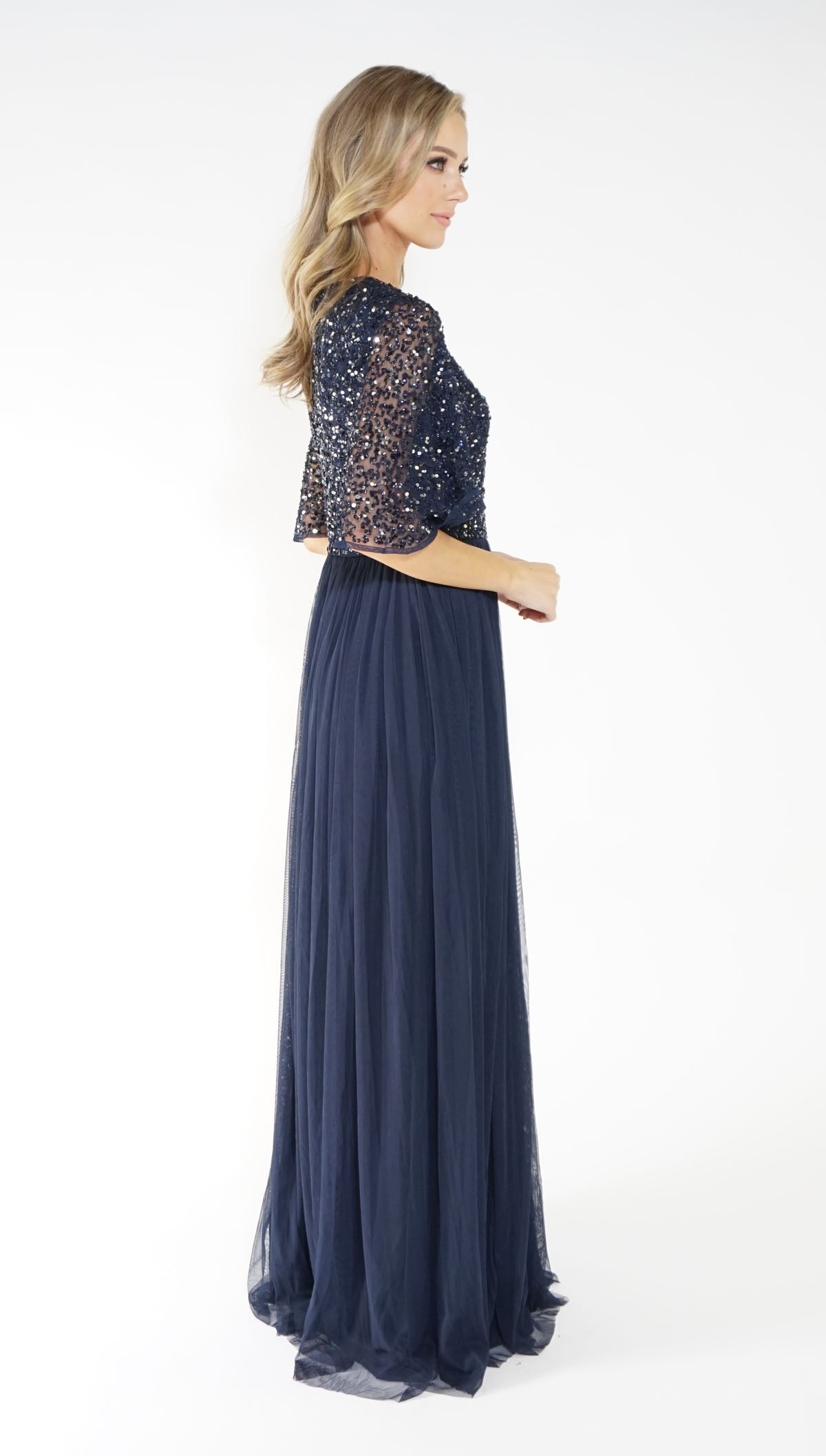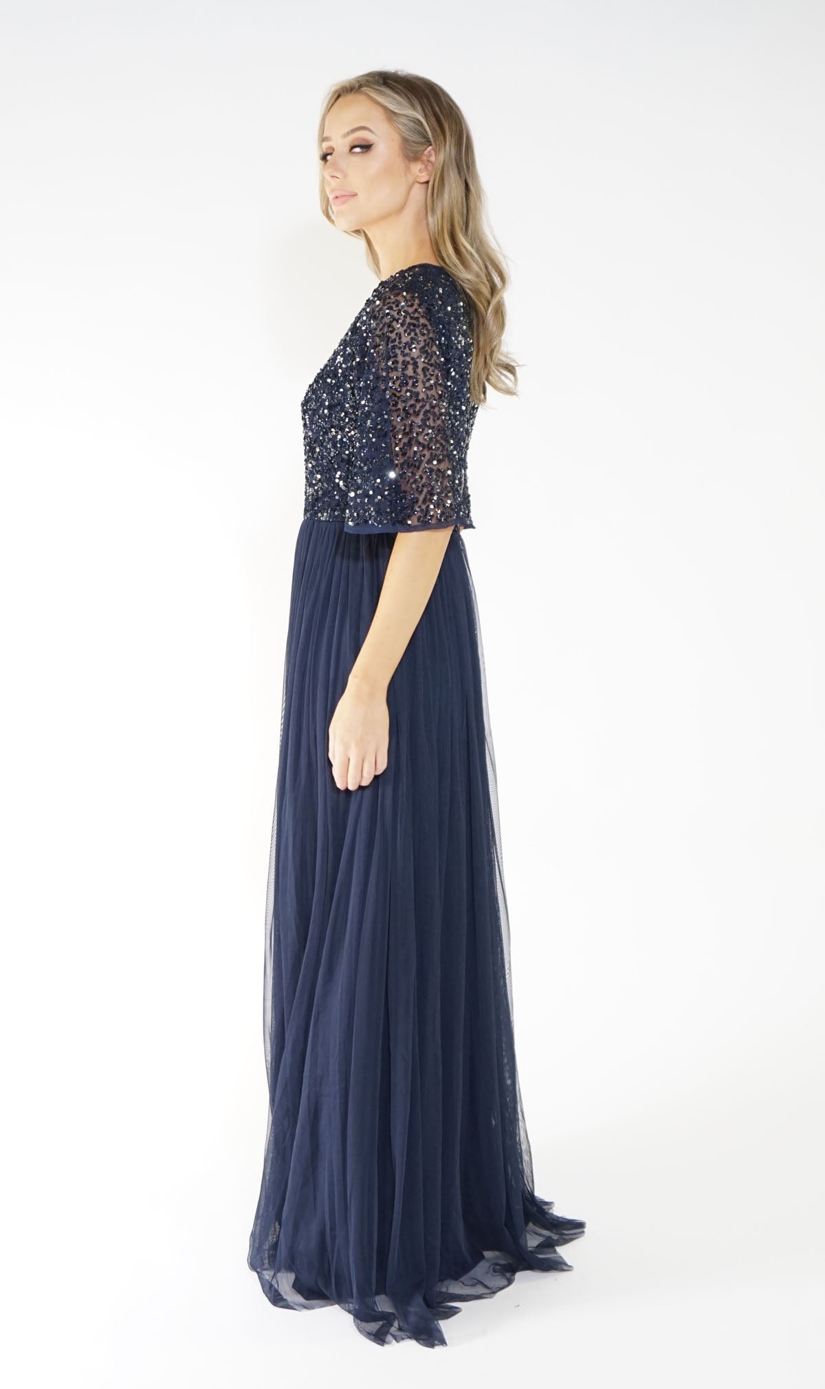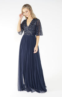 Maya Bridesmaid V-neck full length tulle dress with tonal delicate sequin in navy.