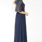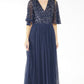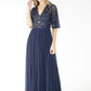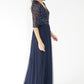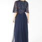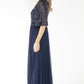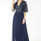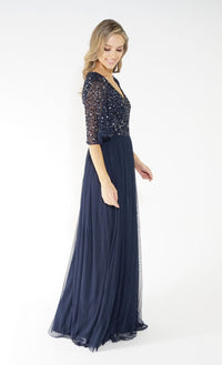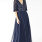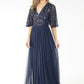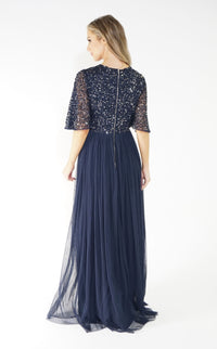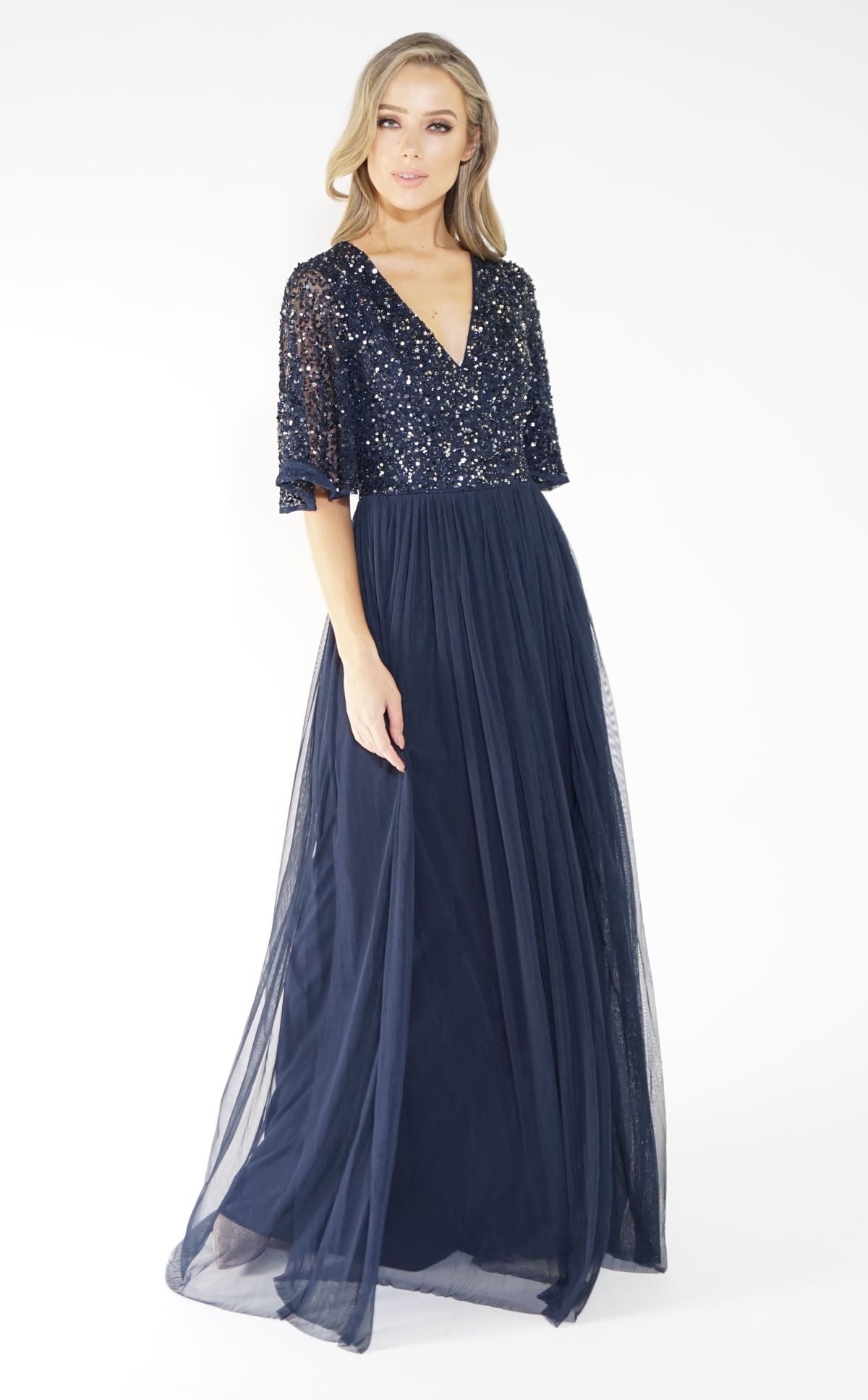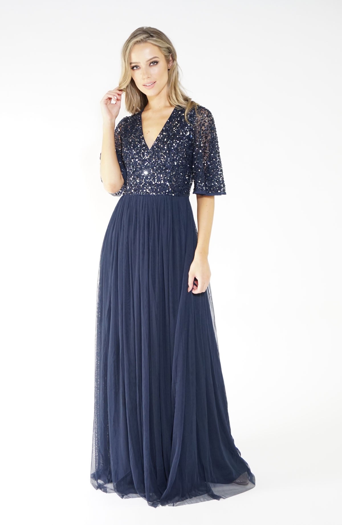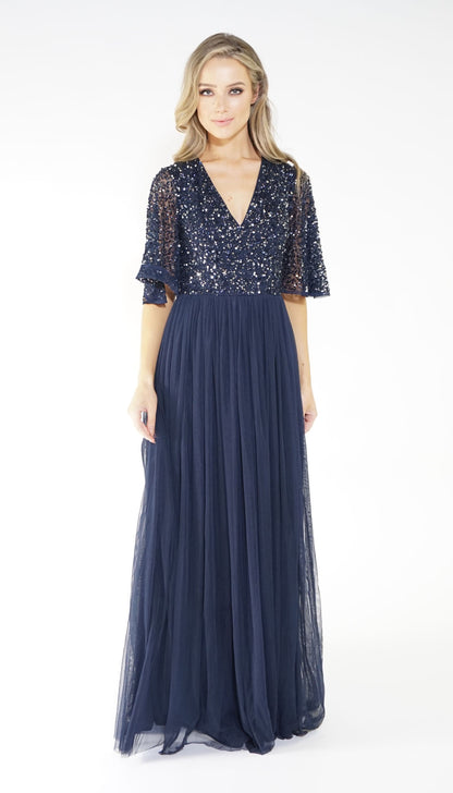 Maya Bridesmaid V-neck full length tulle dress with tonal delicate sequin in navy.