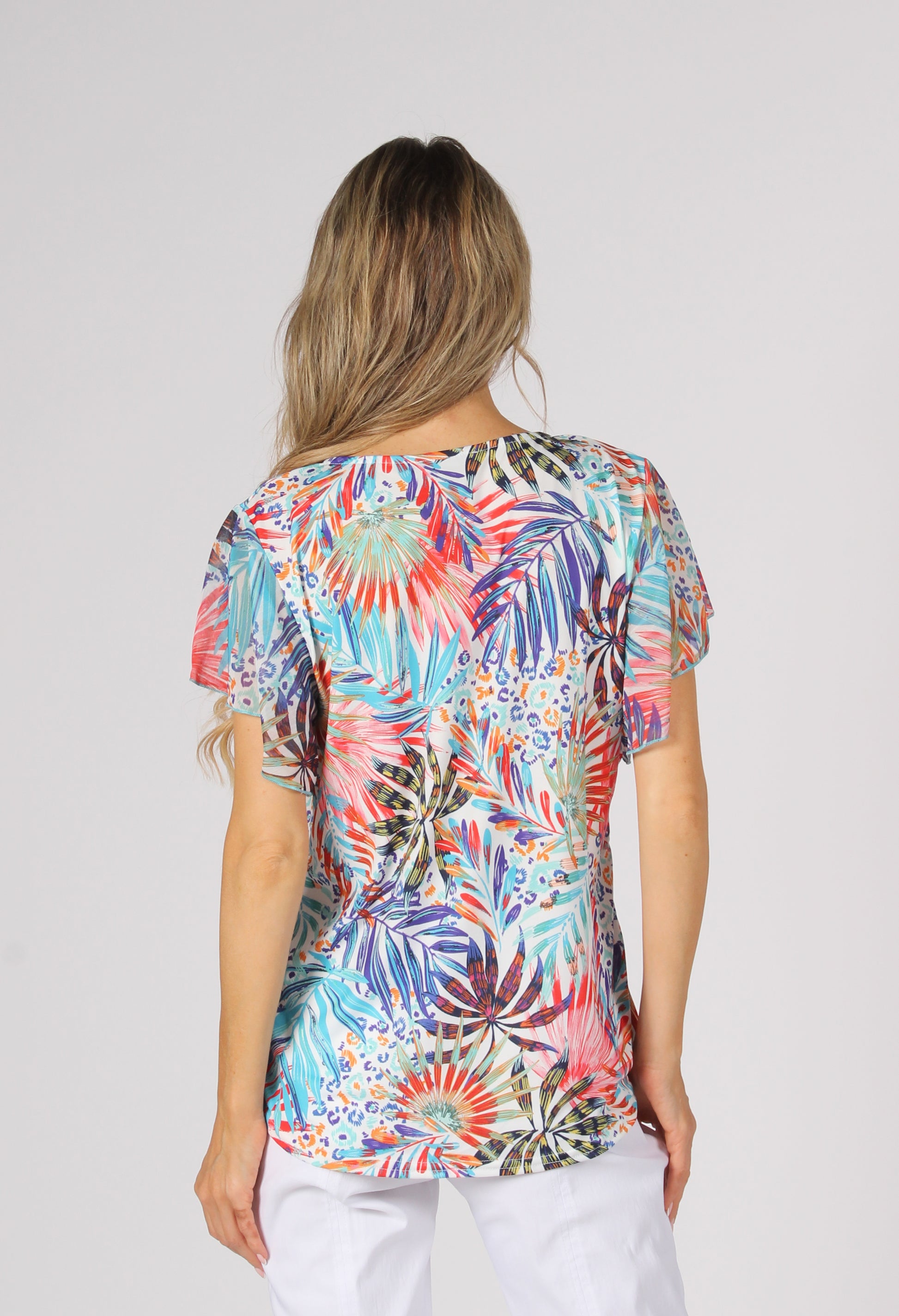 This top features short angel sleeves and a flattering V-neckline, crafted from stretch fabric for ease of movement. It is adorned with a distinctive palm print and finished with a stylish buckle detail for a refined look.