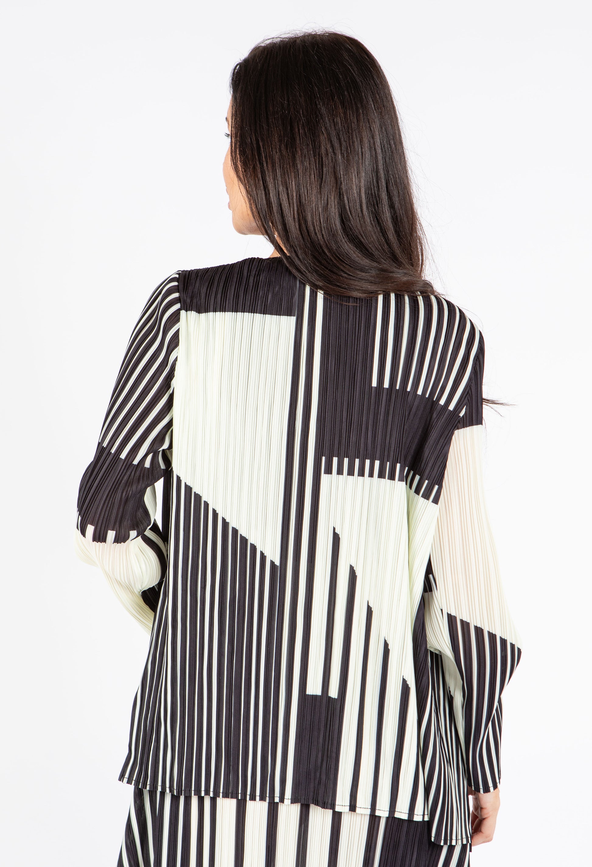 Get ready to make a statement in this Long Sleeve Pleated Stripe Jacket, available in a free size to fit all body types. The open front design and bold print will elevate any outfit!