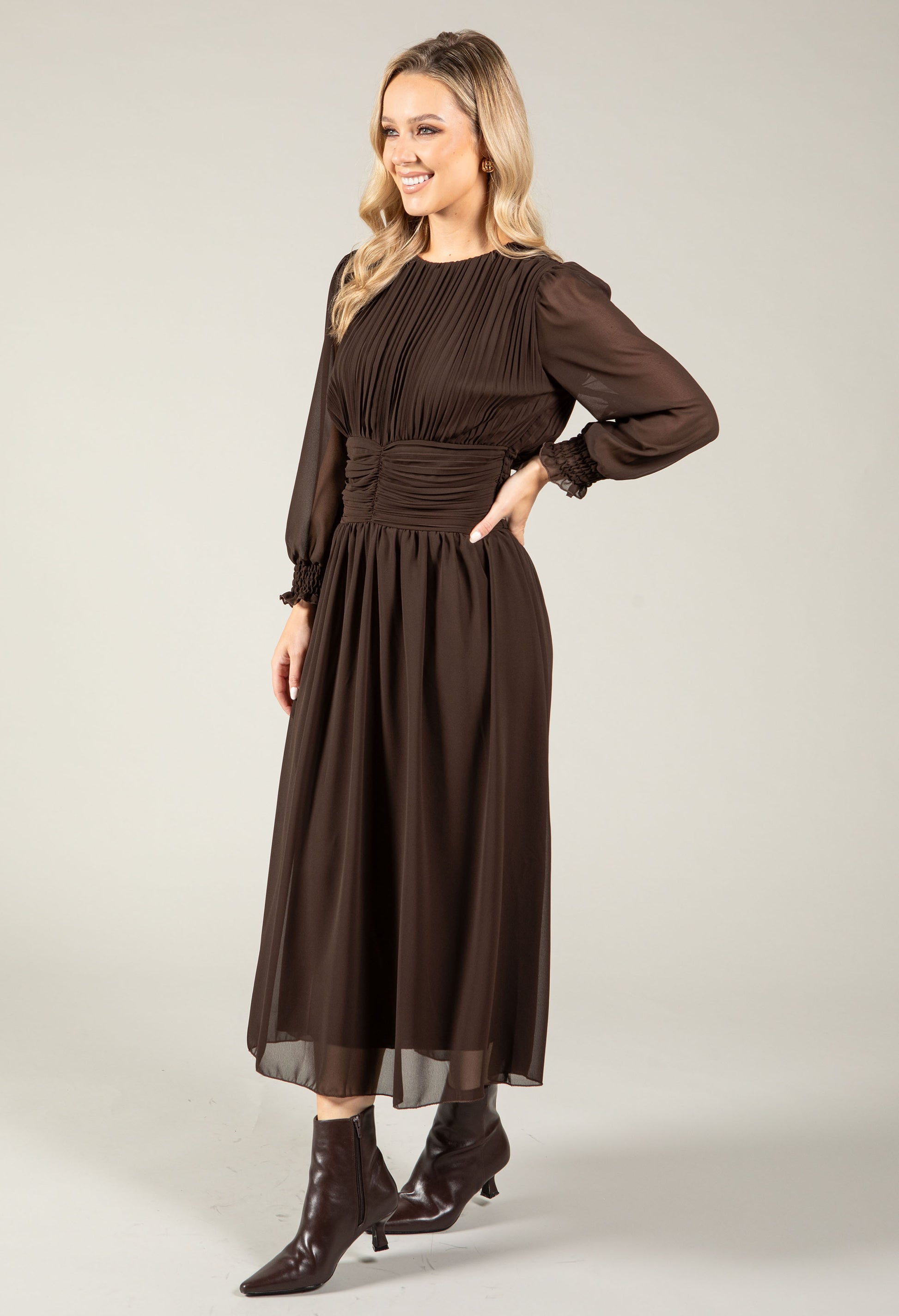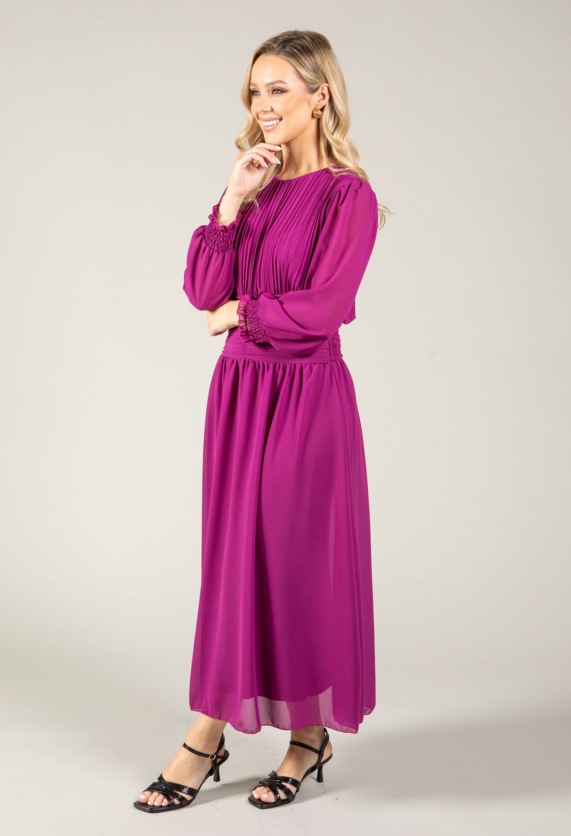 Discover understated elegance with this midi dress featuring a classic round neckline and delicate sheer sleeves finished with elasticated cuffs. The plissé pleated bodice brings dimension and movement, while the lined construction and button fastening ensure lasting quality. A sculpted waistband flatters your silhouette, and the graceful flowing hem makes it perfect for every occasion.