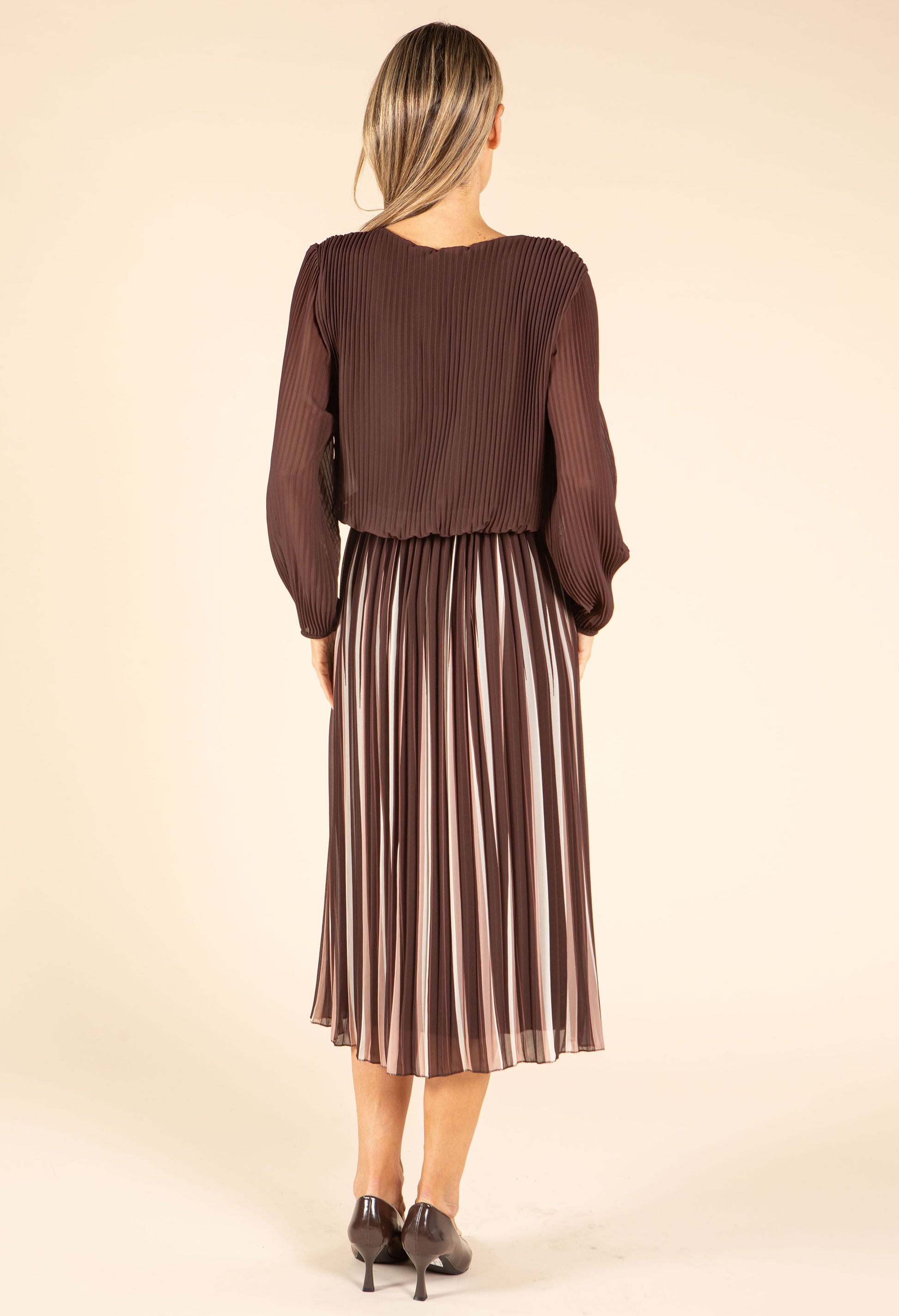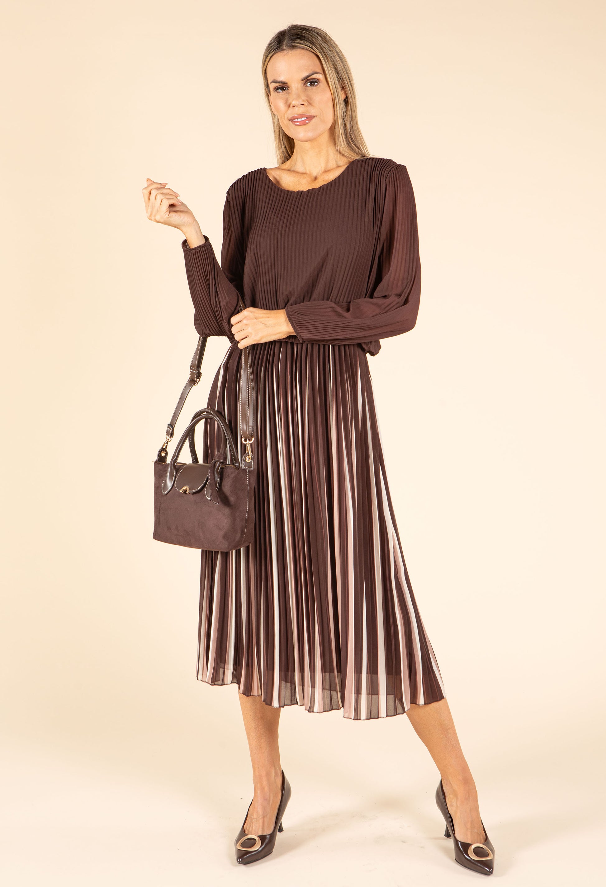 This midi-length dress features a round neckline and 3/4 length sleeves for a classic look. The plisse pleated fabric adds texture, while the lined design and elasticated waistband ensure comfort and a flattering fit.