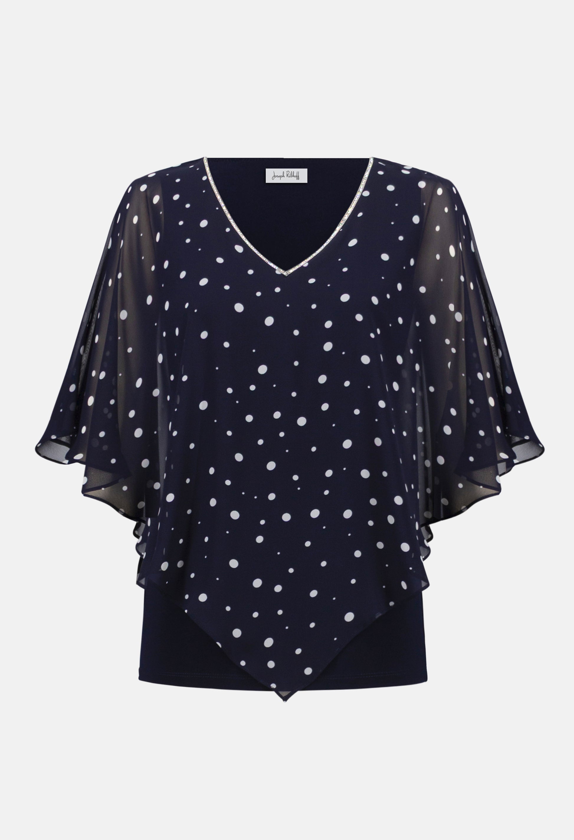 Introducing a chic and versatile piece from Joseph Ribkoff, this pullover style top features a relaxed fit and hip-length design for ultimate comfort. Adorned with jewel embellishments and a playful polka dot pattern, it boasts a flattering v-neck and flutter short sleeves. Perfect for casual and semi-formal occasions, this top effortlessly combines style and ease for a standout look.