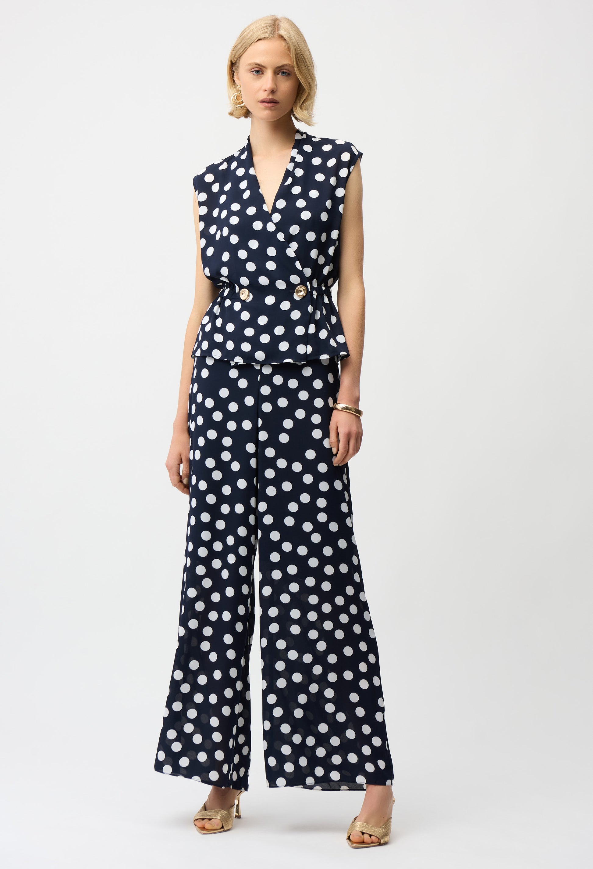 Step into effortless style with these Joseph Ribkoff wide-leg trousers. Designed with a high-waisted fit and full-length cut, these polka dot patterned bottoms are perfect for casual summer days. The feminine, casual style ensures you look chic and comfortable, whether you're out for a stroll or enjoying a laid-back gathering. Embrace the playful charm of polka dots and elevate your wardrobe basics.