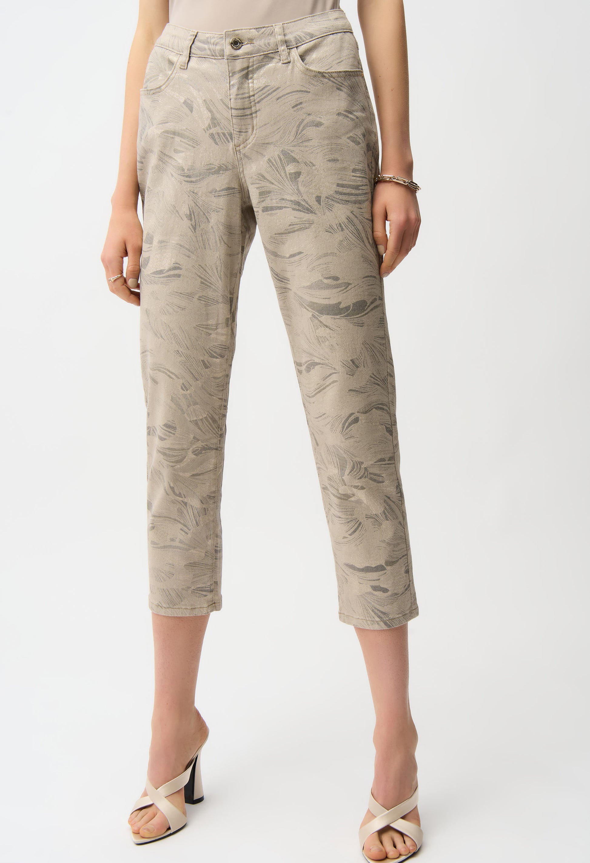 Introducing the Joseph Ribkoff slim-fit trousers, perfect for casual summer occasions. These mid-rise, cropped bottoms feature a stylish floral pattern that effortlessly embodies casual elegance. With buttoned details and practical pockets, these trousers combine functionality with fashion, making them an essential addition to your wardrobe. Enjoy the perfect blend of comfort and style with Joseph Ribkoff.