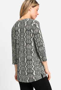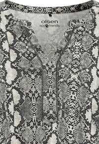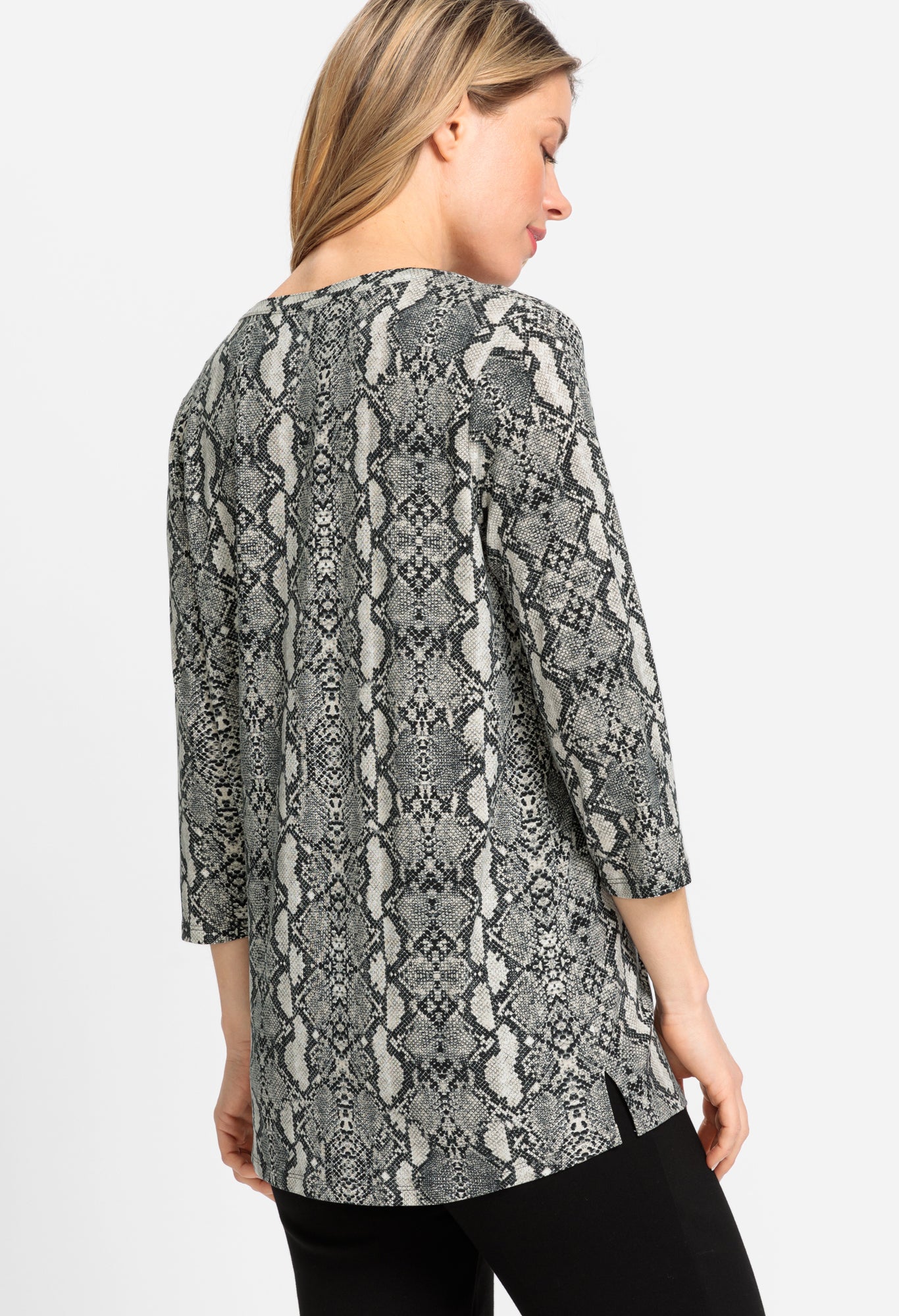 Top with trendy snake print in contemporary 3/4 sleeve length. The slit round neckline is elegantly accentuated by fine lurex piping details. Made from a soft viscose/elastane blend, this statement piece offers the perfect combination of feel-good comfort and exclusive chic. The T-shirt contains LENZING™ ECOVERO™ viscose fibres, which are obtained from controlled wood sources.