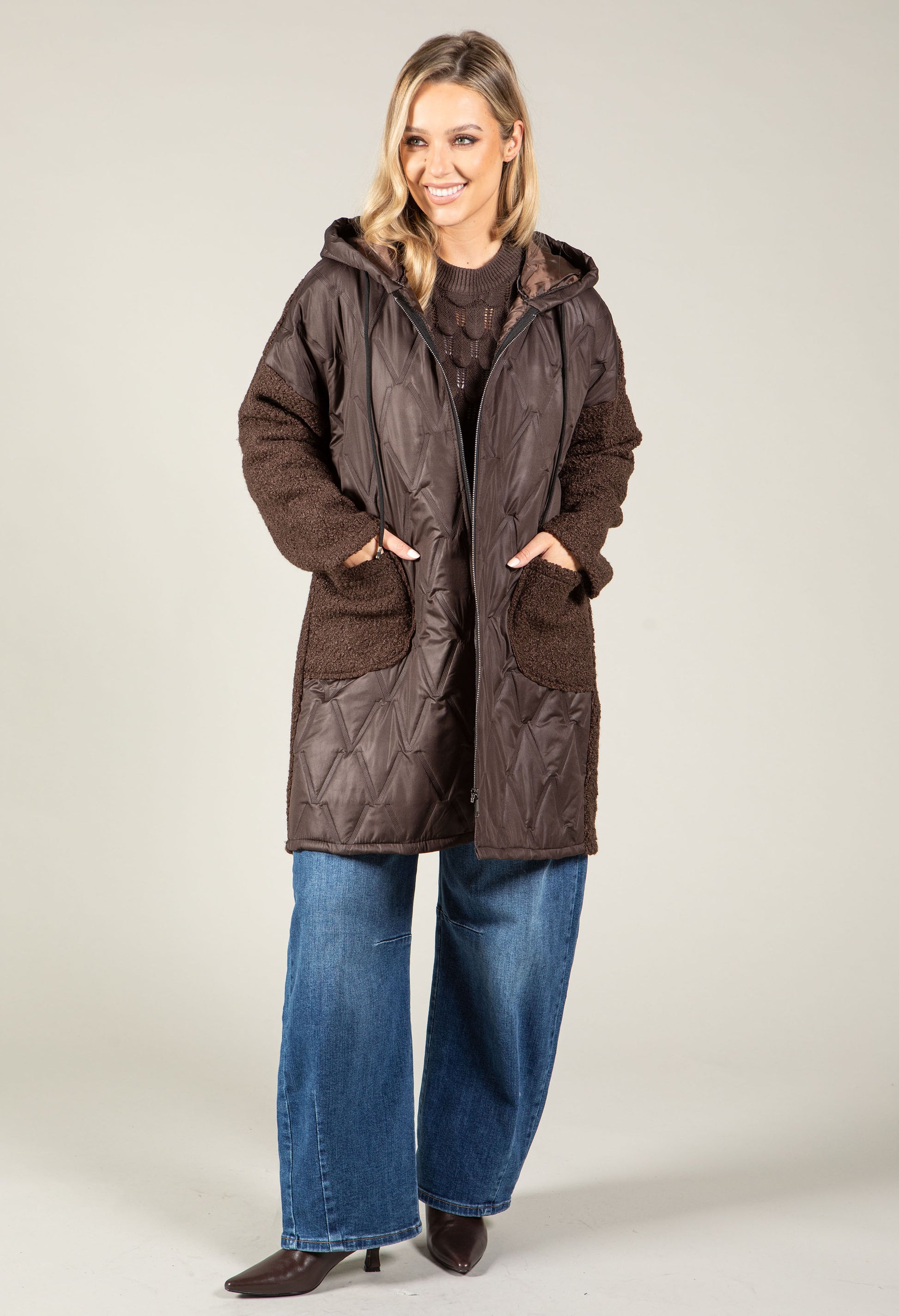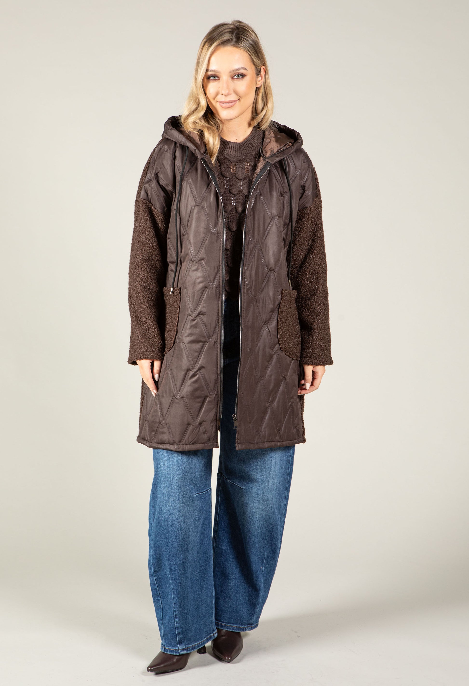Wrap yourself in comfort with this sophisticated hooded coat featuring a soft boucle exterior and quilted front for added warmth. The drawstring hood adjusts to your preference, while two generous front patch pockets keep your essentials close. Long sleeves and polished silver hardware complete the refined look. Perfect for layering through transitional seasons.