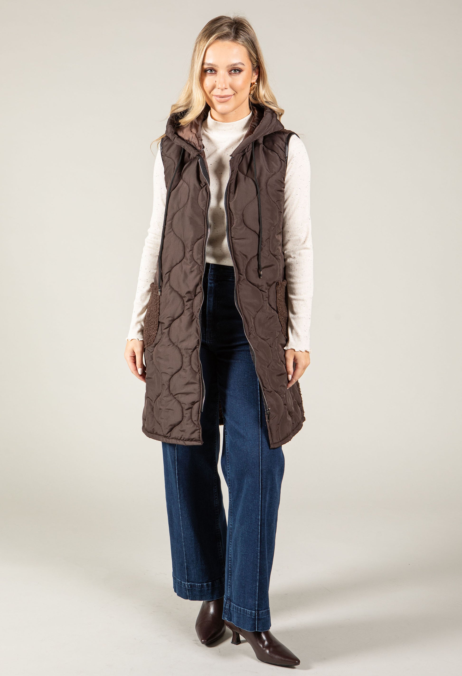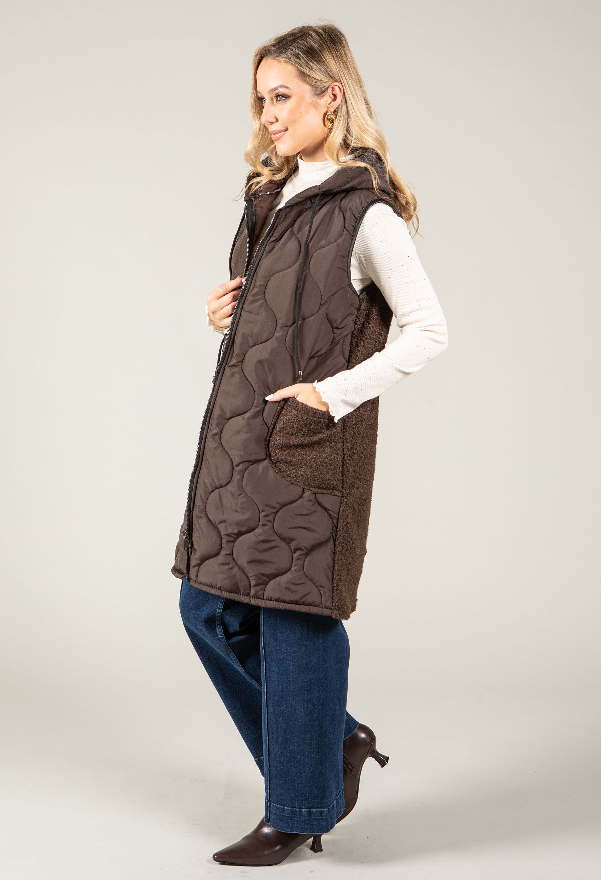 Stay warm and stylish with this modern longline gilet. Combining a plush boucle back with a quilted front, it offers both comfort and practicality. The adjustable drawstring hood keeps you cosy, while two generous front patch pockets provide convenient storage. Perfect for layering on cooler days, this versatile piece transitions seamlessly from casual outings to weekend adventures.