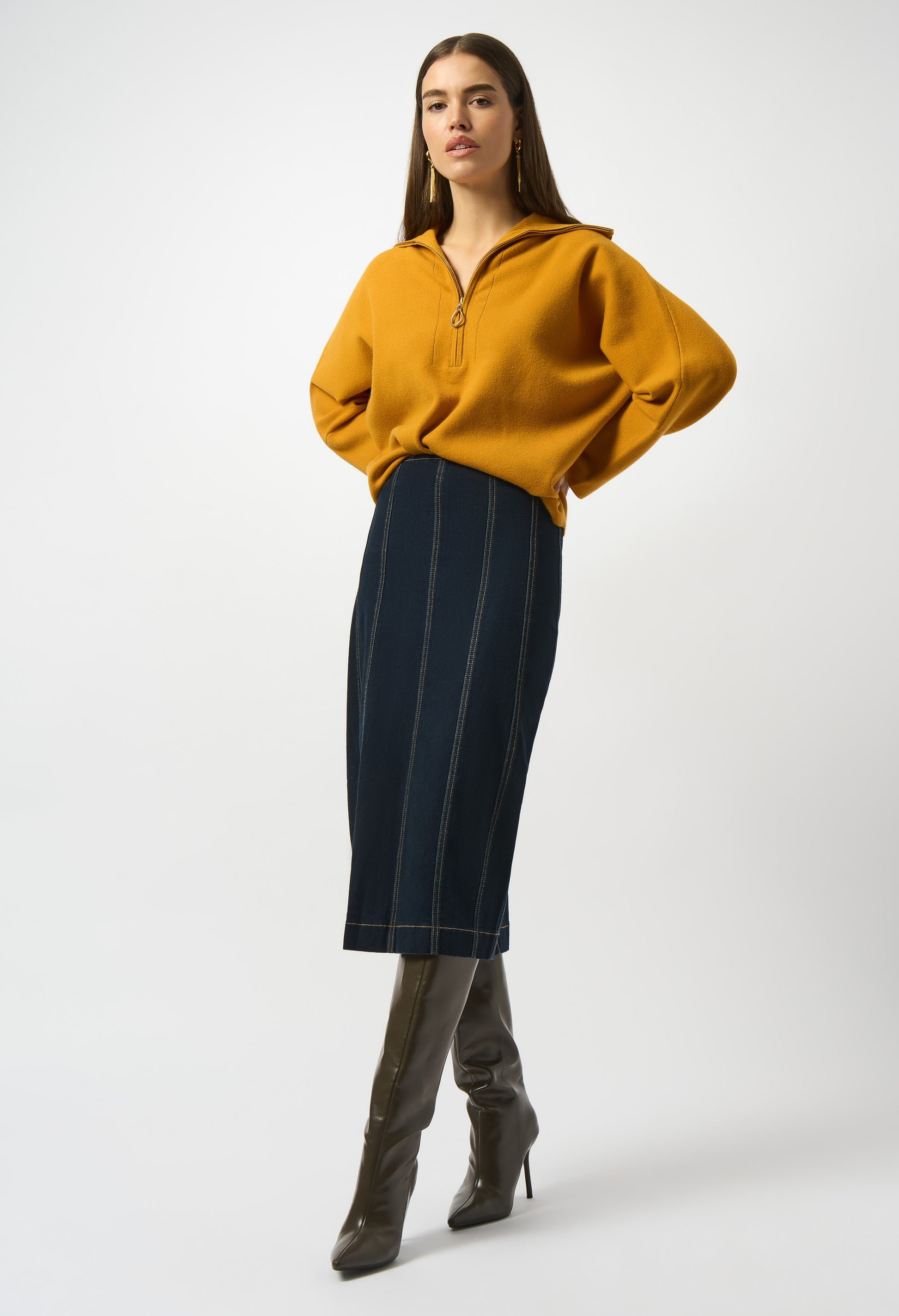 Introducing the Joseph Ribkoff pencil skirt, perfect for both casual and office occasions. This mid-rise, midi-length skirt features exquisite stitch detailing and a plain pattern, effortlessly blending business and feminine styles. Experience comfort and sophistication with every wear, making it a versatile addition to your wardrobe. Outseam length: 30" (76,2 cm)