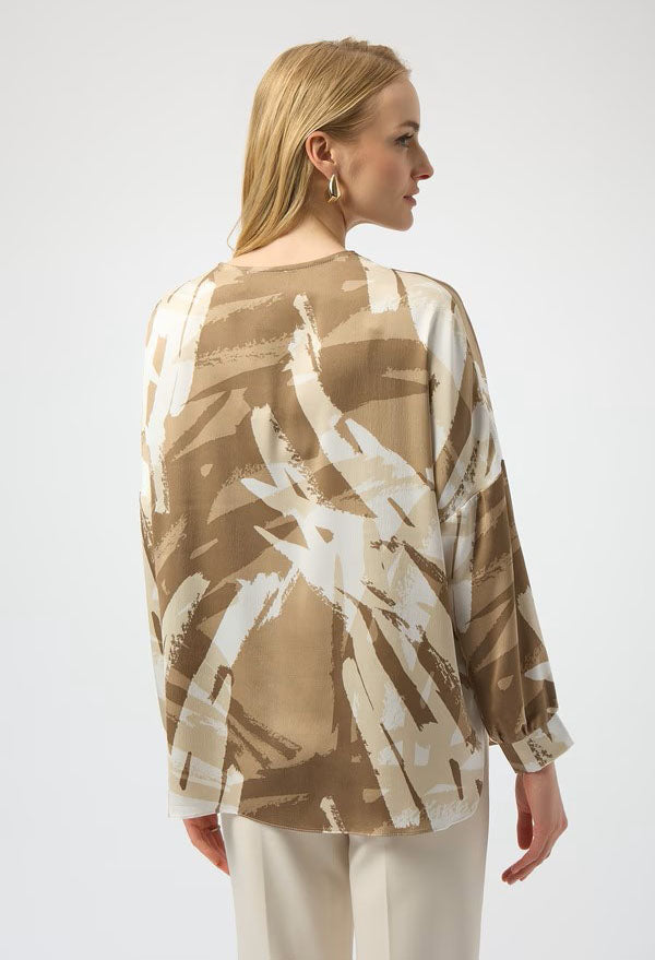 Experience the perfect blend of chic and casual with Joseph Ribkoff's relaxed fit, hip-length top. Featuring a v-neck and long, straight sleeves with zipper and ring detail, this piece is ideal for both casual and office settings. The abstract pattern adds a touch of modern sophistication, making it a versatile addition to any wardrobe.