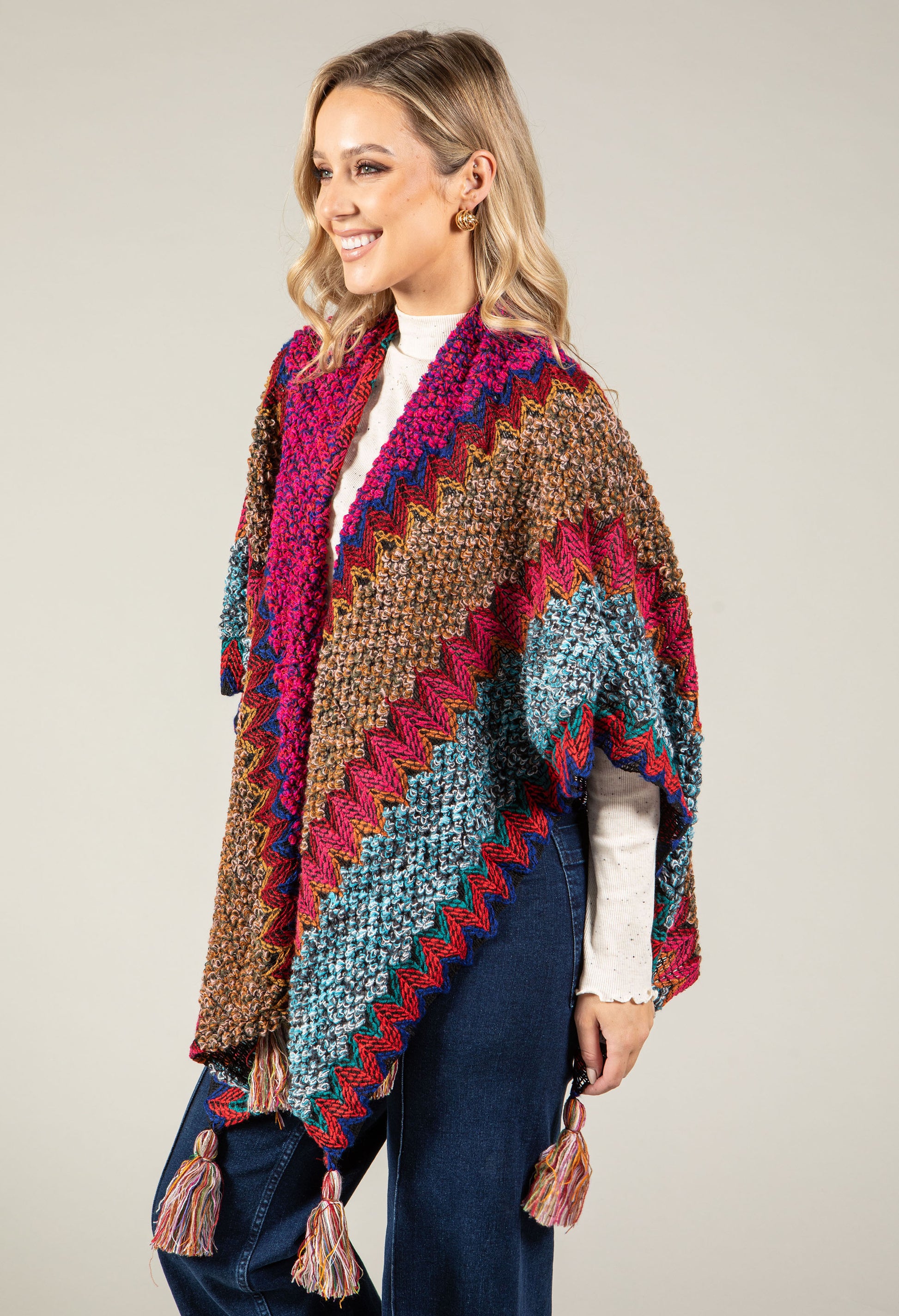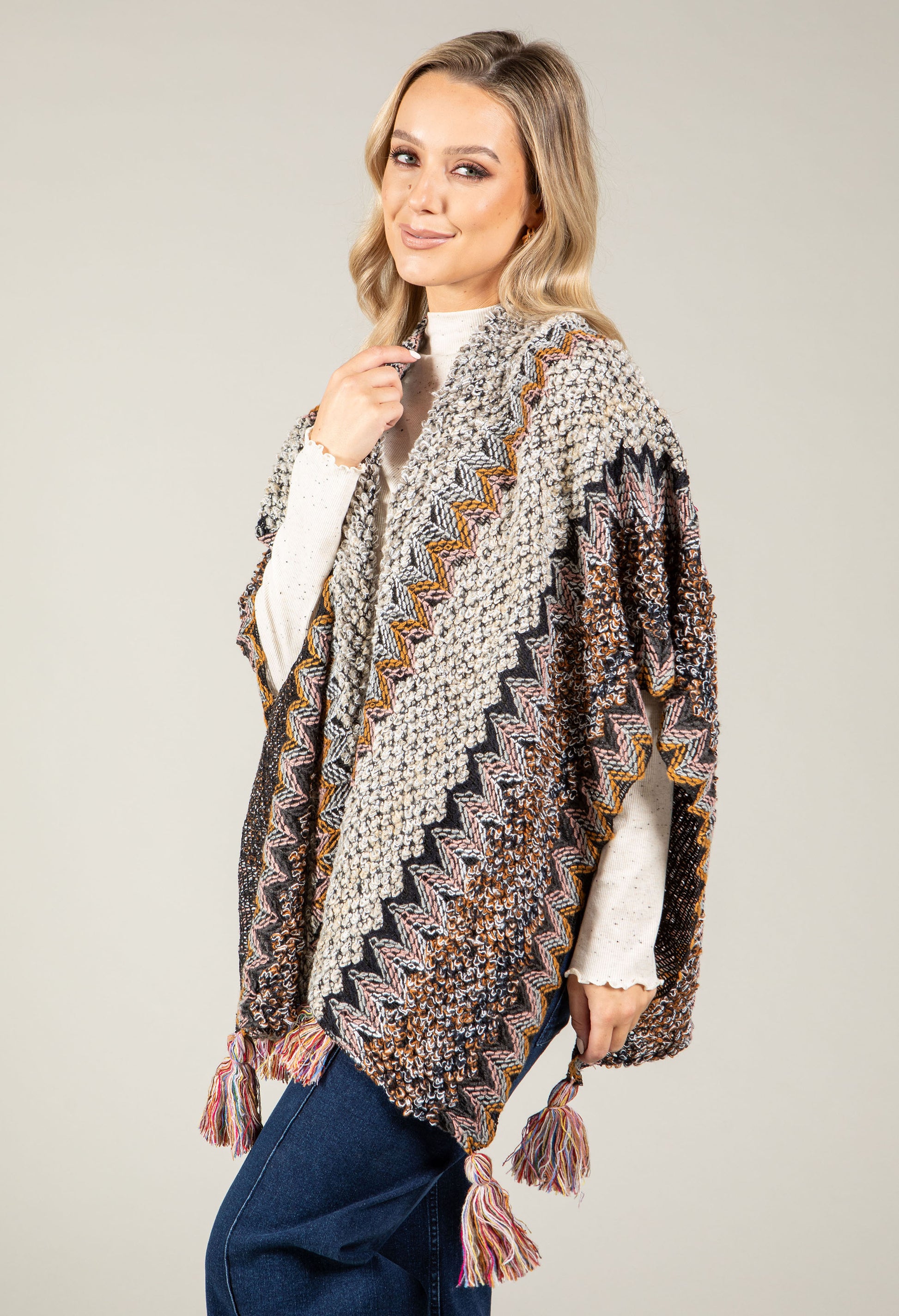 This sleeveless poncho features tassel accents and an open front, showcasing a vintage-inspired design with a scalloped hem. Available in a free size for versatile wear.
