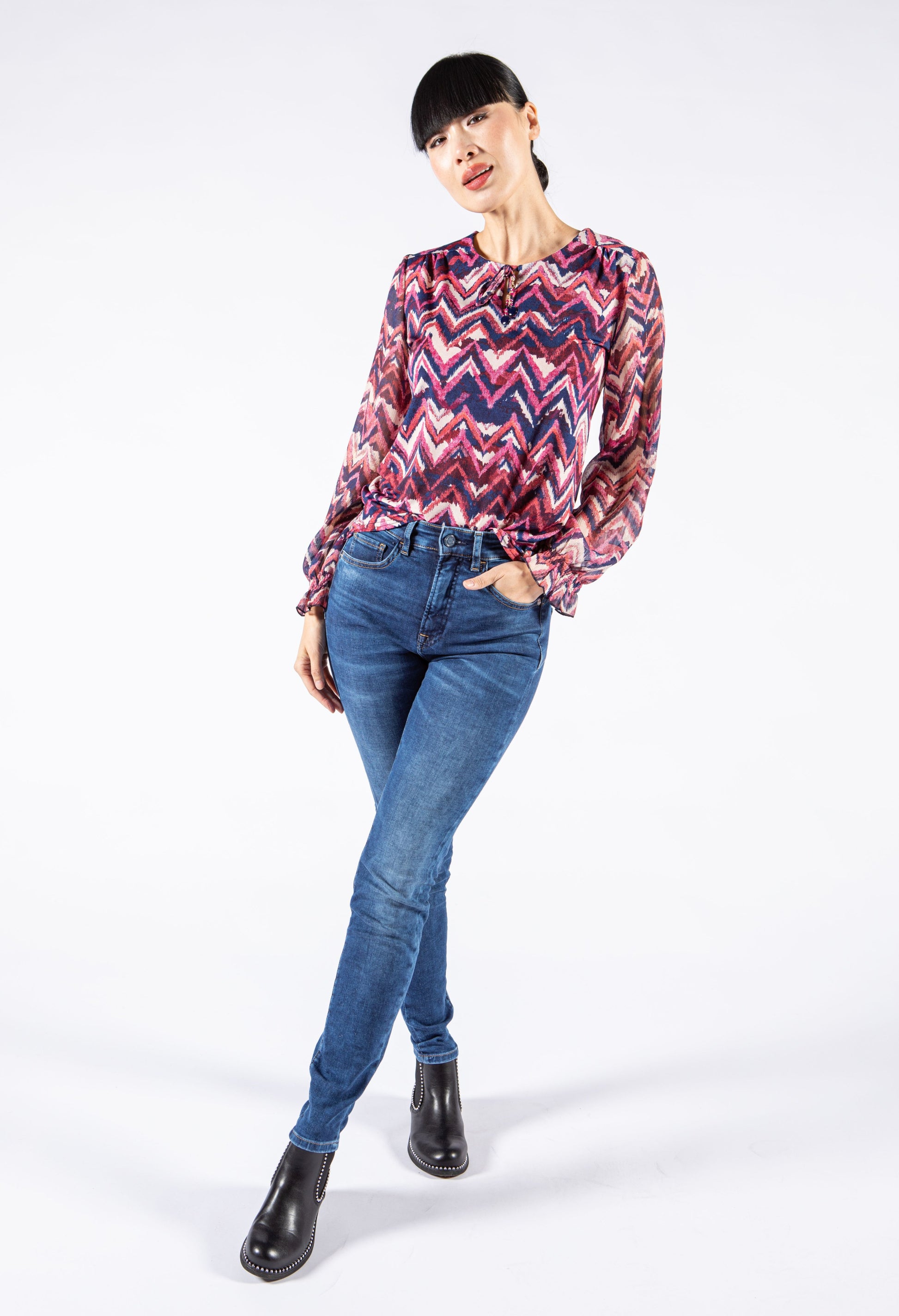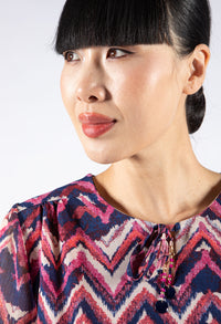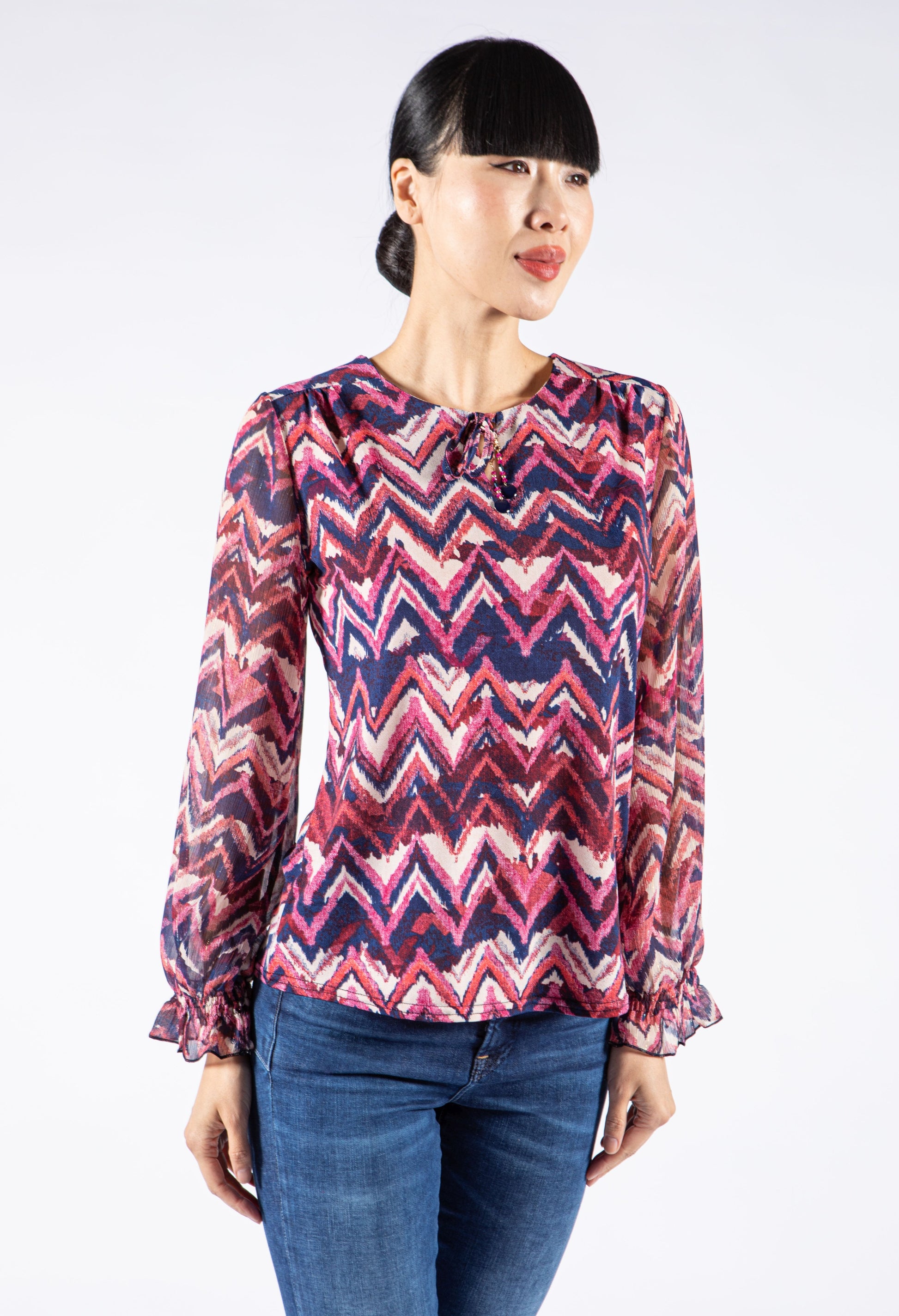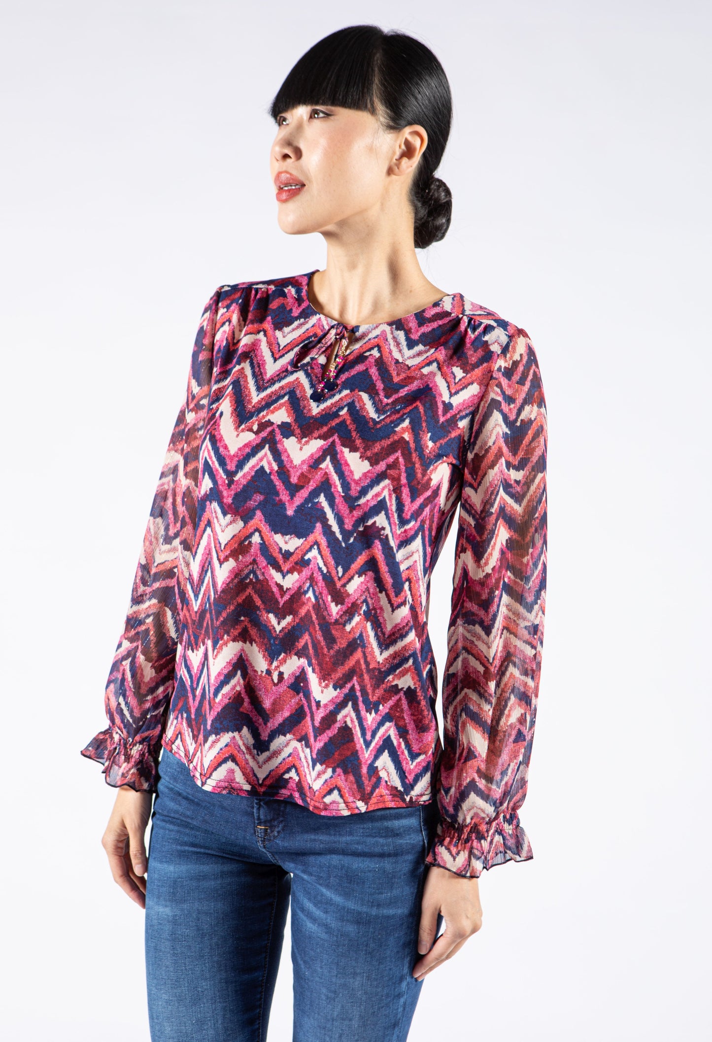 • Tie Neckline • Long Sleeves • Smocking Cuffs • Straight Hemline • Regular Fit • Light, Breathable Material • Model is 5’ 10” and wears a size 10