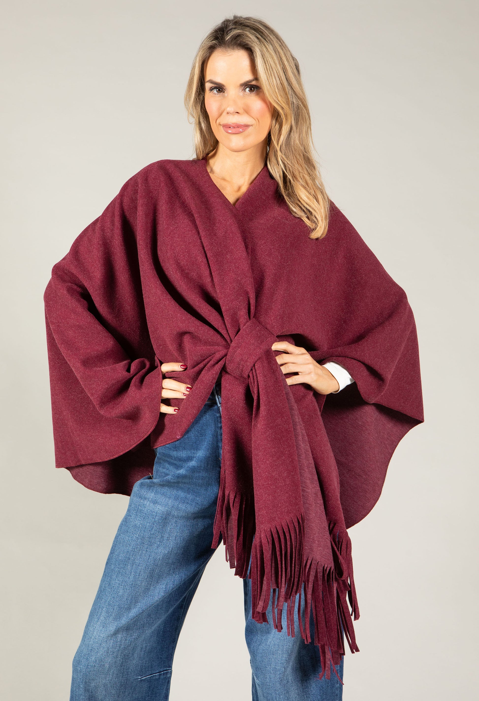 Embrace effortless elegance with this versatile wrap cape jacket, designed to flatter a range of sizes from UK10-16. Flowing bell sleeves and charming fringe trim add movement and texture, while the wrap silhouette creates a flattering, adjustable fit that works beautifully with any outfit.