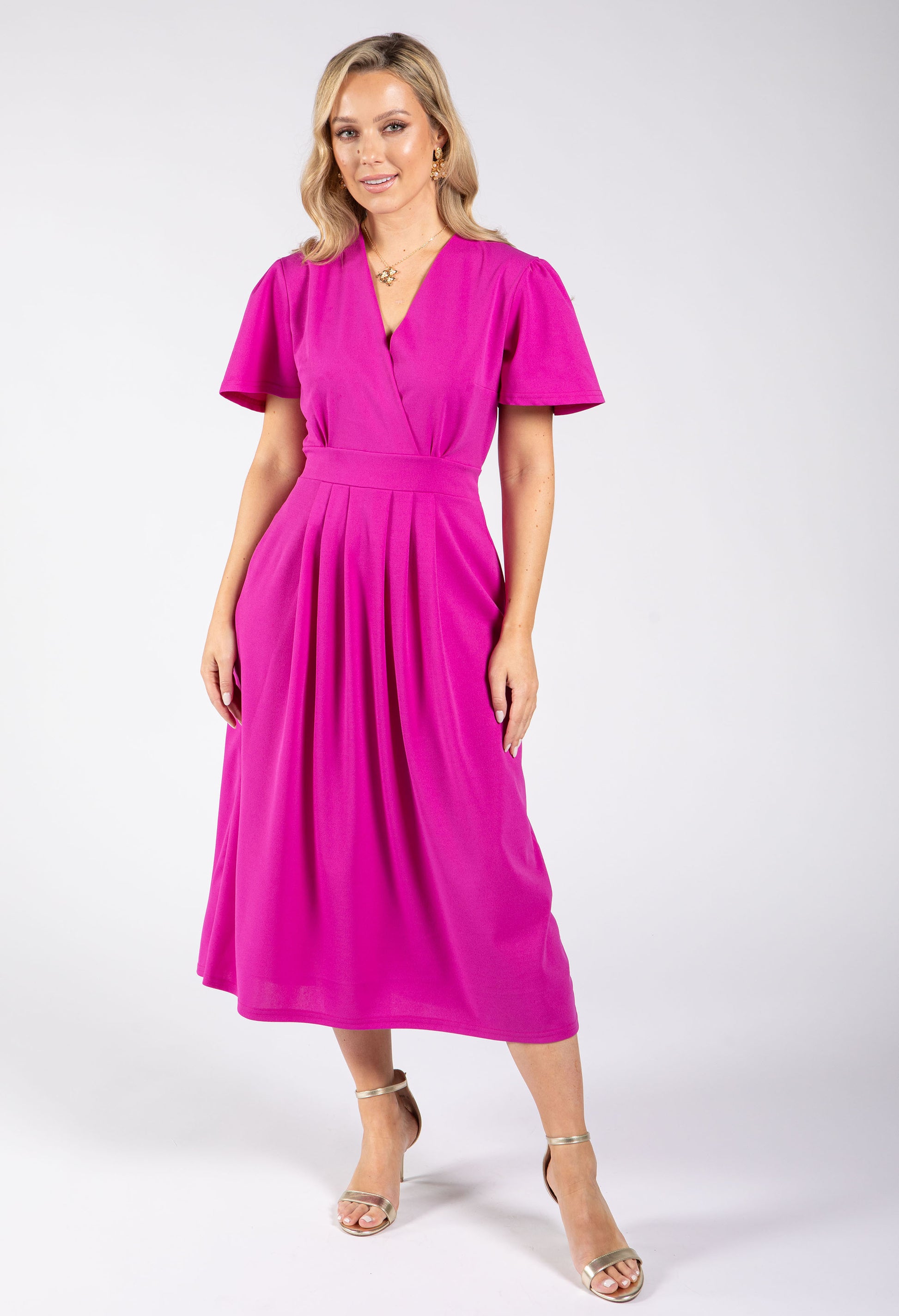 Effortlessly elegant, this midi dress features a flattering faux wrap bodice with a defined tie waist belt that cinches beautifully. The romantic angel sleeves and V-neckline create a graceful silhouette, while the lined construction ensures comfort and confidence. Perfect for occasions where you want to look polished without trying too hard.