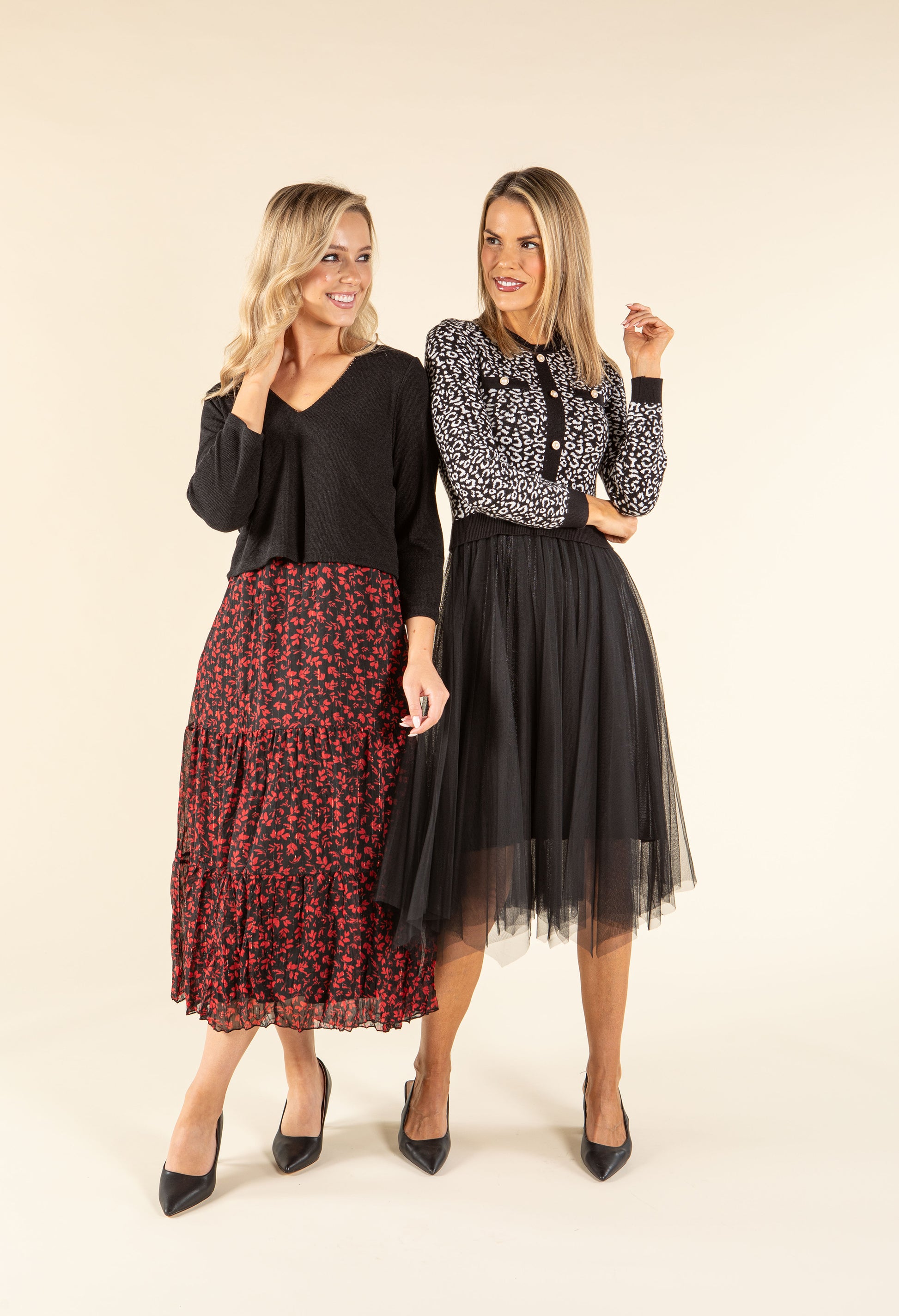This sophisticated midi dress features a versatile 2-in-1 design combining dress and jumper styles. It offers a V-neckline, 3/4 length sleeves, and is fully lined, adorned with an elegant floral print.