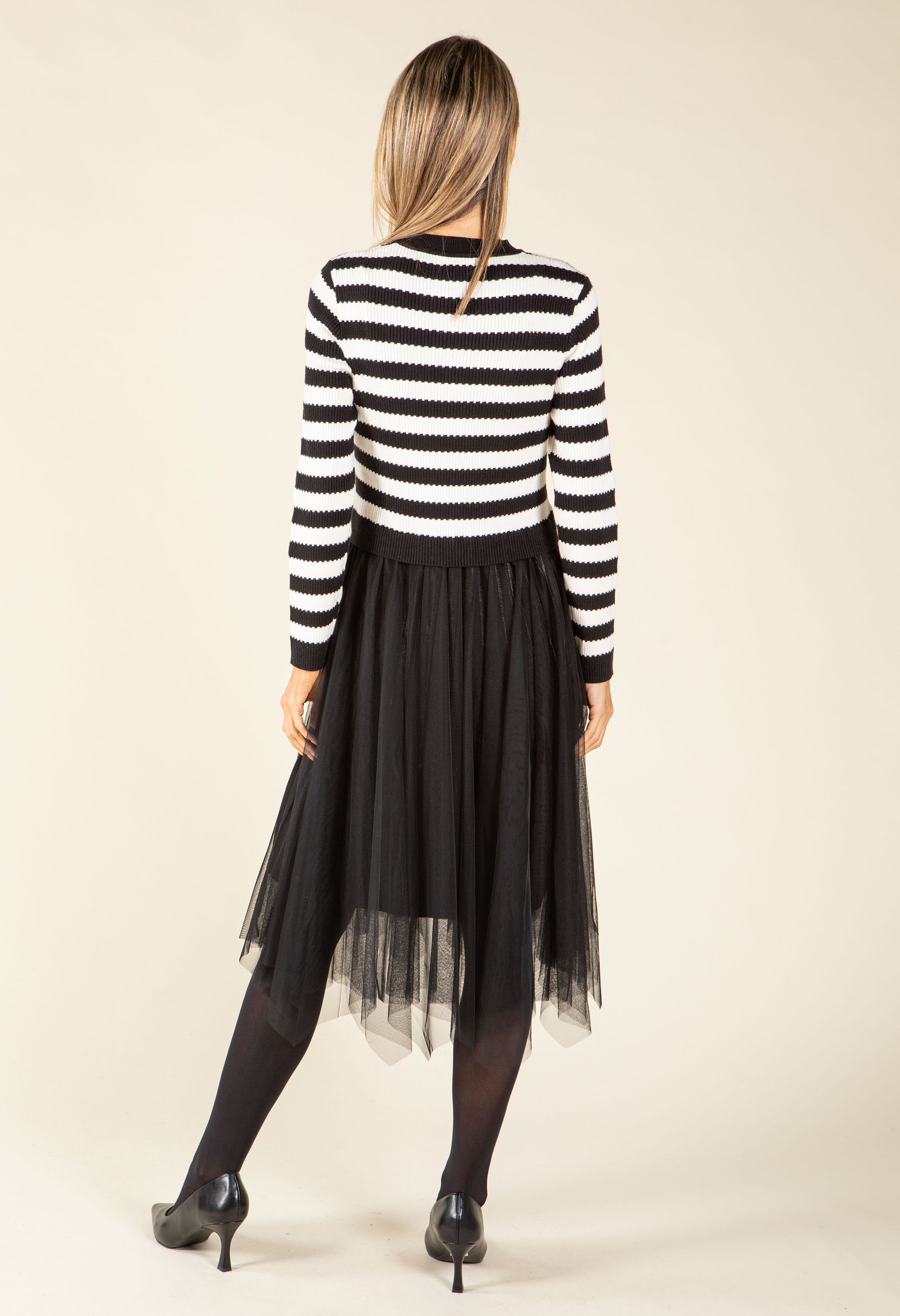 This sophisticated 2-in-1 dress combines a tulle skirt with an illusion cardigan. The cardigan features long sleeves, a round neckline, and a stripe pattern crafted from stretch fabric, accented with a faux button-up and faux front pockets. The skirt is midi-length, made from layered tulle, and fully lined for a refined finish.