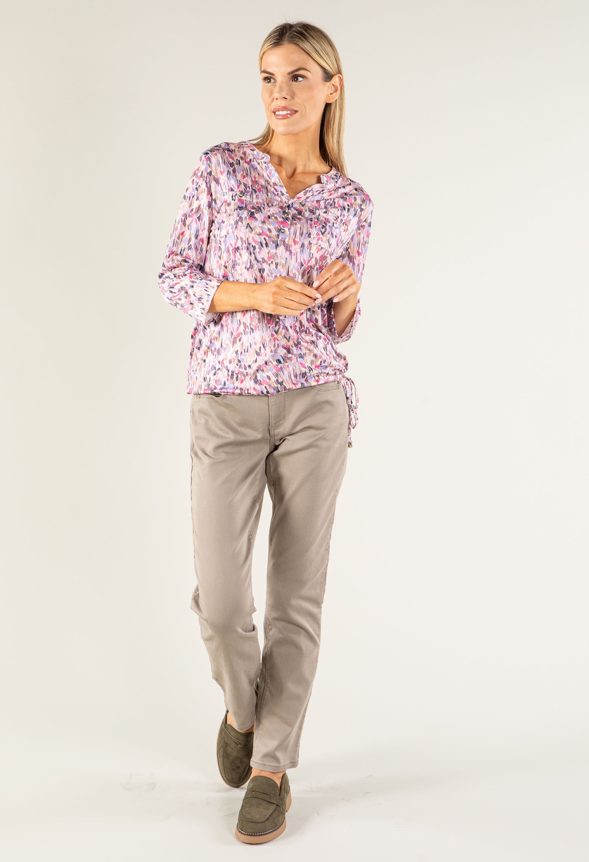 This Abstract Front Pocket Top features a flattering V-neckline and front pockets. It offers a drawstring hemline and 3/4 length sleeves for a tailored fit. Made from a stretch material with a faux button-up closure, it is decorated with a bold abstract print for a stylish edge.