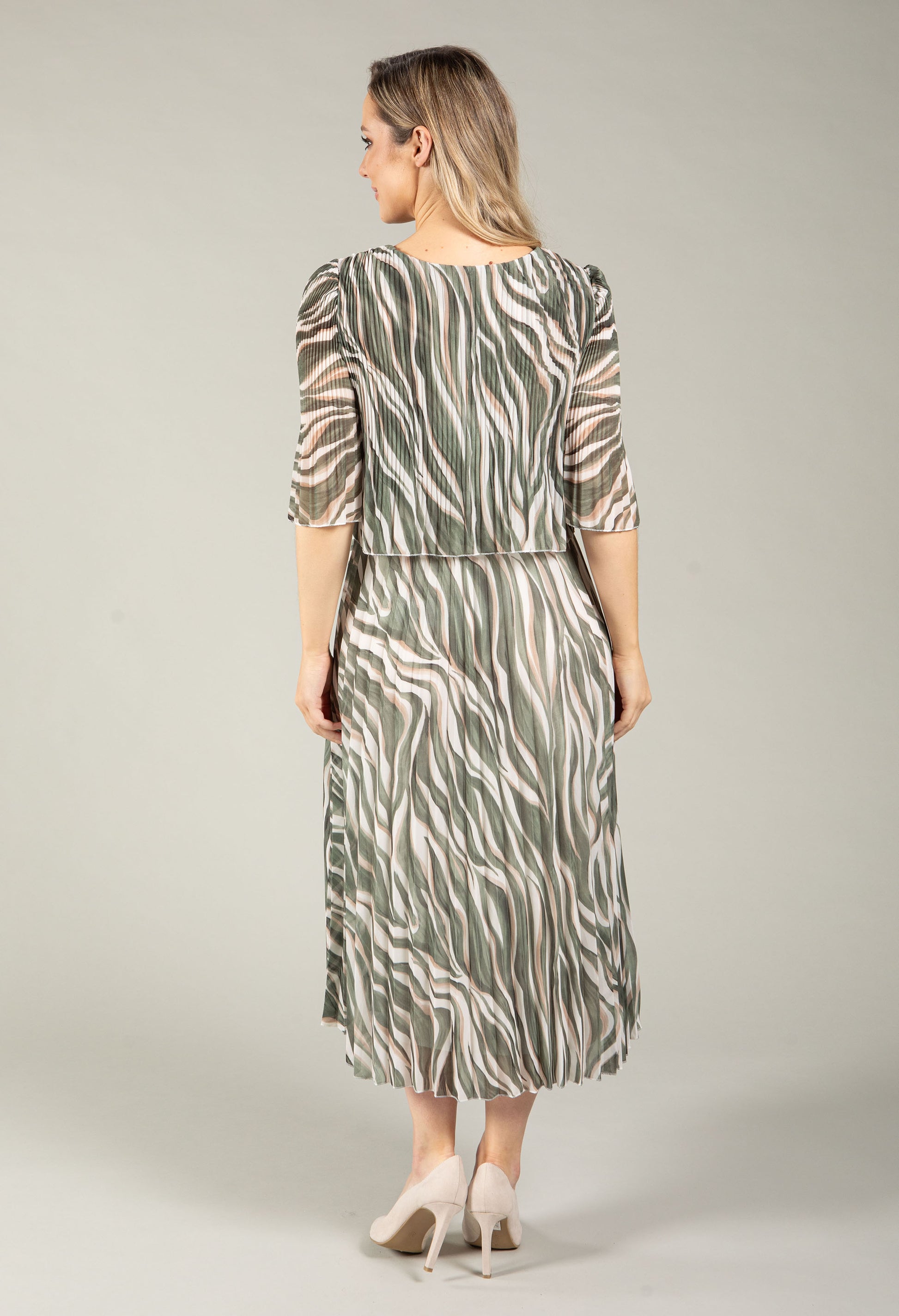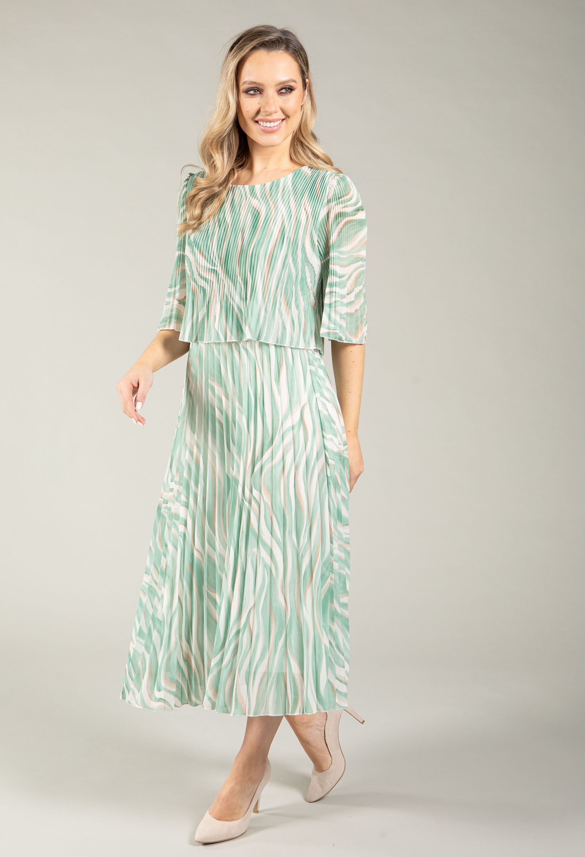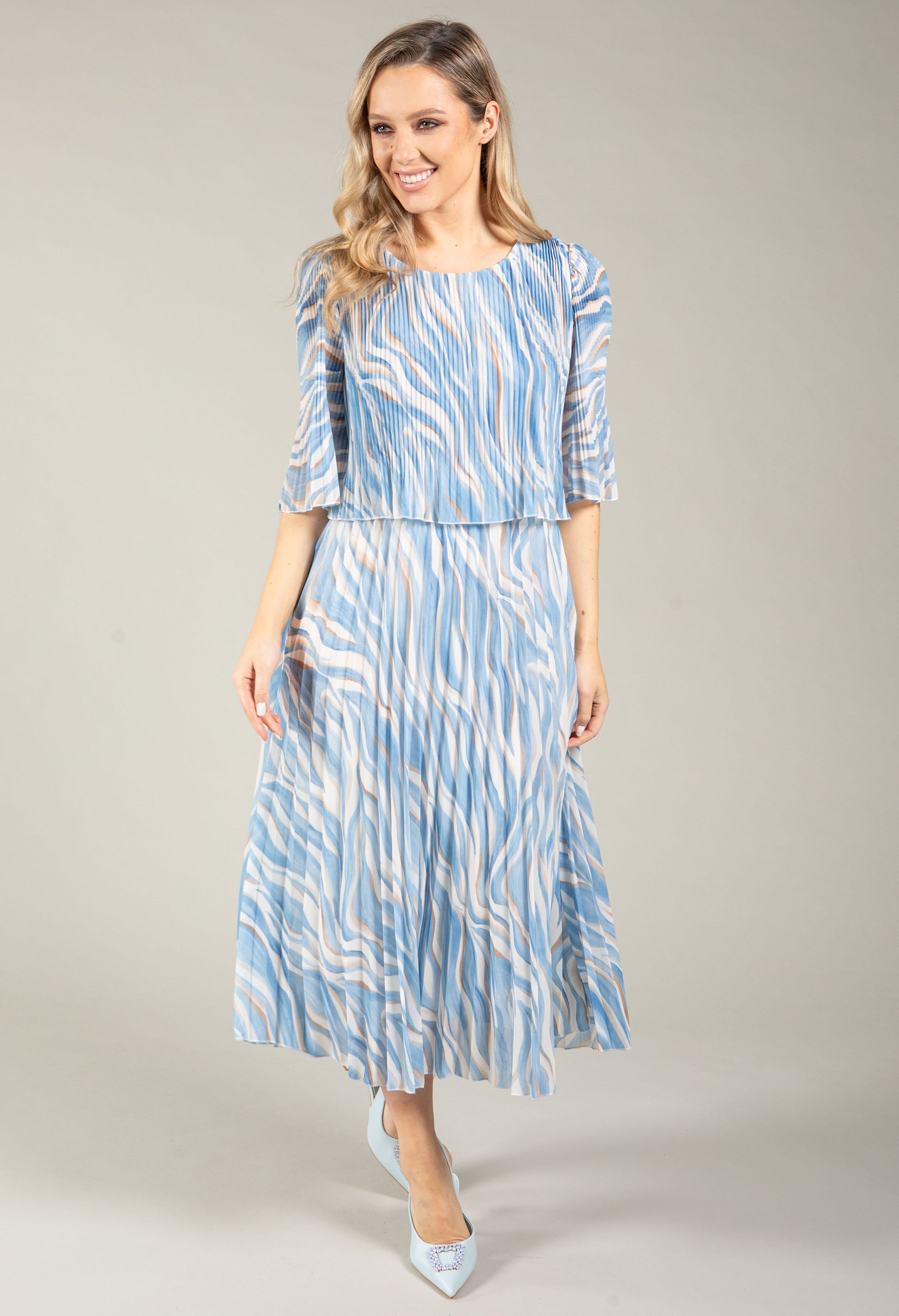 Slip into effortless style with this pop over dress featuring a flattering Round neckline and half sleeves. The plissé pleated fabric creates beautiful movement, while the elasticated waistband offers comfortable, adjustable fit. Fully lined with a midi length silhouette, it's finished with a striking abstract print perfect for any occasion.